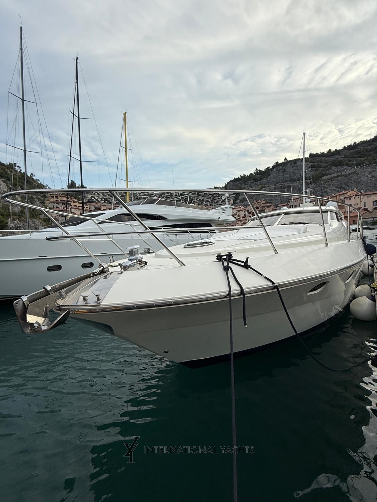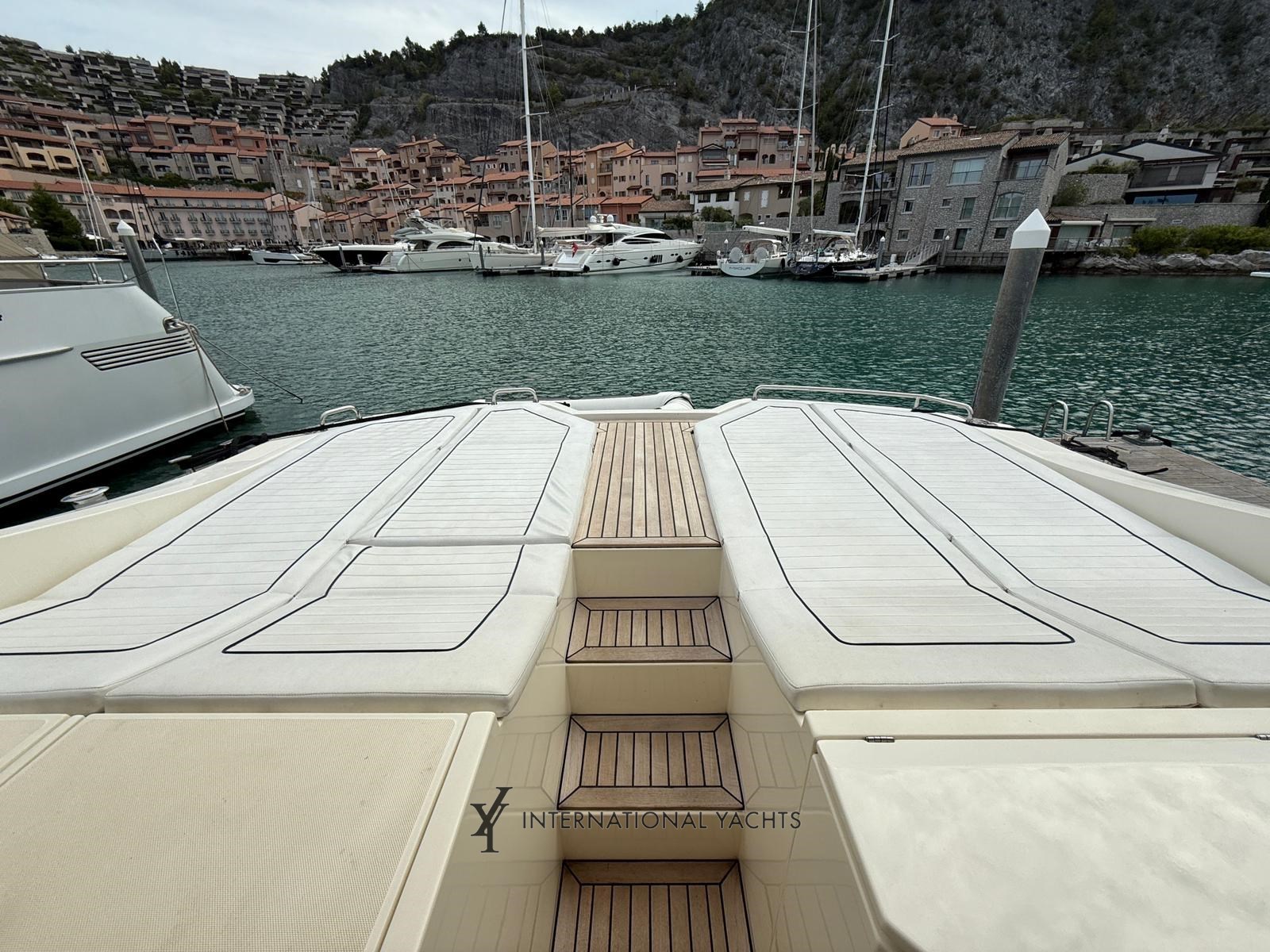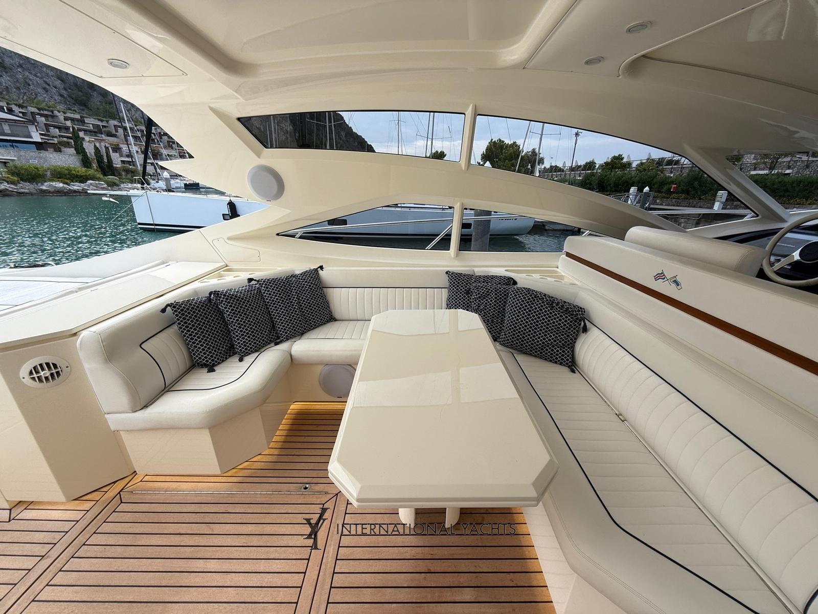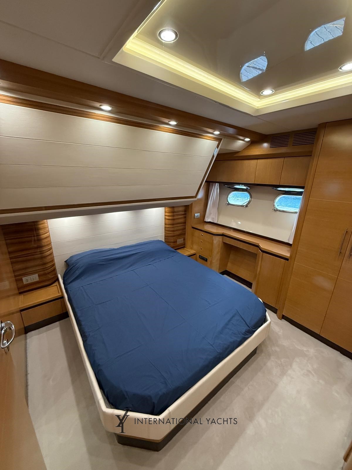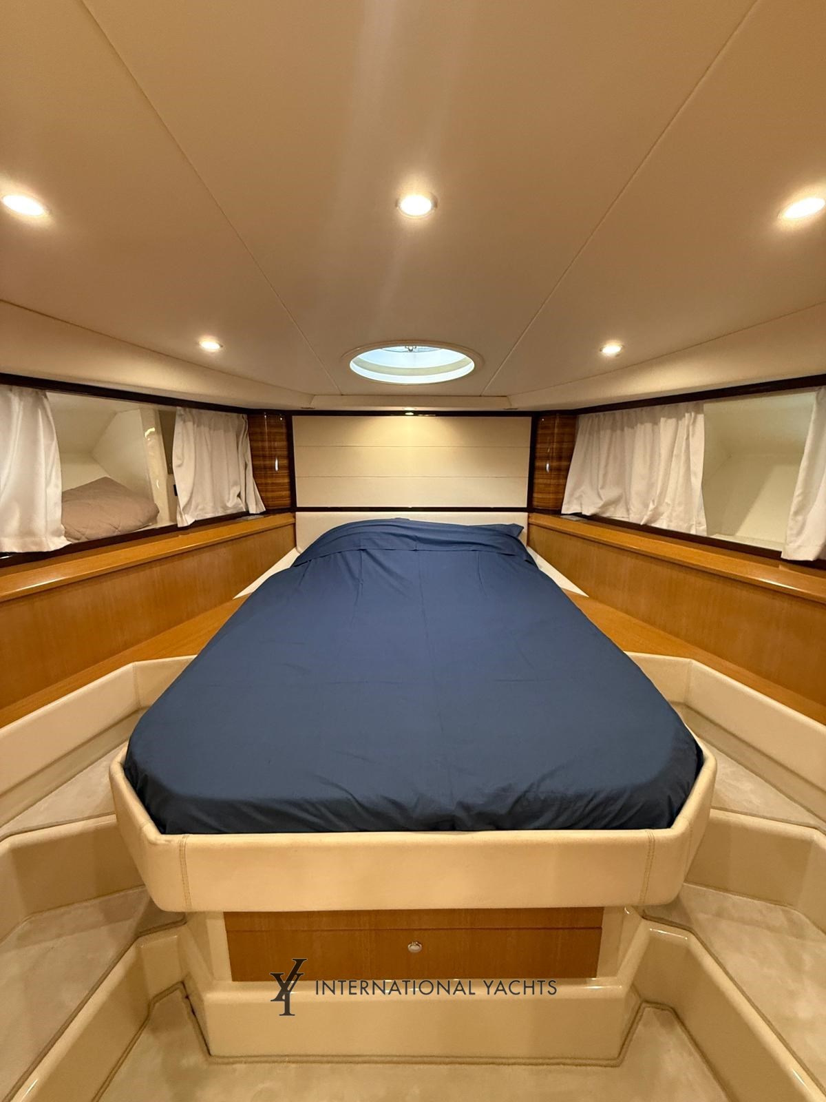 n. 4 Kabinen, davon n. 1 Master-Kabine mit Doppelbett und eigenem Bad mittschiffs - n. 1 VIP-Kabine mit Doppelbett und eigenem Bad im Bug - n. 1 Gästekabine mit zwei Einzelbetten achtern mit eigenem Bad - n. 1 Crew-Kabine achtern mit reserviertem Service - große Essecke mit L-förmigem Sofa und einziehbarer ausgestatteter Kombüse - Hardtop - Eicheninterieur - Teppich in den Böden - Cockpit, Stufen und Teakholz-Achterplattform - Liegefläche achtern und Bug.