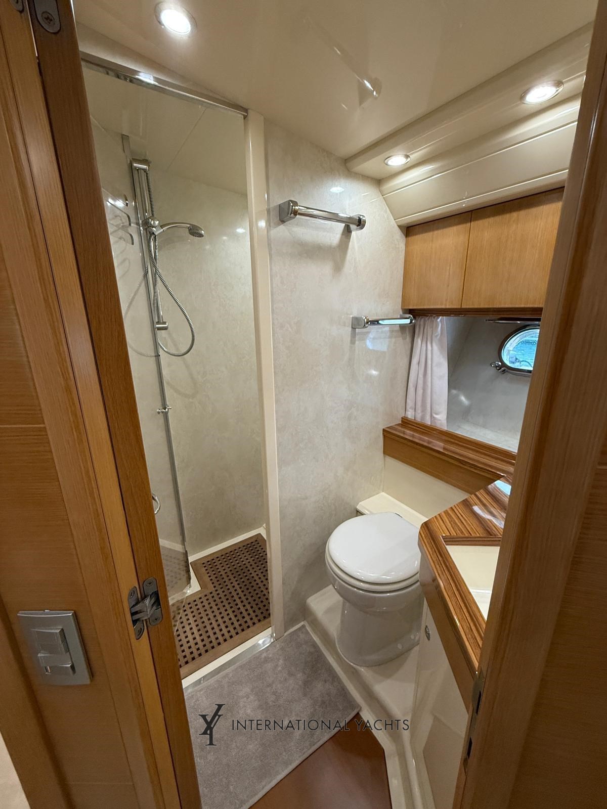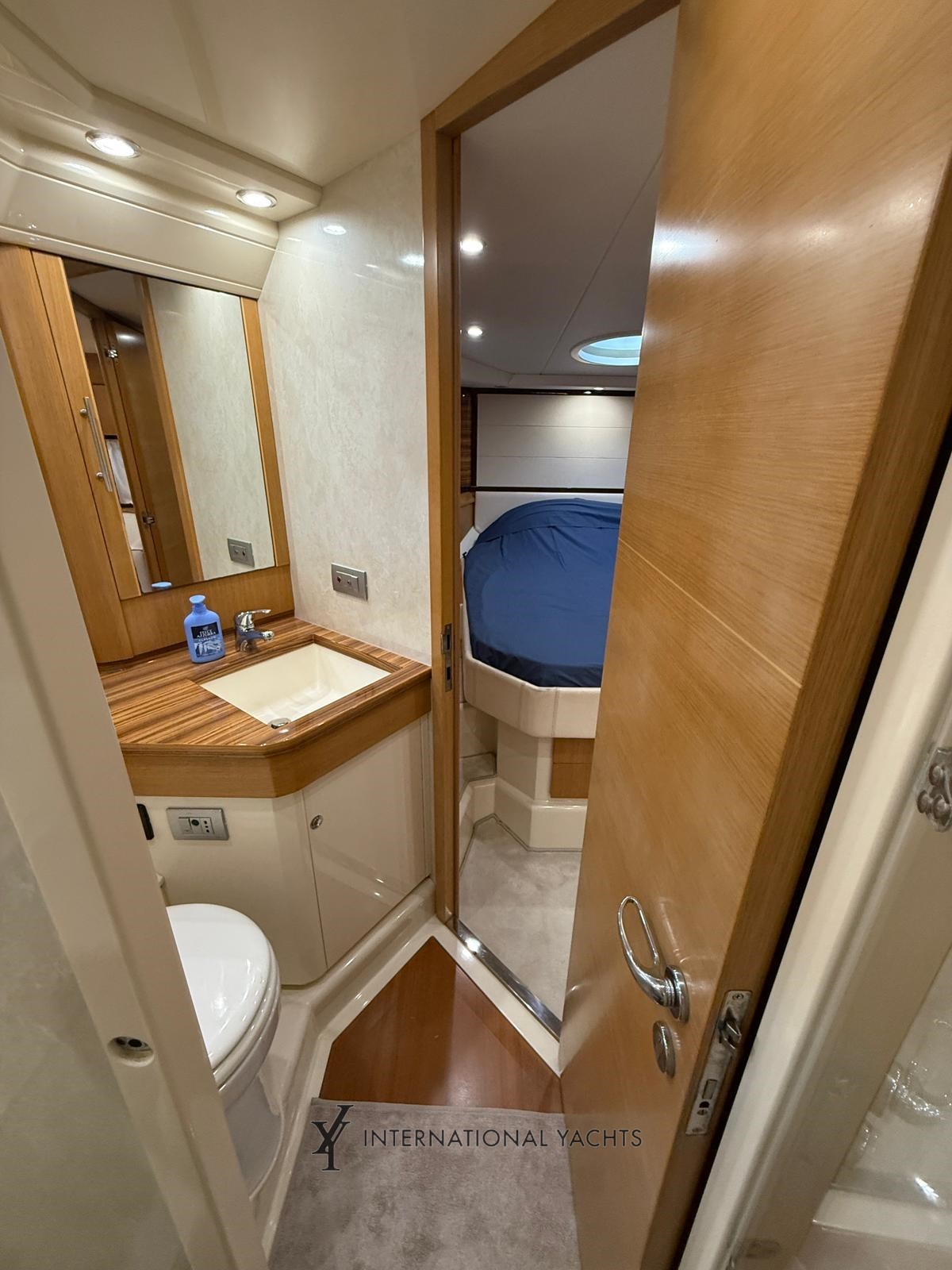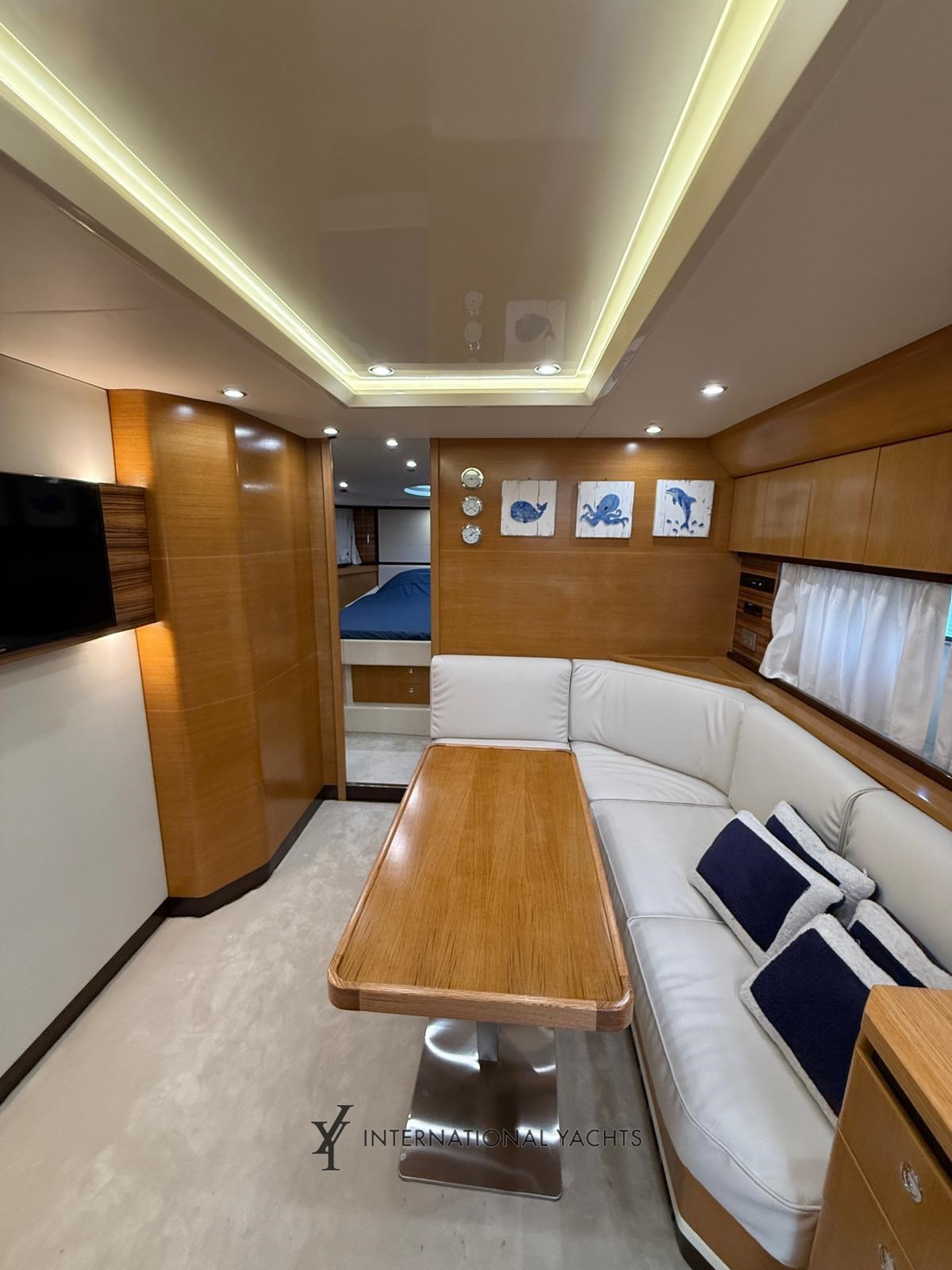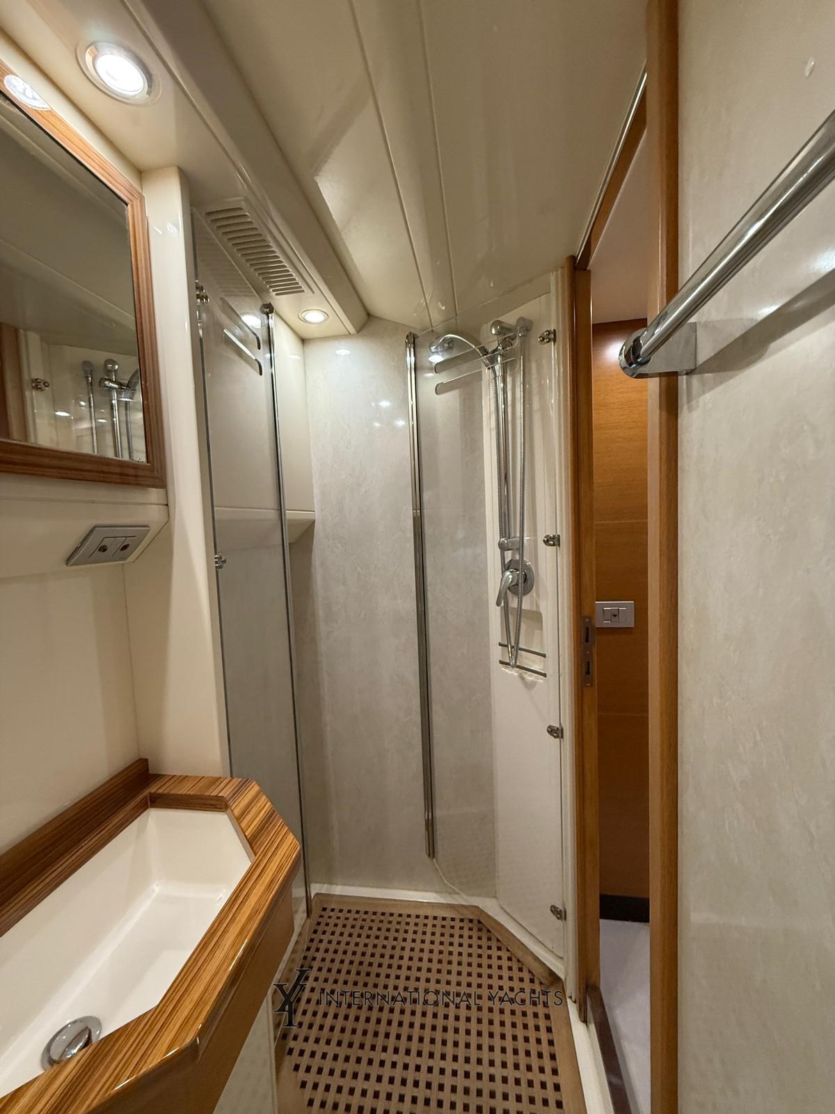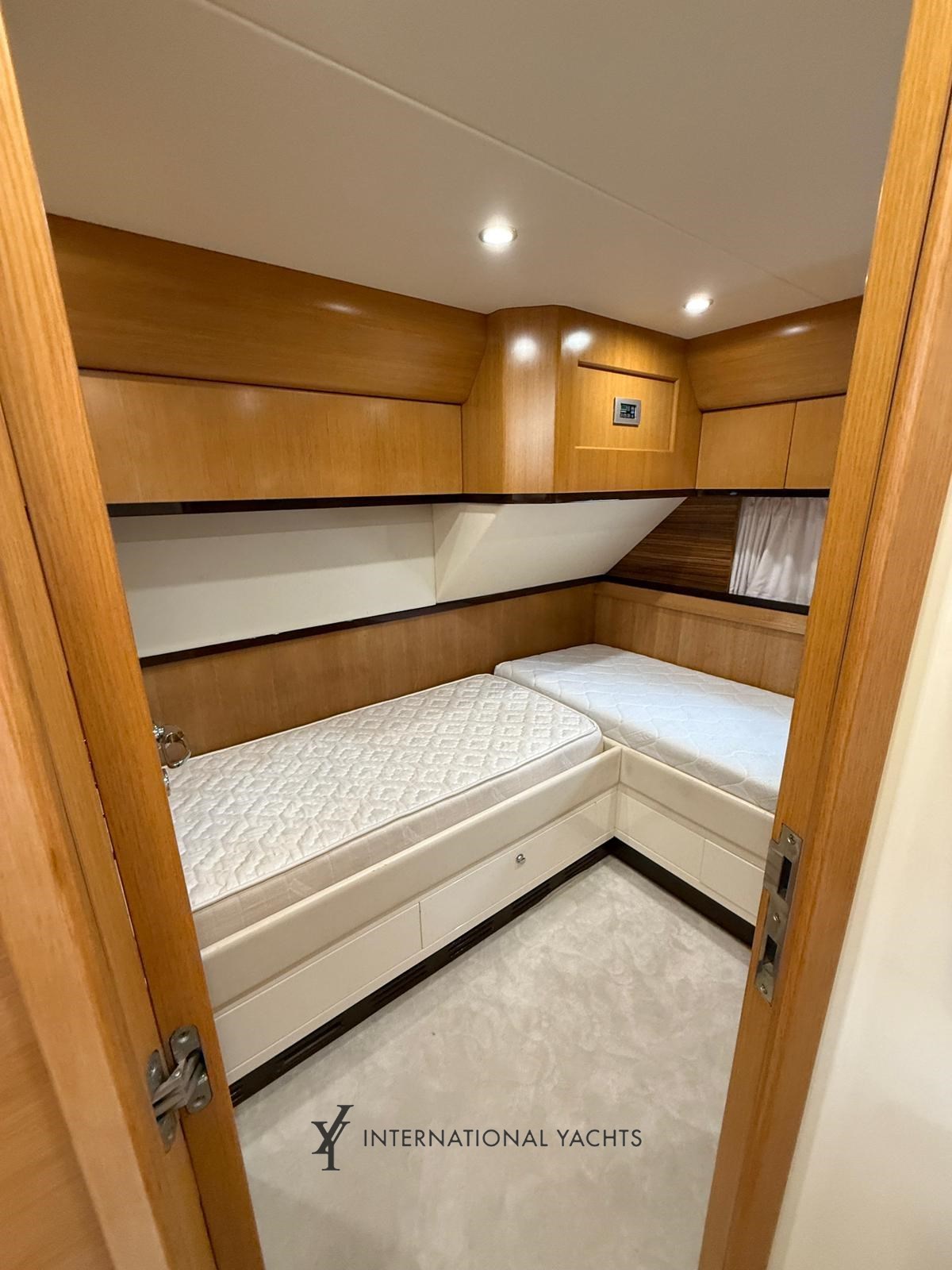 n. 4 Kabinen, davon n. 1 Master-Kabine mit Doppelbett und eigenem Bad mittschiffs - n. 1 VIP-Kabine mit Doppelbett und eigenem Bad im Bug - n. 1 Gästekabine mit zwei Einzelbetten achtern mit eigenem Bad - n. 1 Crew-Kabine achtern mit reserviertem Service - große Essecke mit L-förmigem Sofa und einziehbarer ausgestatteter Kombüse - Hardtop - Eicheninterieur - Teppich in den Böden - Cockpit, Stufen und Teakholz-Achterplattform - Liegefläche achtern und Bug.