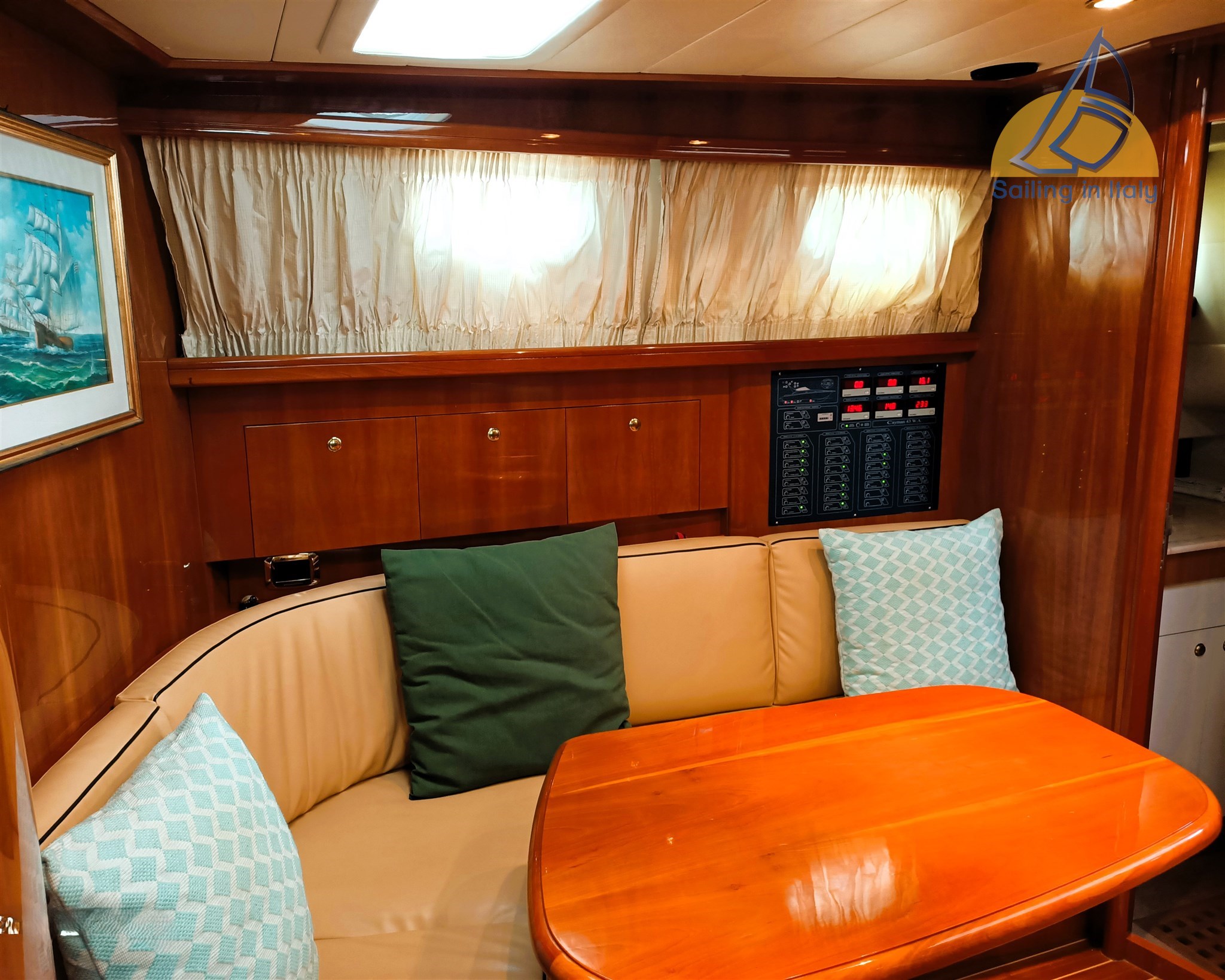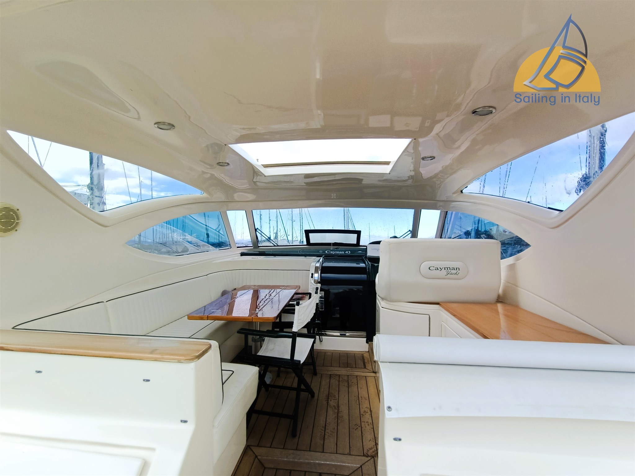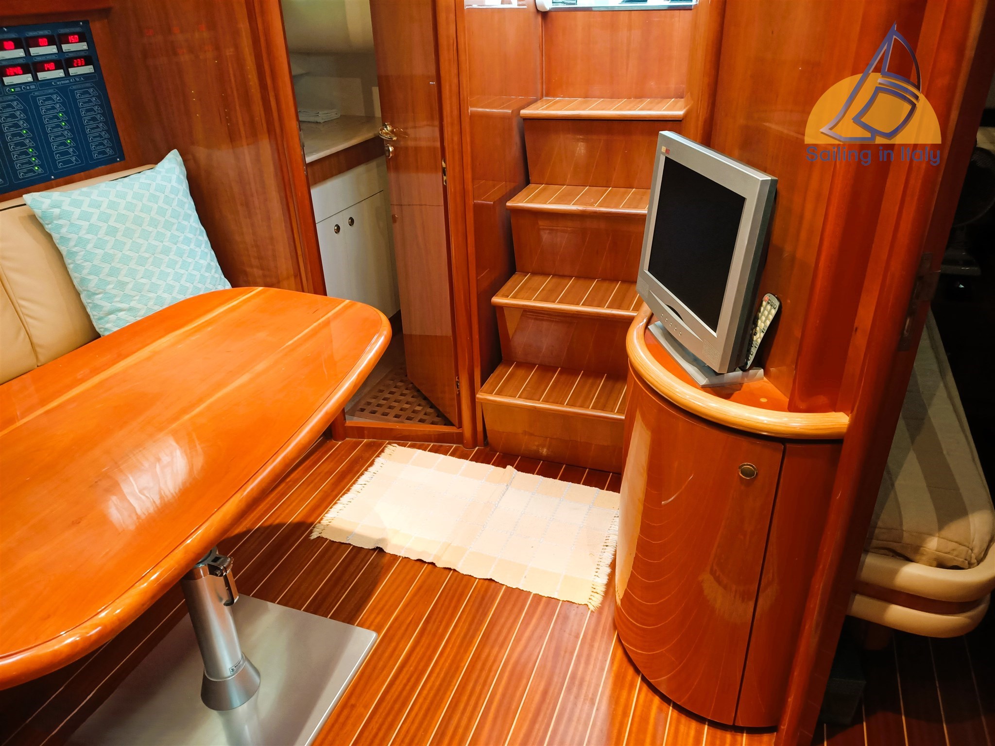 Stereo Fusion, Fernseher, Innen-/Außenlautsprechersystem; Neue komplette Kissen, Cockpitbezug, Bootsbezug; Feines Holzinterieur, heller Saloon mit Cabrio-Sitzbereich