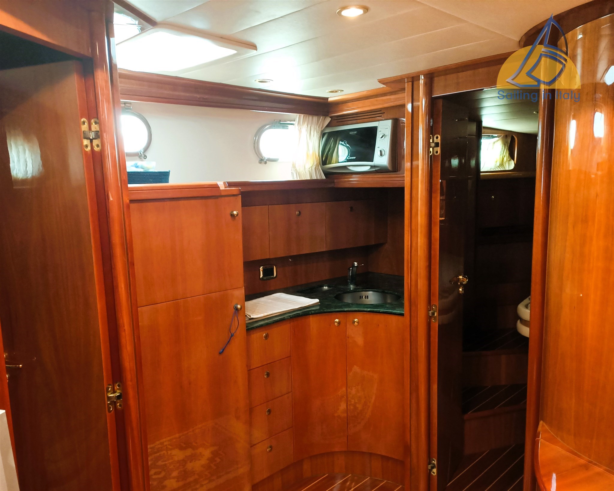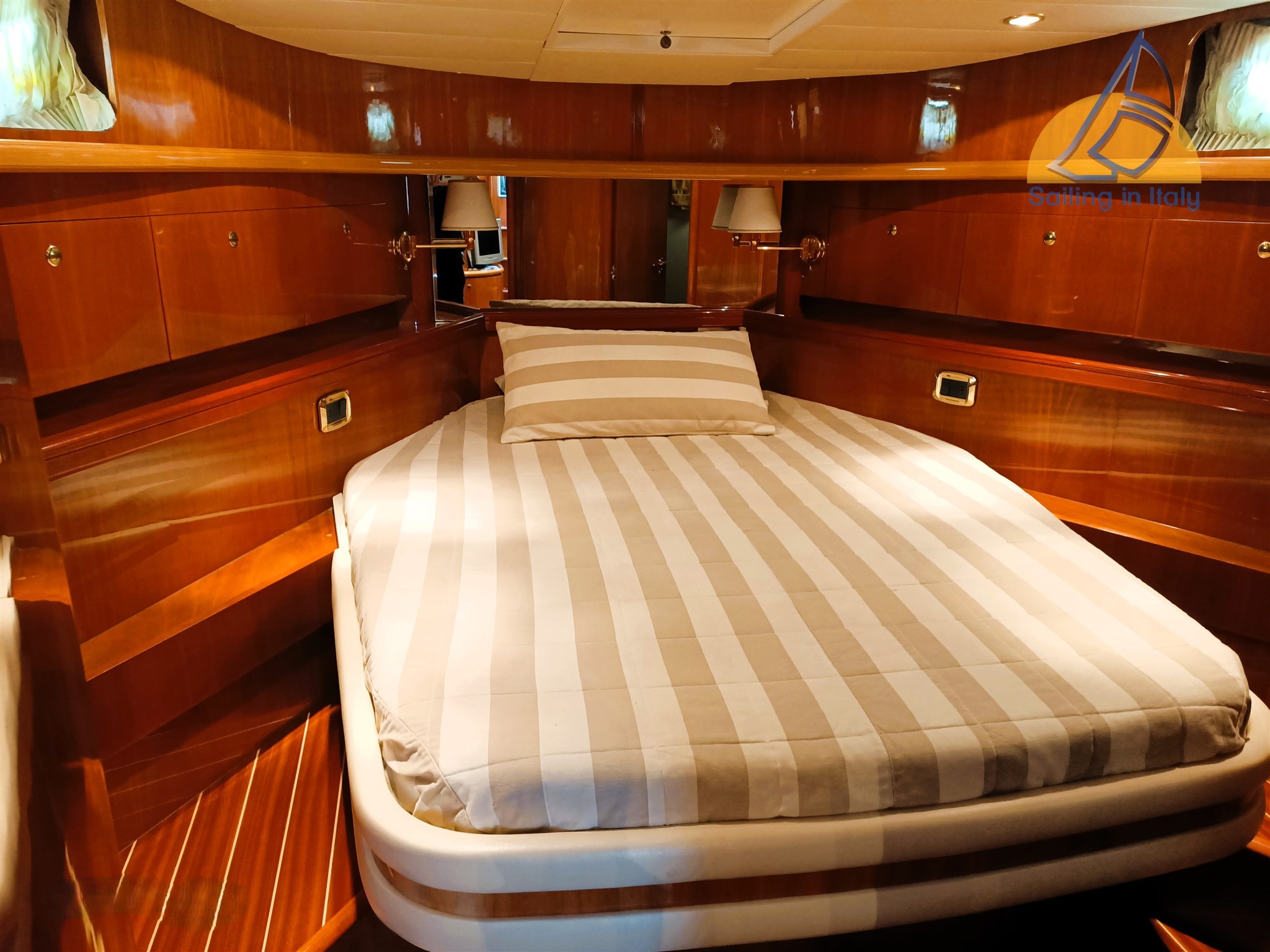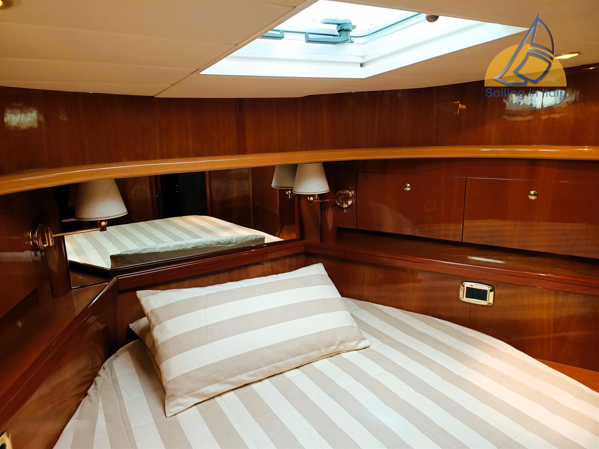 Stereo Fusion, Fernseher, Innen-/Außenlautsprechersystem; Neue komplette Kissen, Cockpitbezug, Bootsbezug; Feines Holzinterieur, heller Saloon mit Cabrio-Sitzbereich