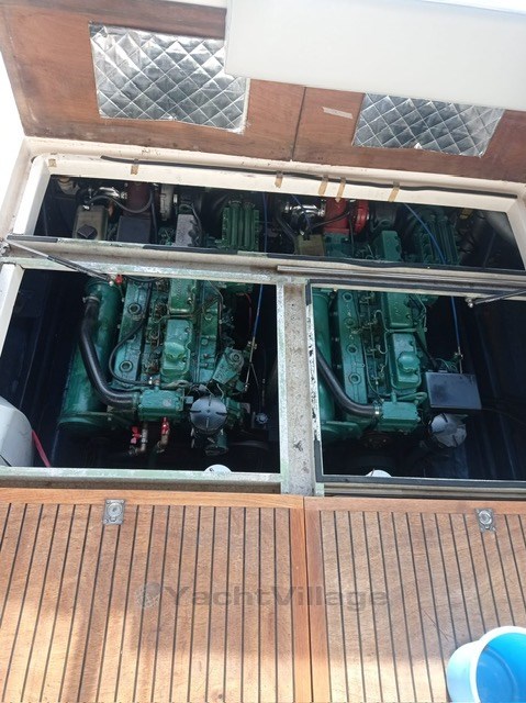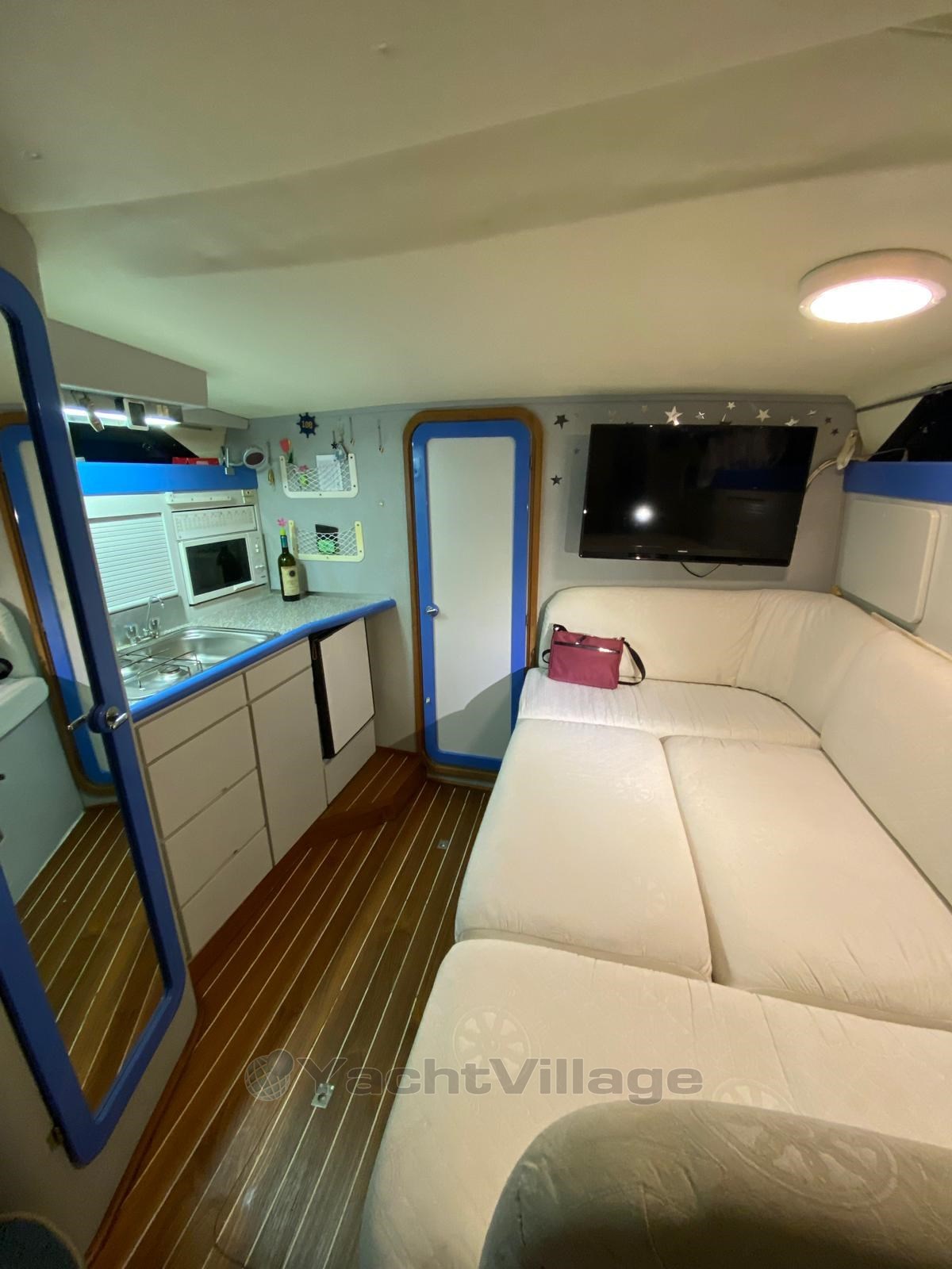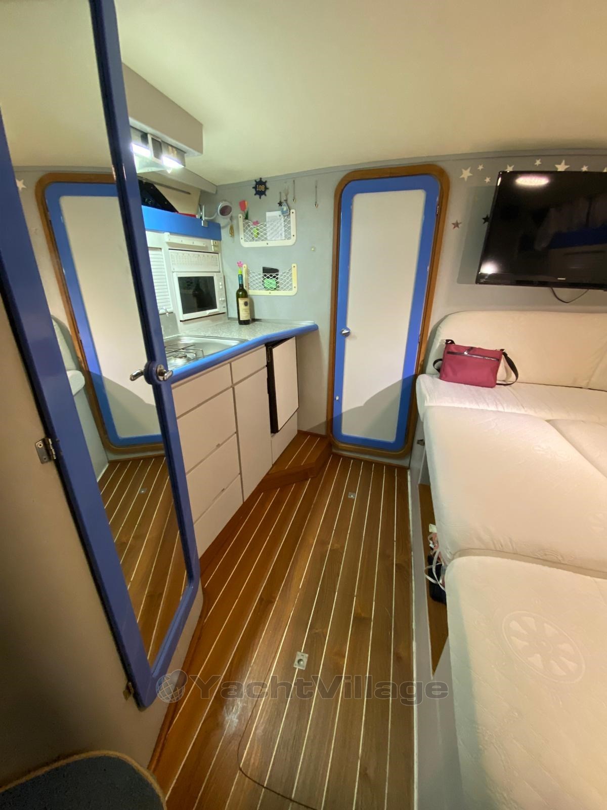 CRANCHI CRiSER JAHR 92 MIT ZWEI VOLVO PENTA EFB DIESELLOKOMOTIVEN. VORDERE HAUPTKABINE, ESSTISCH UMGEBAUT IN EIN DOPPELBETT, KOMBÜSE AUSGESTATTET MIT KÜHLSCHRANK, GASHERD, OFEN, FERNSEHER, HINTERE KABINE MIT ZWEI SITZEN.