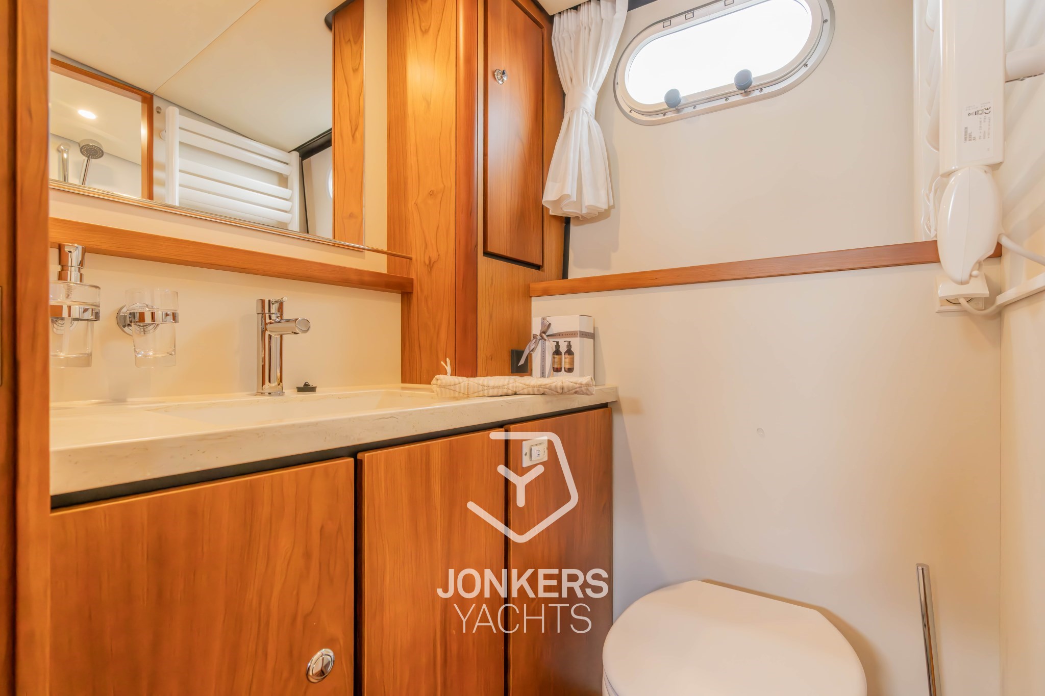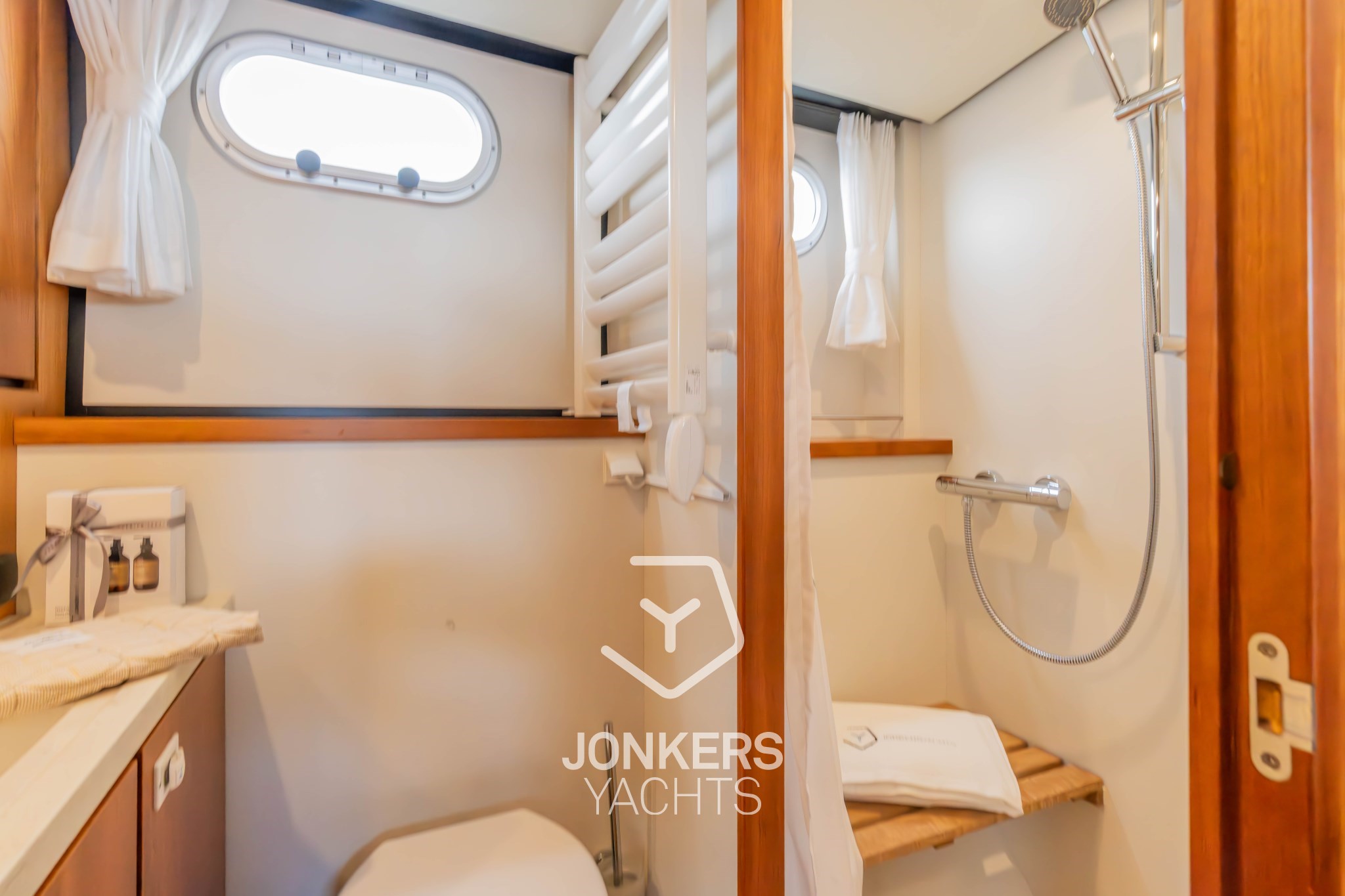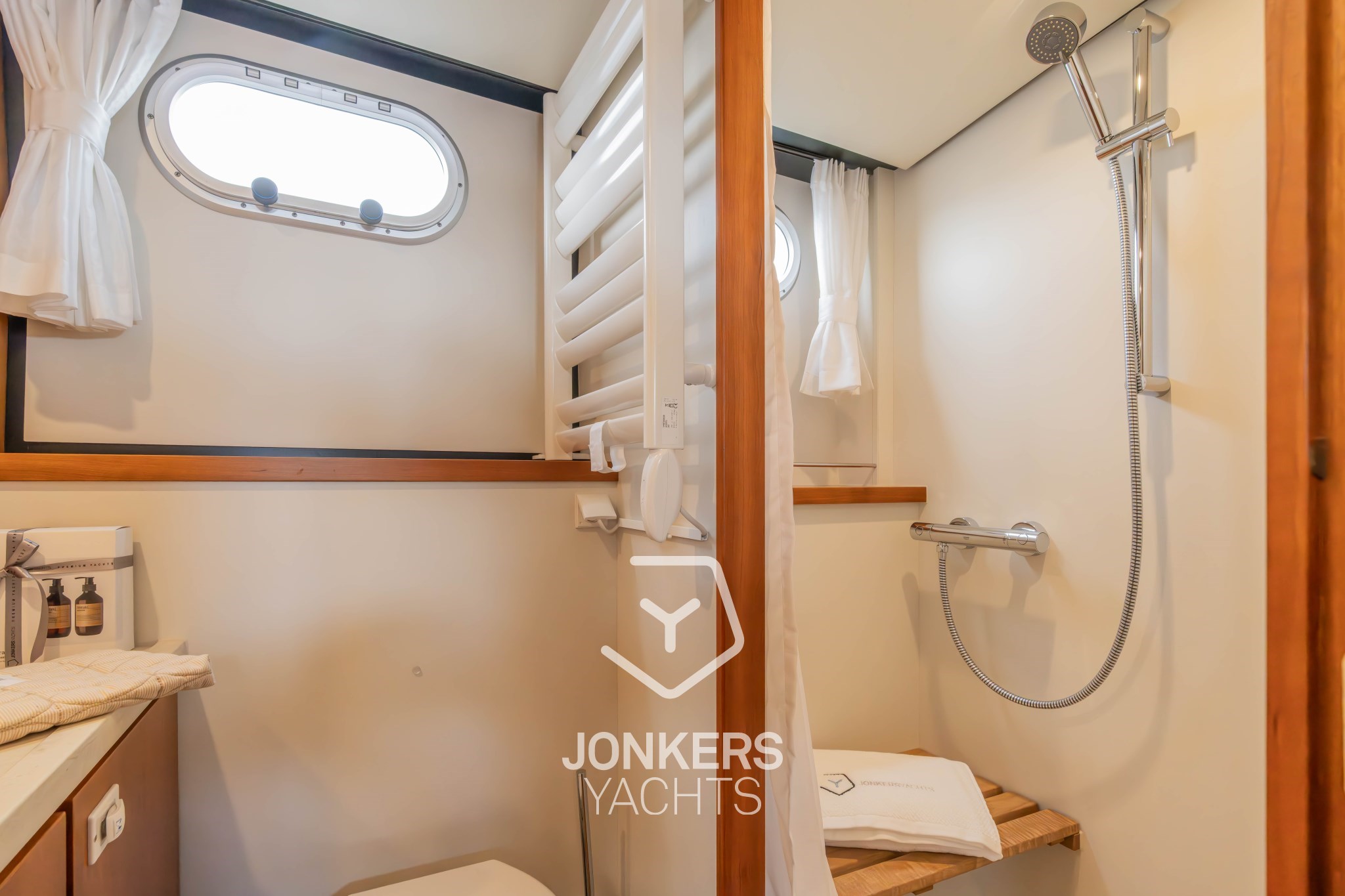 * Handtuchheizkörper im Toilettenraum in der Achterkabine, elektrisch 230V. Thermostatisch gesteuert.