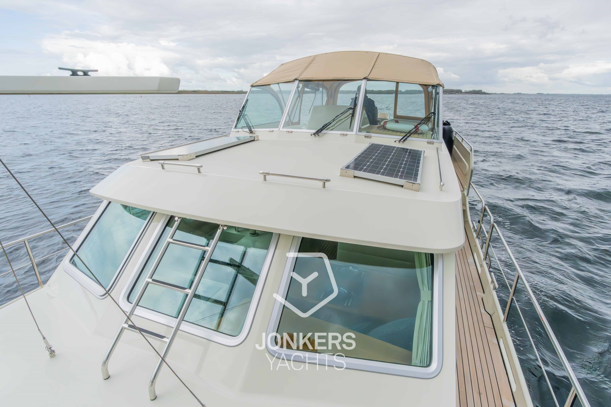 * Zugangsleiter aus Edelstahl zum Salondeck mittschiffs, abnehmbar, ausgestattet mit rutschfesten Stufen einschließlich 2 Handläufen auf dem Salondeck.