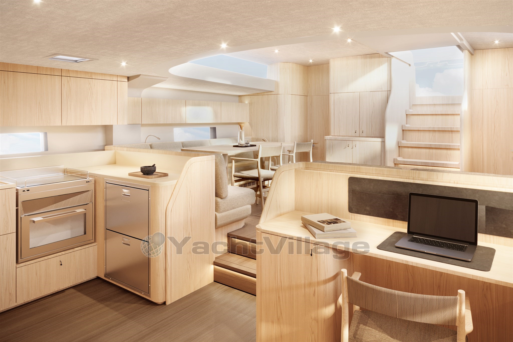 Unterdecks wurde die Verteilung mit einem eigenen technischen Abteil, einer vergrößerten Besitzerkabine und mehreren modularen Konfigurationen optimiert, die es ermöglichen, die Innenräume an die Bedürfnisse des Besitzers anzupassen. Das Innendesign, entwickelt vom YYachts Design Team mit David Thulstrup, bietet vier verschiedene Atmosphären – Mailand, Baltisch, Gletscher und Sugi Ban – basierend auf natürlichen Materialien und ausgewogenen Farbpaletten.
