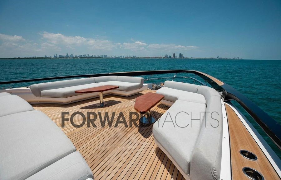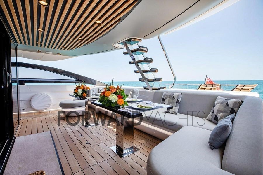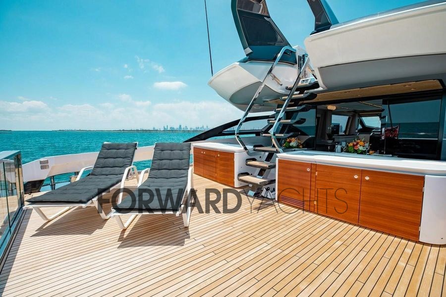 Angetrieben von zwei 2.600-PS-MTU-Motoren erreicht der Azimut S10 eine Höchstgeschwindigkeit von etwa 35 Knoten bei einer komfortablen Reisegeschwindigkeit von etwa 28 Knoten. Die Außenbereiche sind dank der spektakulären hinteren Infinity Terrace und der großen Sonnenbereiche für maximalen Kontakt mit dem Meer gestaltet.