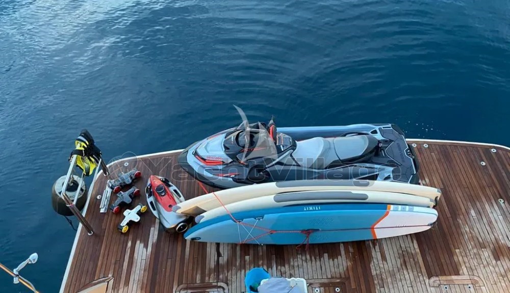 Tv – Lcd DVD (46” in Salon), 40" in Owner's cabin and 32" in Vip Cabins and Twin Cabins, PlayStation 4, Sky Connection, Wi-Fi, STABILIZERS AT ANCHOR Tender + ToysNEW 2024 2 x Sea Wings NEW 2020 7,74mt Axopar 24 T-Top Tender Seadoo 100 hp 2seats waverunner 1 x SEABOB 3 X SUP 1 X WAKEBOARD 1 X WATERSKI 1 X BIG HEXAGONAL INFLATABLE PLATFORM 3,5 X 3,5 mt 4 person inflatable donut snorkeling equipment (various sizes) 1 inflatable kayak