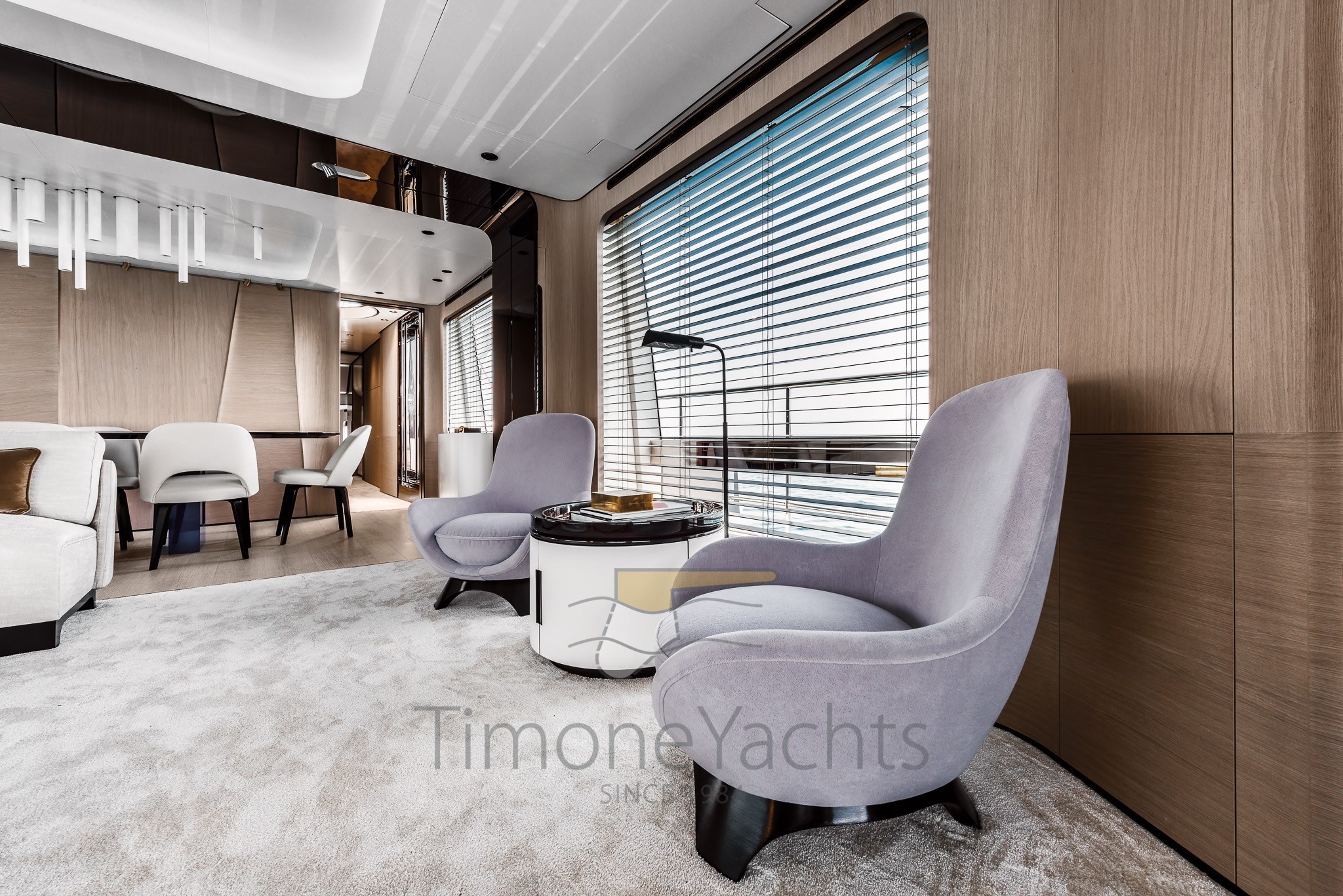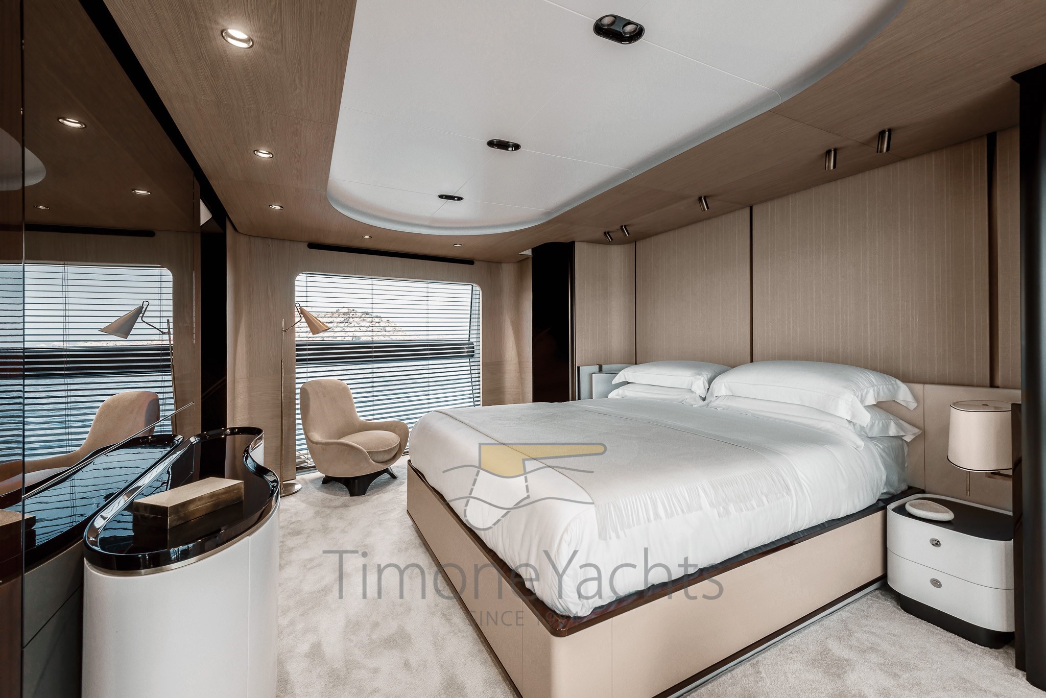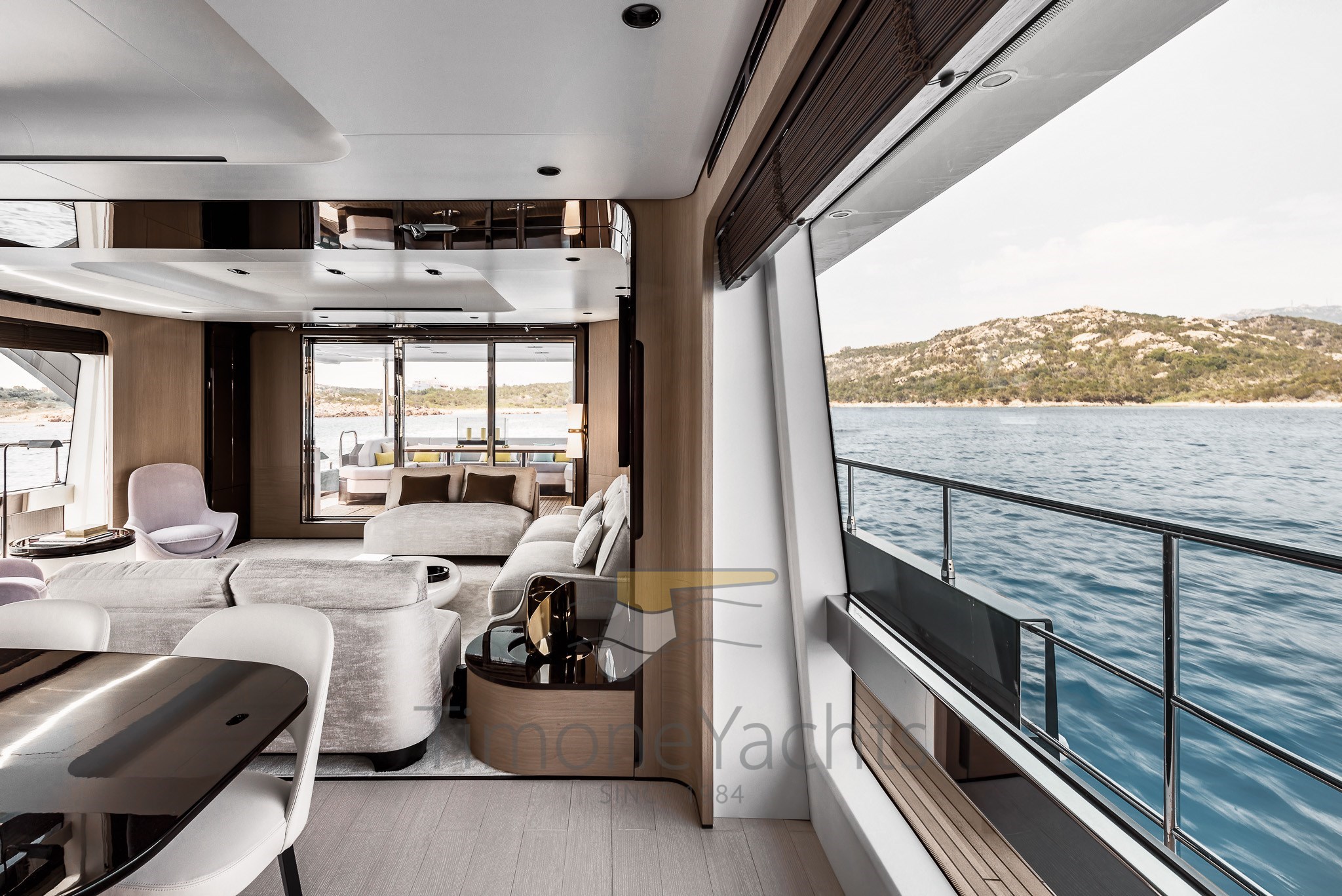 Im Gegensatz zu traditionellen Vorstellungen und den vorgegebenen Zwängen typischer räumlicher Einteilungen basiert die Unterteilung der Räume der Grande 27M auf einer Abfolge architektonischer Elemente und Schotten, die jeden Bereich umschließen und die Räume sanft mit einer harmonischen Krümmung an den Enden unterteilen, als wolle man die Wunder des Meeres durch die riesigen bodentiefen Fenster einrahmen.