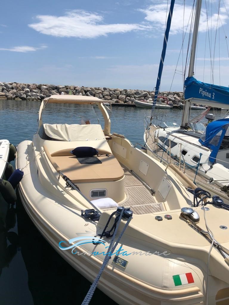 Ultraflex 2025 hydraulische Lenkung, 2 Bremsen; elektronische Handschellen; Doppelpropeller; sowohl interne als auch externe USB-Anschlüsse; Wechselrichter 2000; alle LED-Lichter; abnehmbarer und waschbarer Innenteppich; immer wieder ins Haus gelegt, vom 15. Juni bis 15. September im Wasser; Kompressor zum Aufblasen der Schläuche, volle Abdeckung für die Nacht. 2021 NEU: verschiebbare hintere Markisenstangen, Heckabdeckung aus cremefarbenem Bimini, neue Plattform in Flexitec, Leiter, Hydrauliksystem mit der Positionierung der Wasserbox am Heck 200 Liter, Lederpolsterung der Handläufe, Küchenbrenner. Innenausstattung: Audiosystem der neuen Generation mit Glauk-System mit zwei Innen- und Außenbereichen, unsichtbares System mit Anregern, gewellten Motorrohren, wasserdichte Heckschließfächer; 2024 wurden 2 Suzuki 350 installiert, eine aus 2019 und eine aus 2023; 2024 NEU: Bugtriebwerk, GPS und Garmin-Plotter, elektrisches System; NEU 2025: Frigomar Klimaanlage, Toilette, Ultraflex-Hydrauliklenkung.