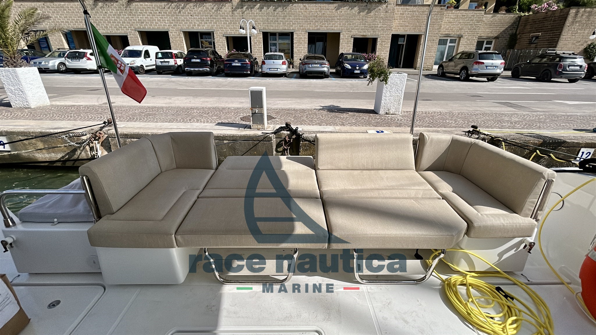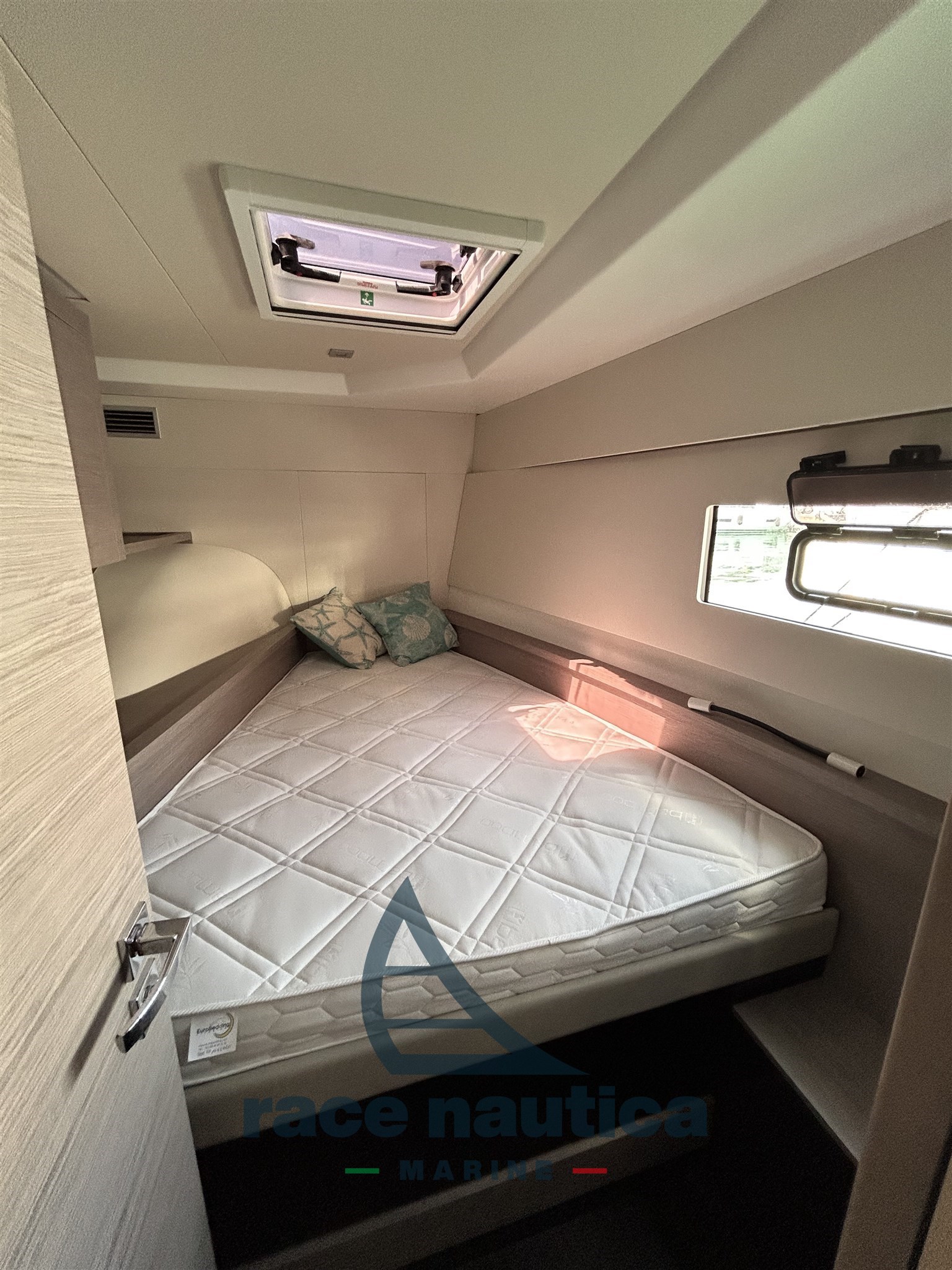 2x21W blue underwater lights, 2000W 220V charger/inverter, 12V socket at the helm station, hot/cold water shower, interior and exterior courtesy lights, 2 external cushions in the forward saloon, Fusion Bluetooth 2HP audio pack, additional 115A AGM auxiliary battery, 220V mains with cabin sockets, 1 electric WC (owner's cabin), sliding blackout curtains in the saloon, external cockpit cushions, 2 fenders, Additional bow winch control with chain counter, 2 Yanmar 4LV 250HP engines, Thunder external cushions, Pure White PVC internal cushions (Maestro version), Bimini in cockpit, Cockpit cover, Cockpit table, Handrails on gangway, Fresh water tap in cockpit and anchor locker, 220V Kenyon electric grill in cockpit, Low square electric table convertible into dining table, Garmin Pack 1, 12V 130L refrigerator, electric freshwater toilet for guests, galvanic isolator, 3x90/100W solar panels on the sport top, antifouling, epoxy primer, fixed stern platform in synthetic teak, 16KG anchor, 60m of chain.