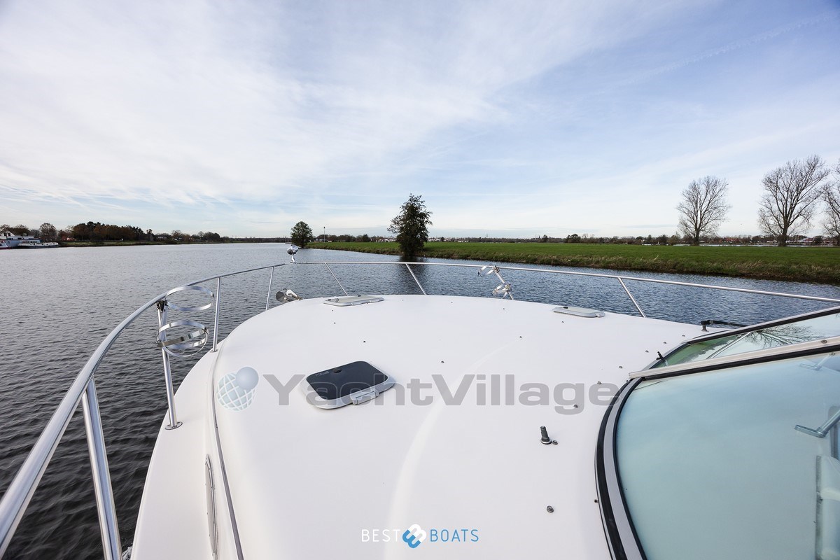 Beneath the cockpit are two powerful Mercruiser 350 MAG MPI V8 engines (300 hp each), each with approximately 755 engine hours, ensuring smooth, reliable sailing. The deep-V hull shape offers stability and comfort, even in slightly rougher waters, while hydraulic steering, dual sterndrives, and electric bow and stern thrusters make maneuvering easy.