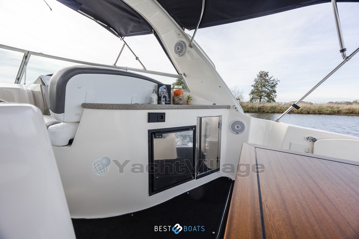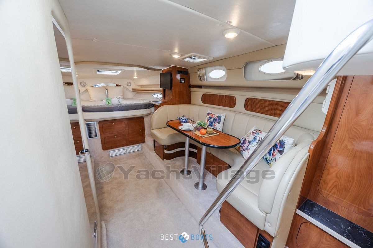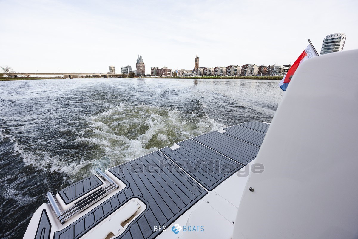 On deck, the boat offers a stylish swim platform with faux teak, a fold-out stainless steel swim ladder, a cockpit cover, and outdoor cushions . For easy maneuvering in harbors, the boat is equipped with electrically operated Side-Power bow and stern thrusters .