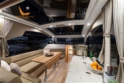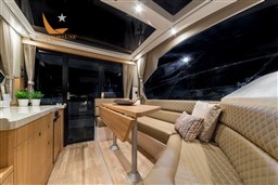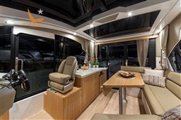 The cockpit area is equipped with a sofa with a retractable backrest and a table. To expand the space for activities, open the cockpit doors fully and fold the saloon seat aft. More adventurous passengers can opt for the bow sundecks or the innovative front seat for an exciting ride.