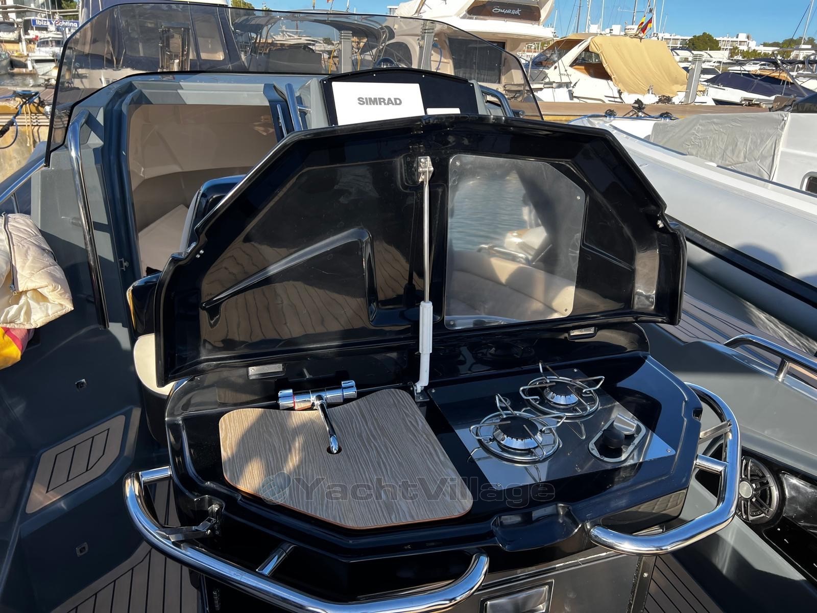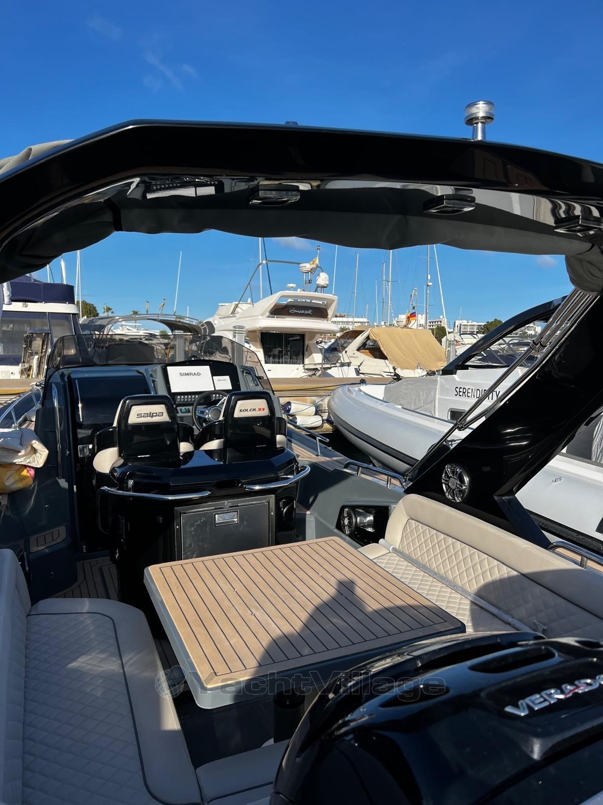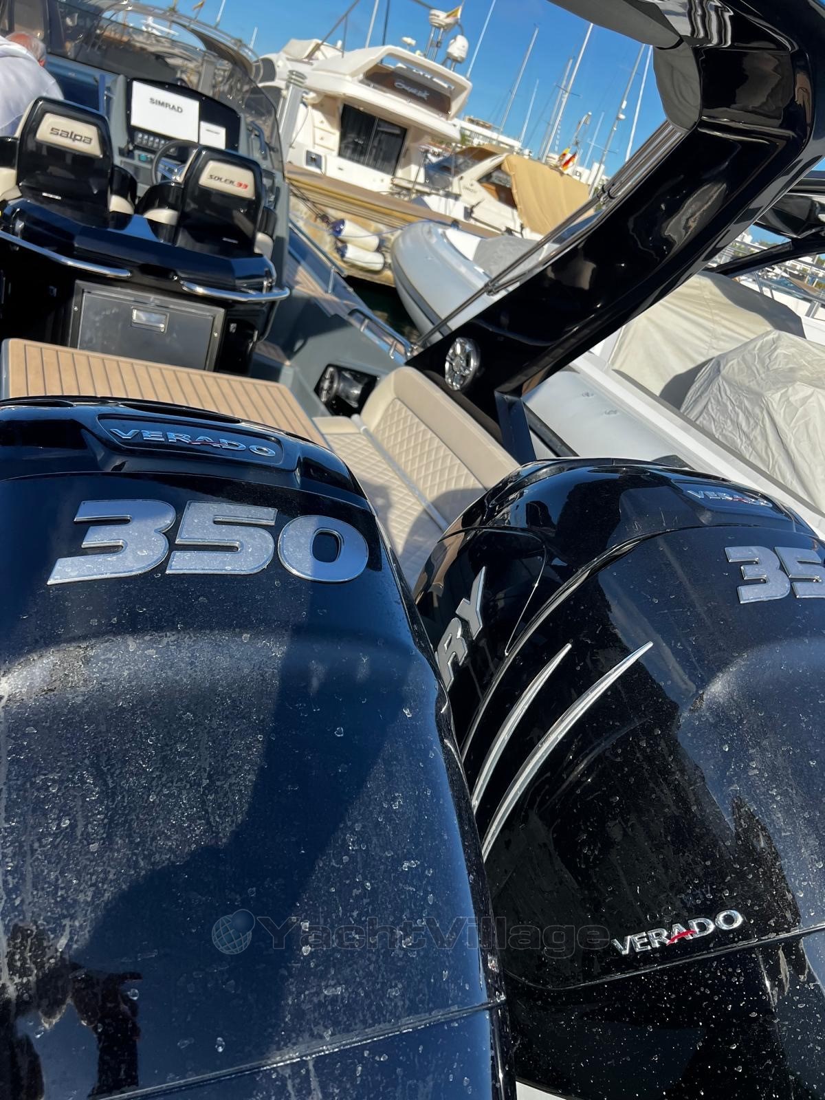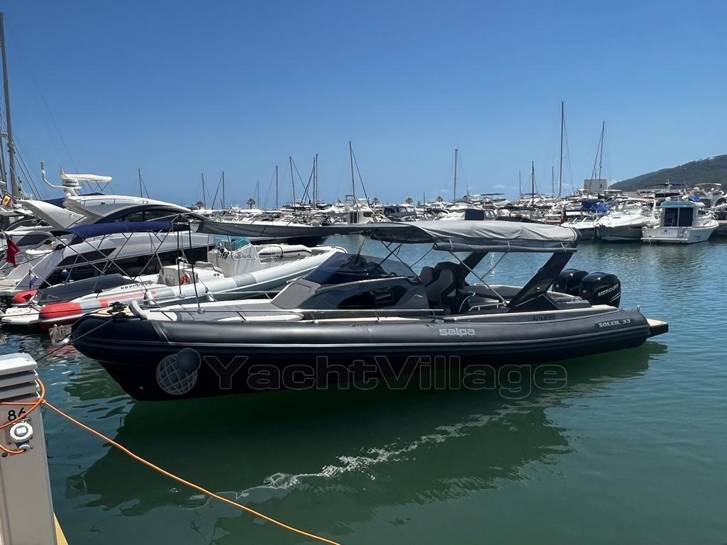 Cap Med is pleased to offer you this Salpa Soleil 33 vintage 2023. Salpa, recognized in the world of ultra-luxury semi-rigid boats, signs here a unit in excellent condition, equipped with two powerful Mercury Verado 350hp Black engines. This hardtail with a sporty and elegant design offers an optimised layout, high-end finishes and a complete range of equipment: the owner has ticked off absolutely all the available options. The boat was never rented.
