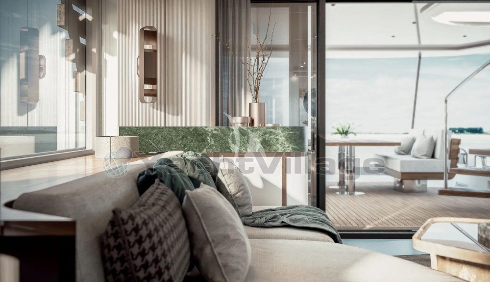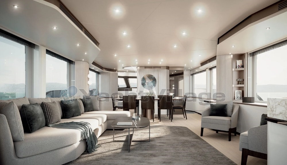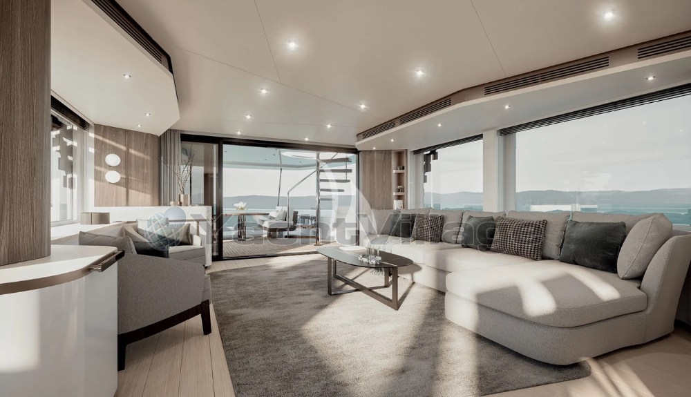 The interiors are bright and modern, with large panoramic windows that bring in plenty of natural light and create an open, welcoming atmosphere. The style is clean and practical, designed for easy living on board.