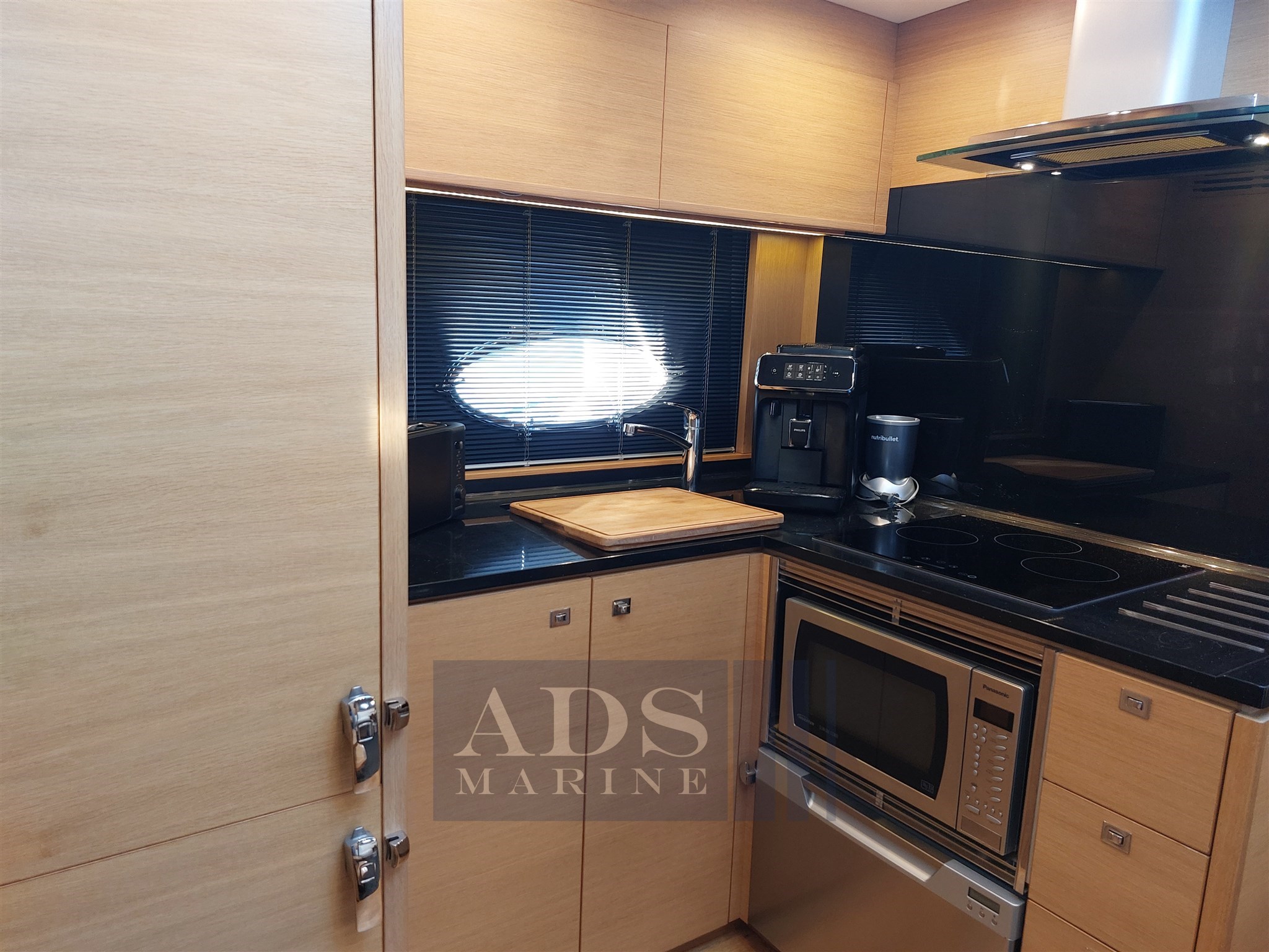 Kitchen: sink, big refrigerator Waeco, ceramic cooktop with 3 plates, microwave Panasonic, dishwasher Fisher & Paykel, hood