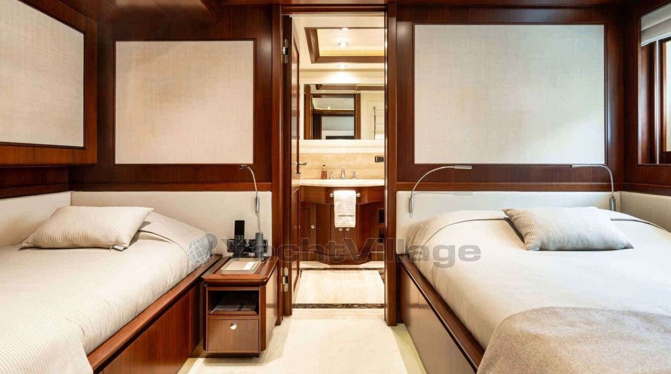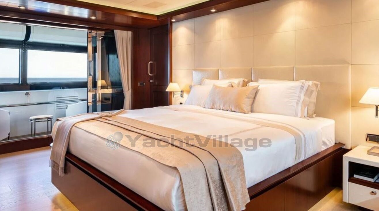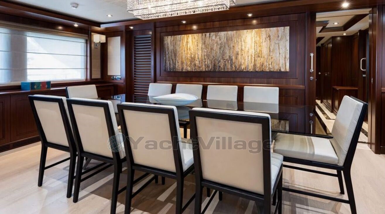 She accommodates up to 12 guests in five cabins, including a full-beam master suite on the main deck with a private balcony, as well as two double cabins and two twin cabins on the lower deck. Her interior features a refined, minimalist style, blending dark mahogany wood with white upholstery, enhanced by warm lighting and soft textures to create a welcoming atmosphere.