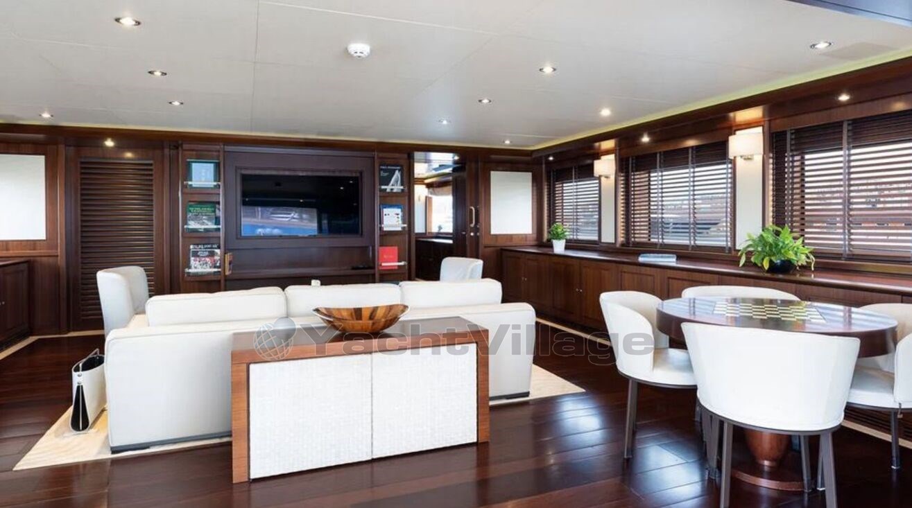 The main saloon offers comfortable seating, a bar and an entertainment centre, leading forward to a formal dining area. Large sliding glass doors open onto a spacious aft deck, ideal for al fresco dining and entertaining, while additional outdoor living space can be enjoyed on the upper deck.