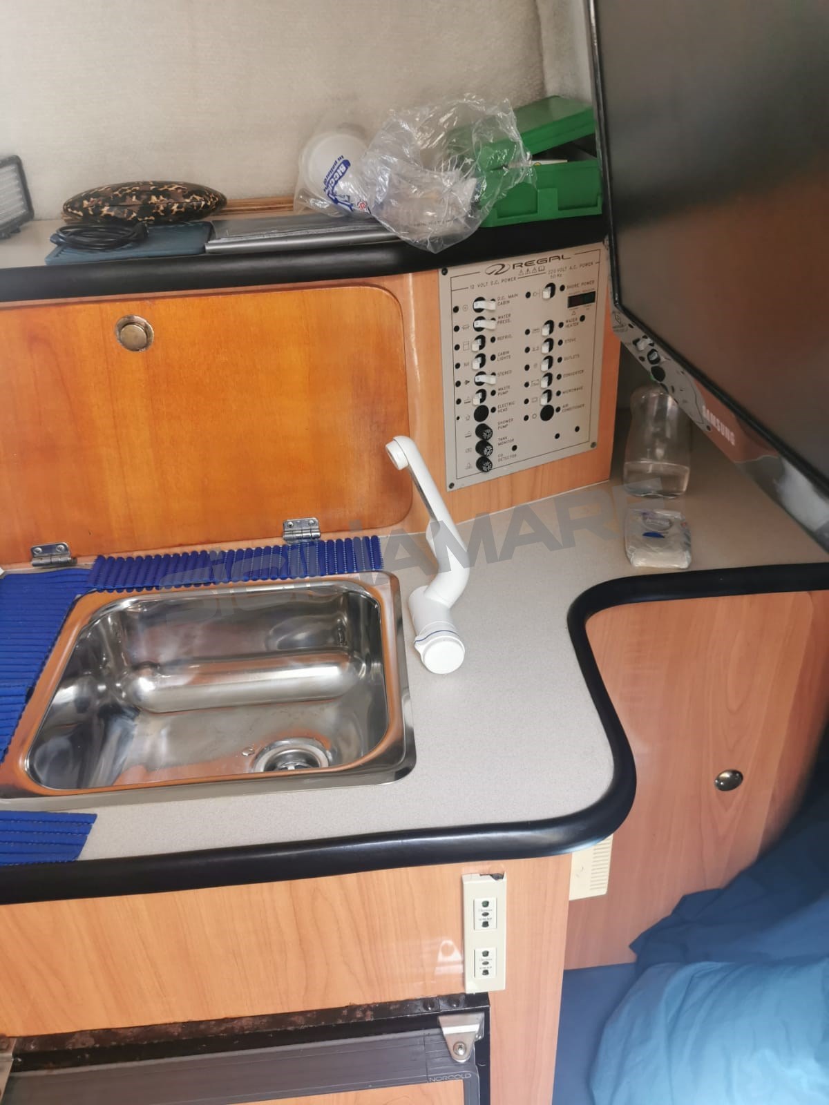 Complete with awning, TV, two-burner stove, indoor and outdoor sink, shower, complete cushions, coffee machine, xxl stern platform.