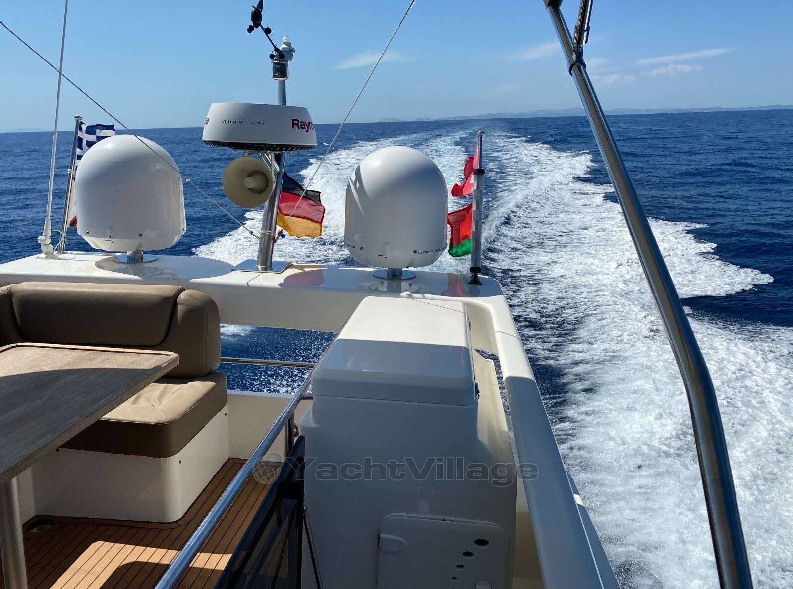 owner's cabin, guest cabin, saloon, inside driving position, bow cabin, 2nd steering position on fly, flybridge, stove with ceramic hob, refrigerator el., sink, microwave, refrigerator, toilet electr. + washbasin + shower, depth sounder with daughter, GPS with daughter, compass with daughter, radar, VHF radio, chart plotter, harbour tarpaulin, bimini top, flybridge tarpaulin, cockpit cover, shore power supply 220 volt, generator diesel, battery, battery main switch, battery charger, bow anchor windlass el., life raft, deck hatch, bathing platform integrated, hot water system, stern shower hot/cold, bilge pump, bow thruster, icemaker, colour TV, sun cushions on foredeck, underwater paint, cockpit table, CD player, wetbar, heating air conditioning, trim tabs el./hydr., equipment carrier, gangway electric, transom door to bathing platform, swimming ladder, pressurized water system, TV antenna, radio, other extras,