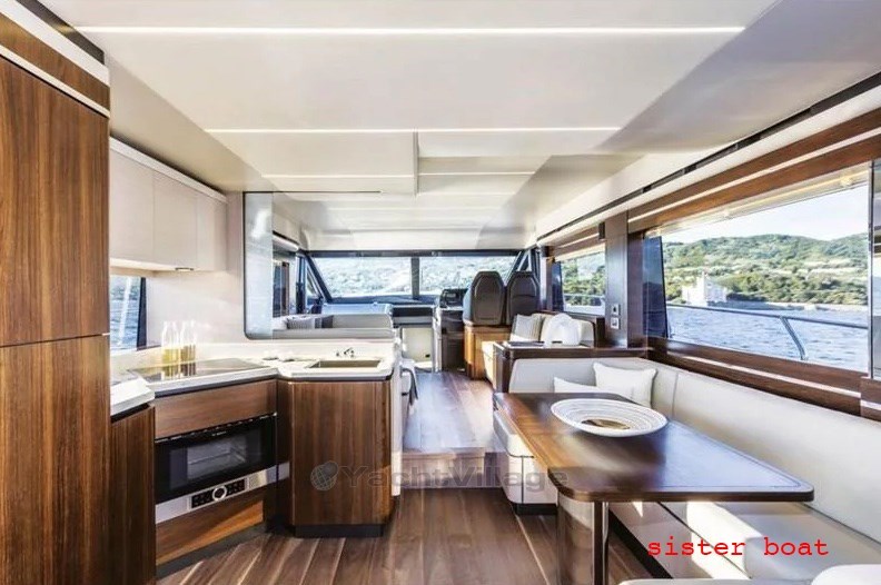 Electric bow thruster - air conditioning - 20 kW generator - mobile bar on the fly with fridge, electric hob and sink - underwater lights - electro-hydraulic gangway - stern platform with tender lift - hard top on the fly - satellite TV antenna - retractable LCD TV in the saloon - Fusion stereo - electric hob - fridge - freezer - combined microwave oven - tender.