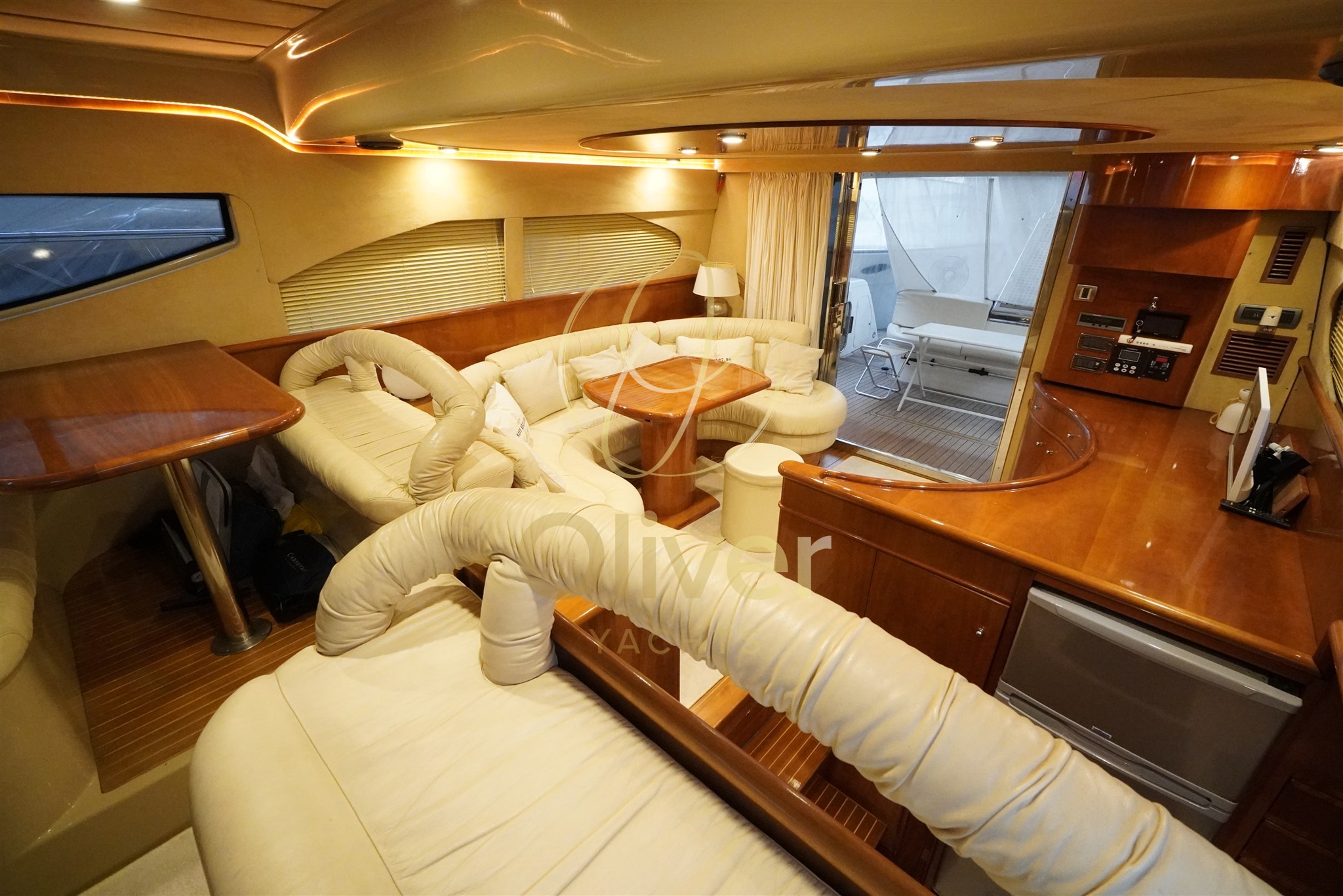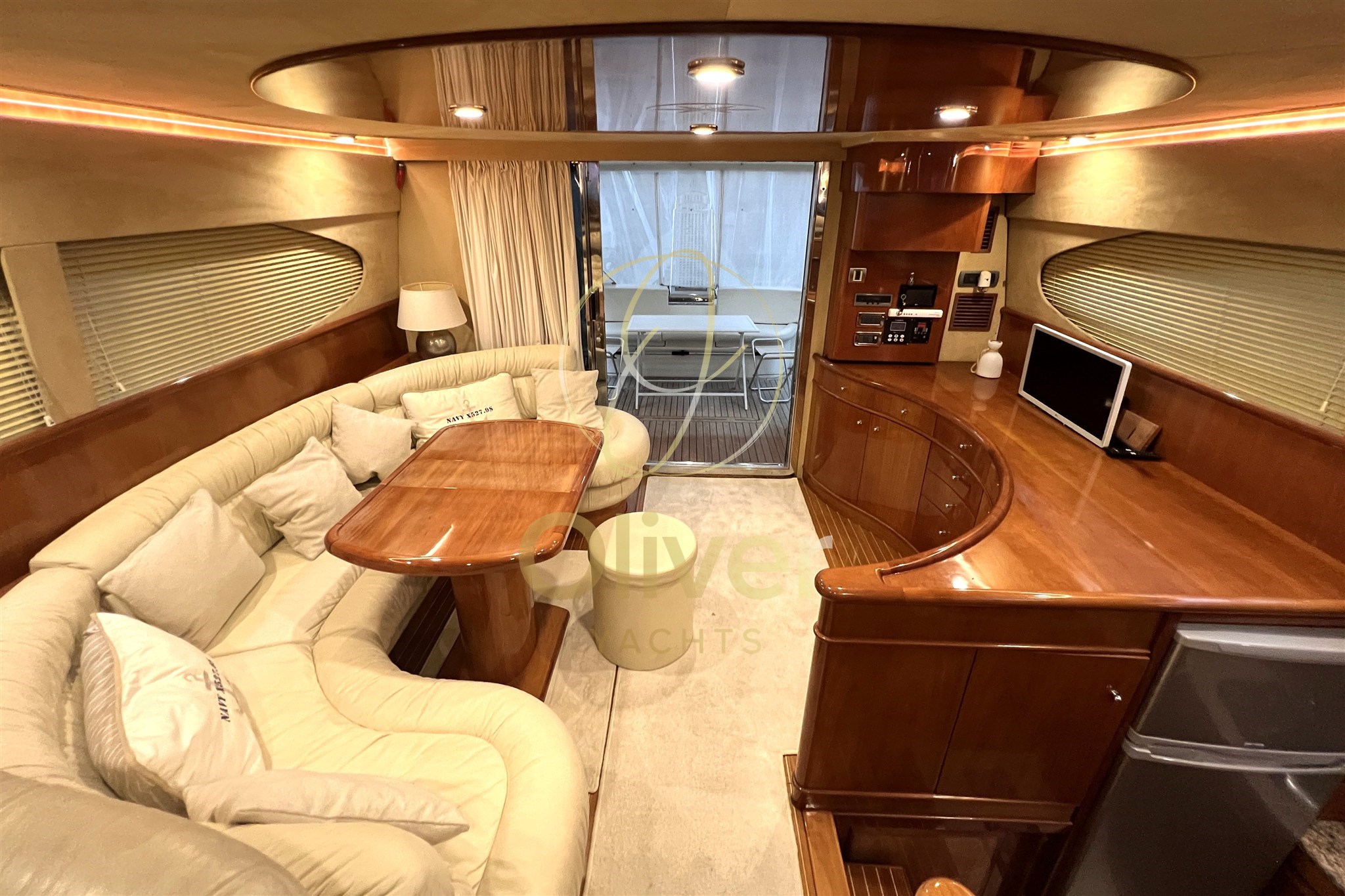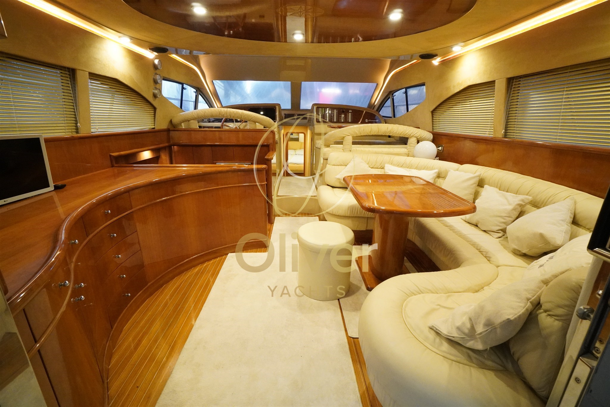 The interiors are striking for the brightness and continuity of the spaces. The saloon is large, with a double opposite dinette, enveloping sofas and well-sized tables: a true convivial space, perfect both at sea and at mooring. The internal wheelhouse is well integrated, with excellent visibility and comfortable seating.
