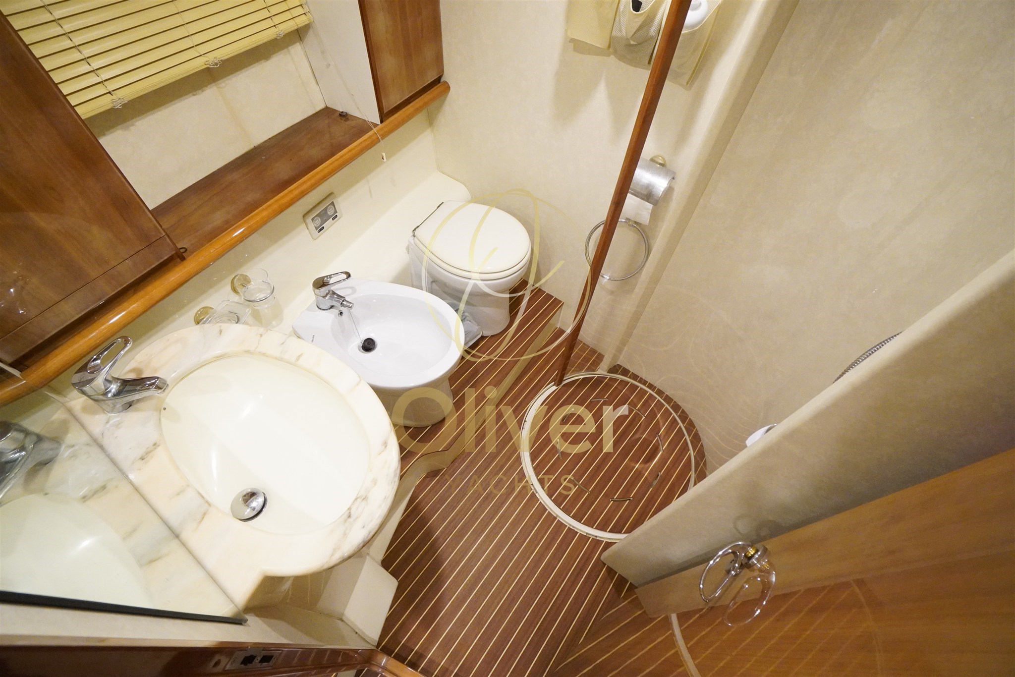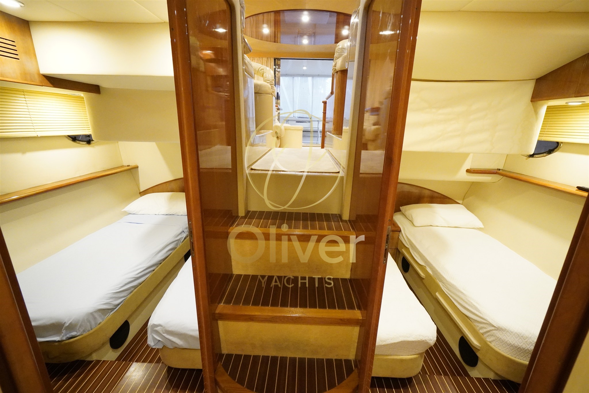 The sleeping area is well distributed: master cabin forward with private bathroom and separate shower, two guest cabins with single beds on the floor, and second full bathroom with shower. The spaces are rational, well exploited and designed for uncompromising living on board.