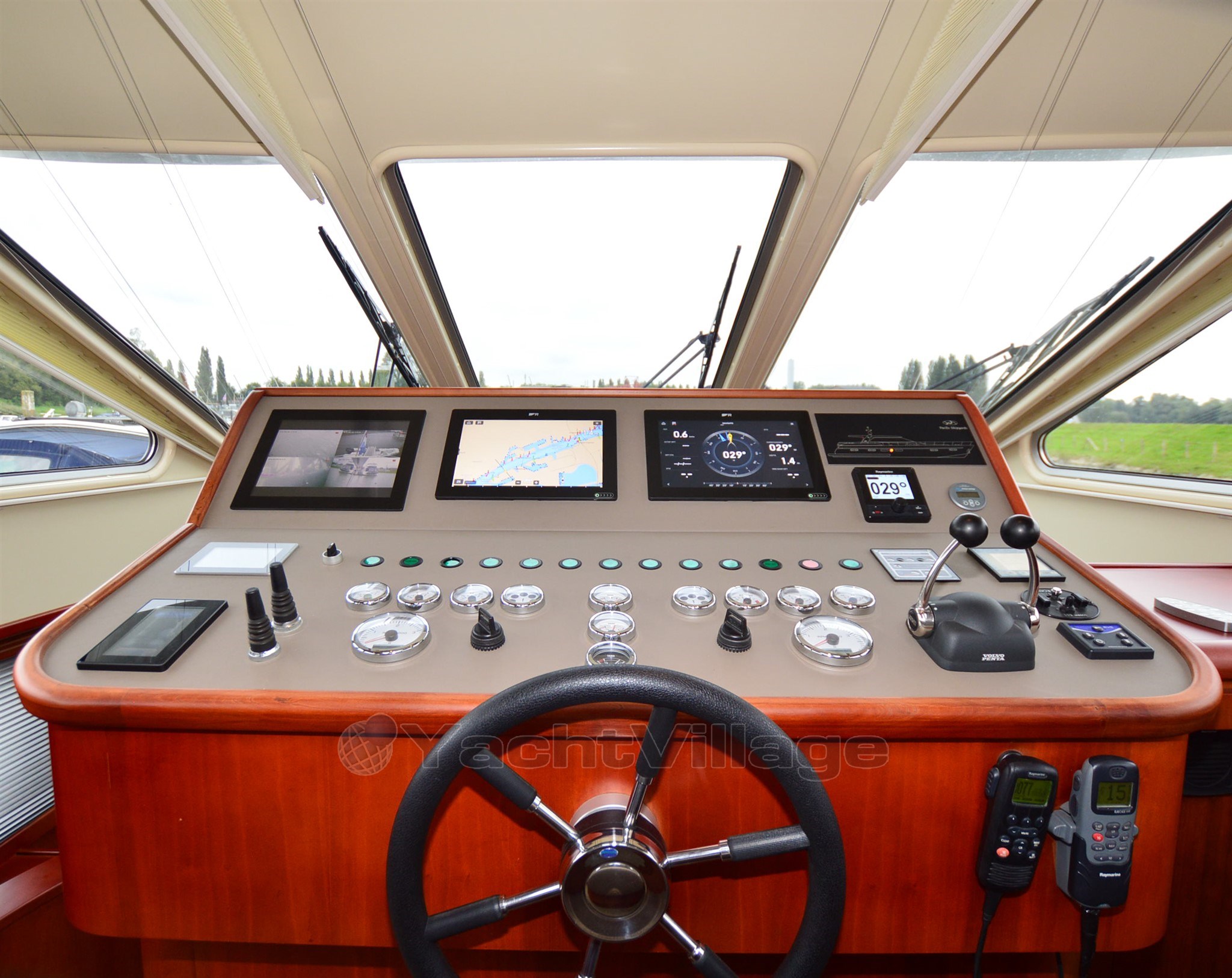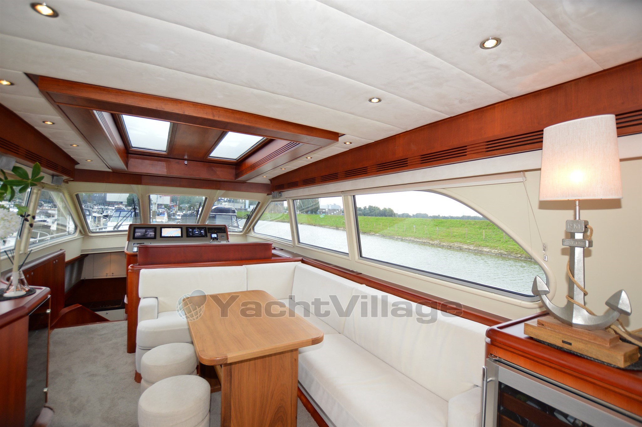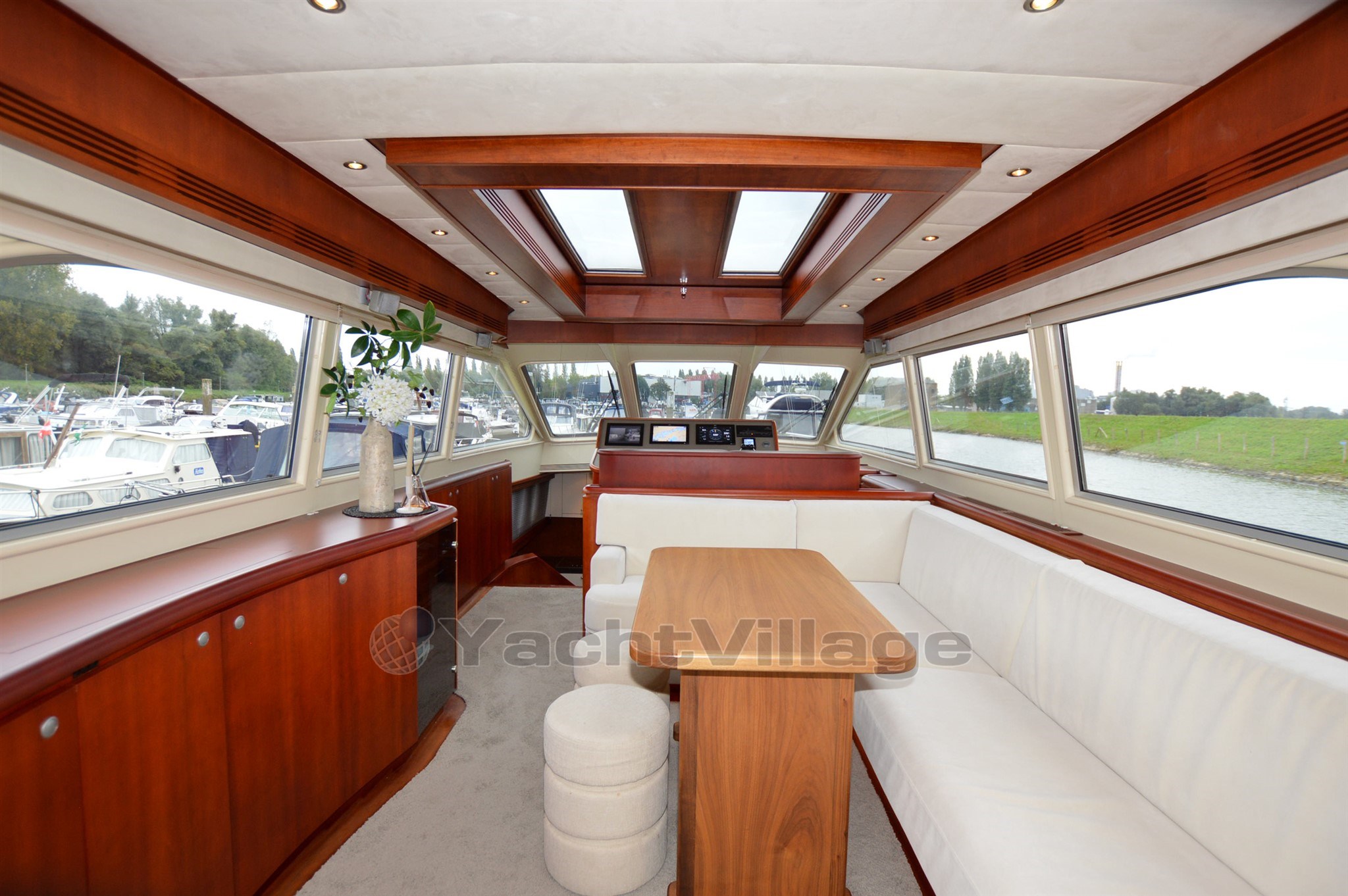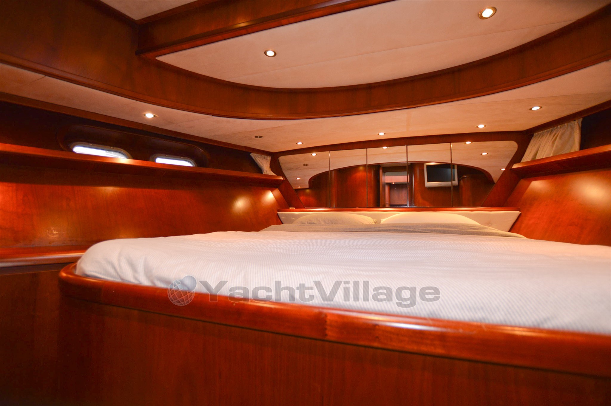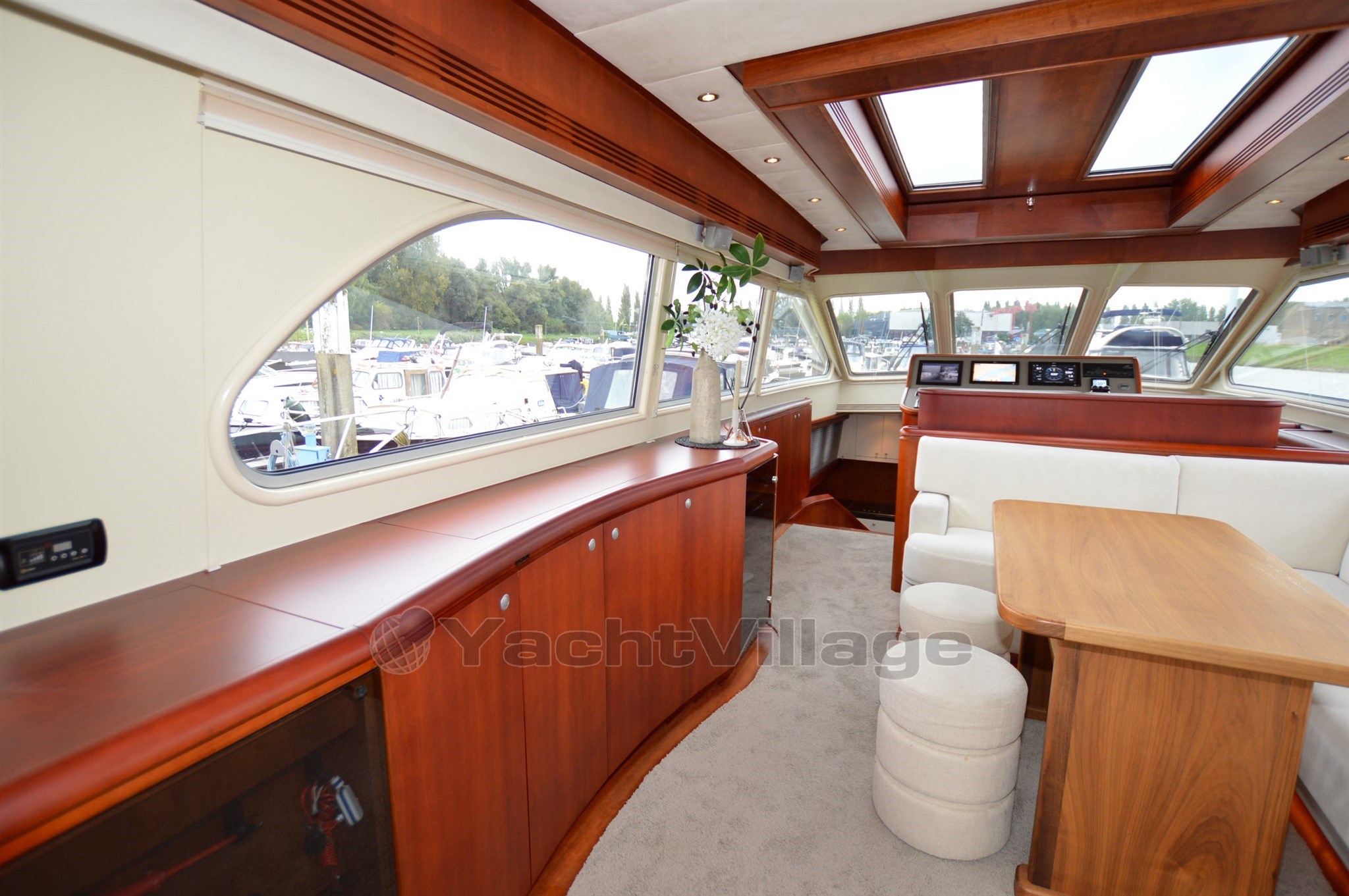 The yacht has a very spacious upper deck with saloon, sideboard and a central steering position, from the saloon a spacious spiral staircase down, there is on SB side a spacious dinette and on port side an extensive galley, from this room a walkthrough to the forward section, in the forward section is a spacious cabin with double bed, on SB side a spacious shower-toilet room, on port side a cabin with 2 beds above each other, furthermore a spacious passage to the aft with on SB and port side access to the engine room, next to it on port side a cabin with two beds above each other, at the very aft a very luxurious and spacious owner's cabin with ensuite bathroom with shower and toilet, from the upper deck open doors to the spacious aft deck, the aft deck is equipped with a round seat, spacious sidedecks and an additional bench with table on the foredeck, from the aft deck round stairs to the bathingplatform.