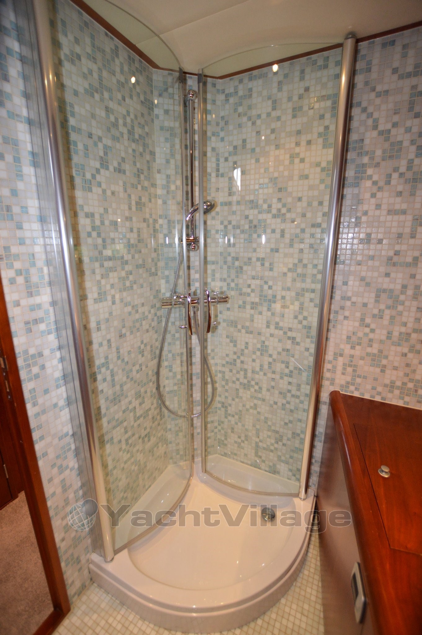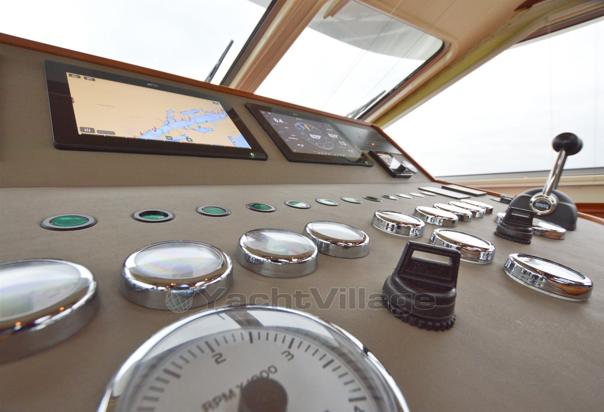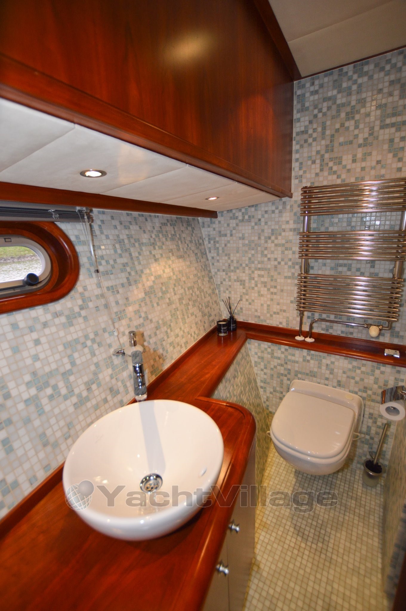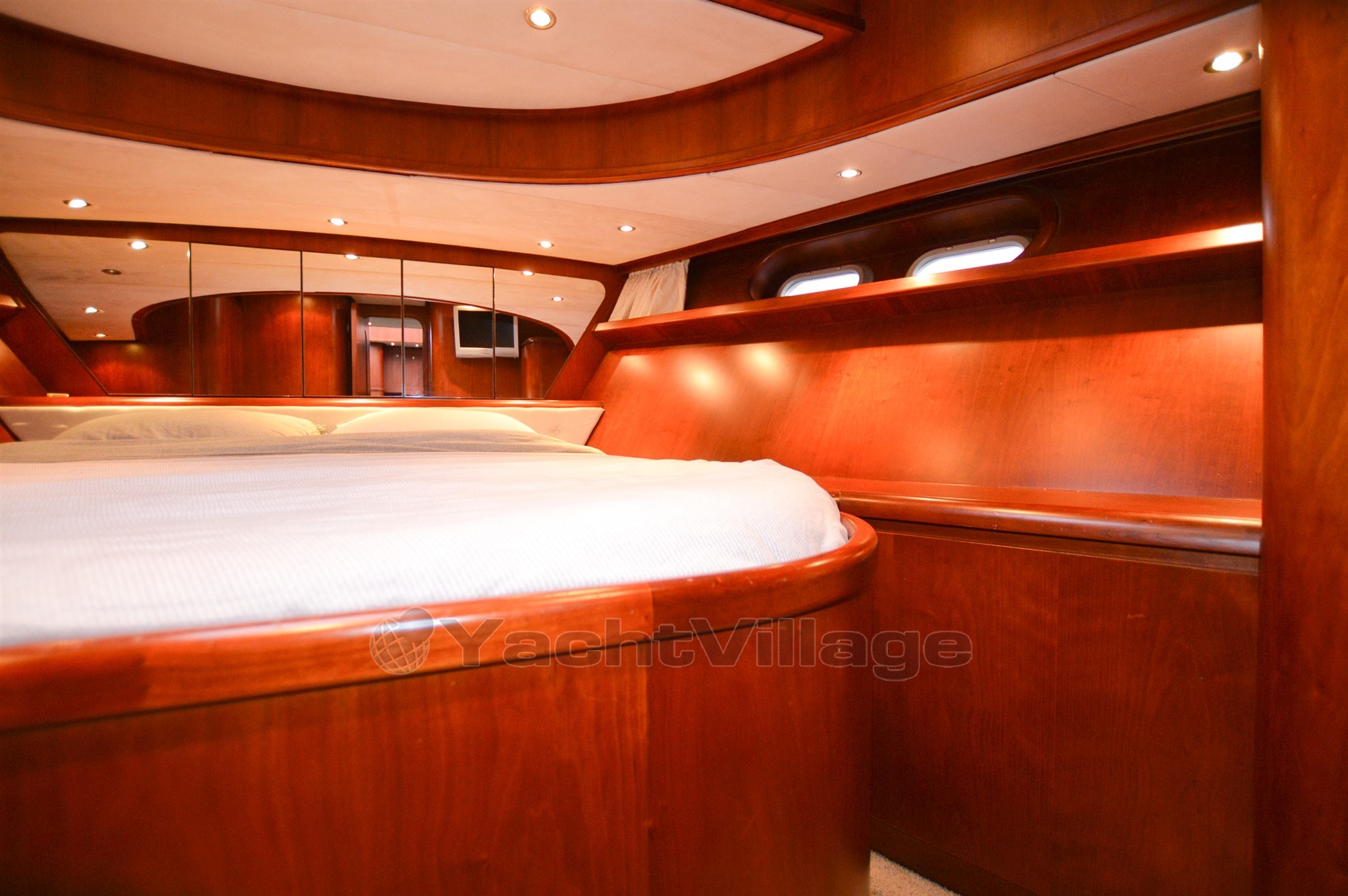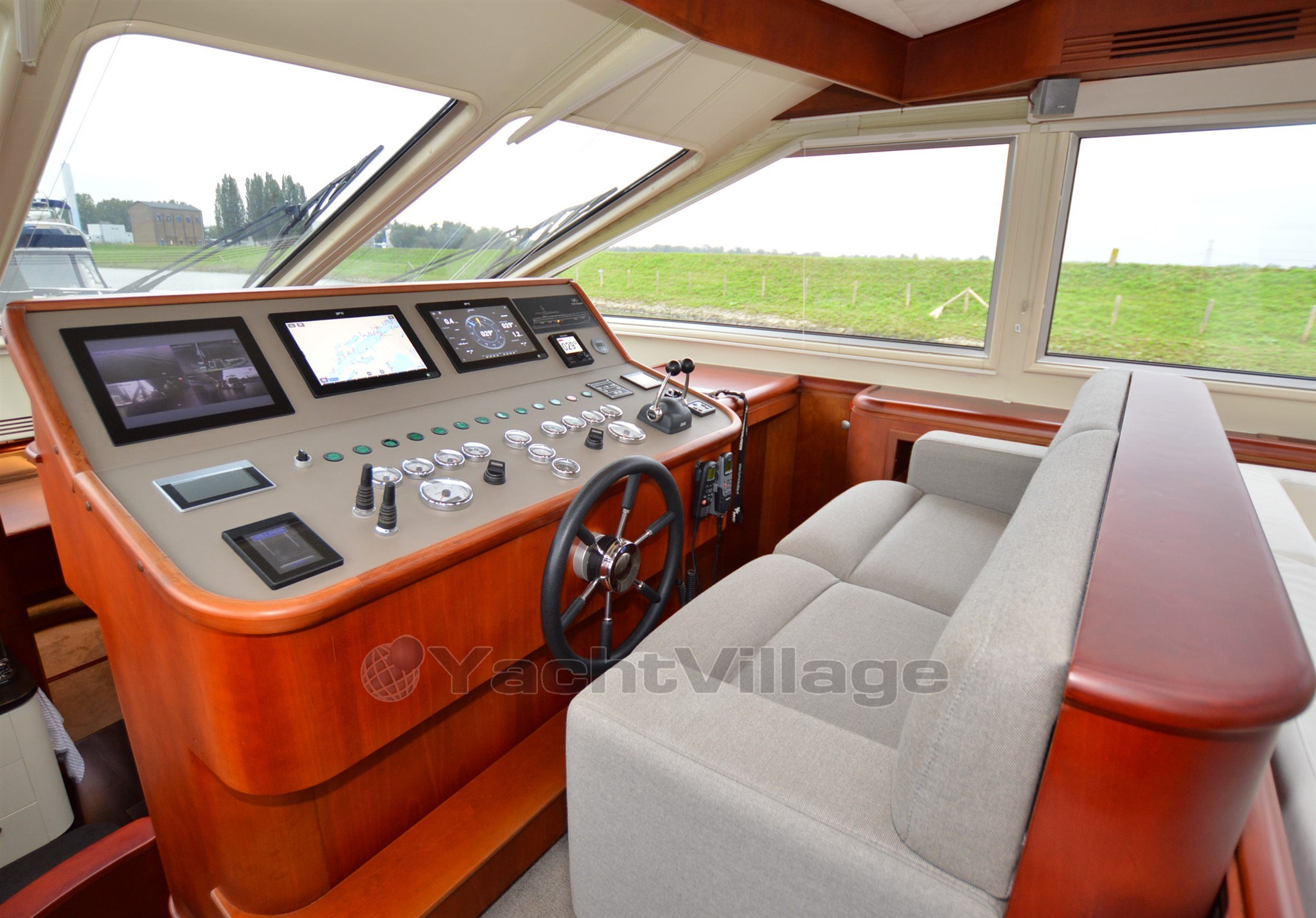 The yacht has a very spacious upper deck with saloon, sideboard and a central steering position, from the saloon a spacious spiral staircase down, there is on SB side a spacious dinette and on port side an extensive galley, from this room a walkthrough to the forward section, in the forward section is a spacious cabin with double bed, on SB side a spacious shower-toilet room, on port side a cabin with 2 beds above each other, furthermore a spacious passage to the aft with on SB and port side access to the engine room, next to it on port side a cabin with two beds above each other, at the very aft a very luxurious and spacious owner's cabin with ensuite bathroom with shower and toilet, from the upper deck open doors to the spacious aft deck, the aft deck is equipped with a round seat, spacious sidedecks and an additional bench with table on the foredeck, from the aft deck round stairs to the bathingplatform.