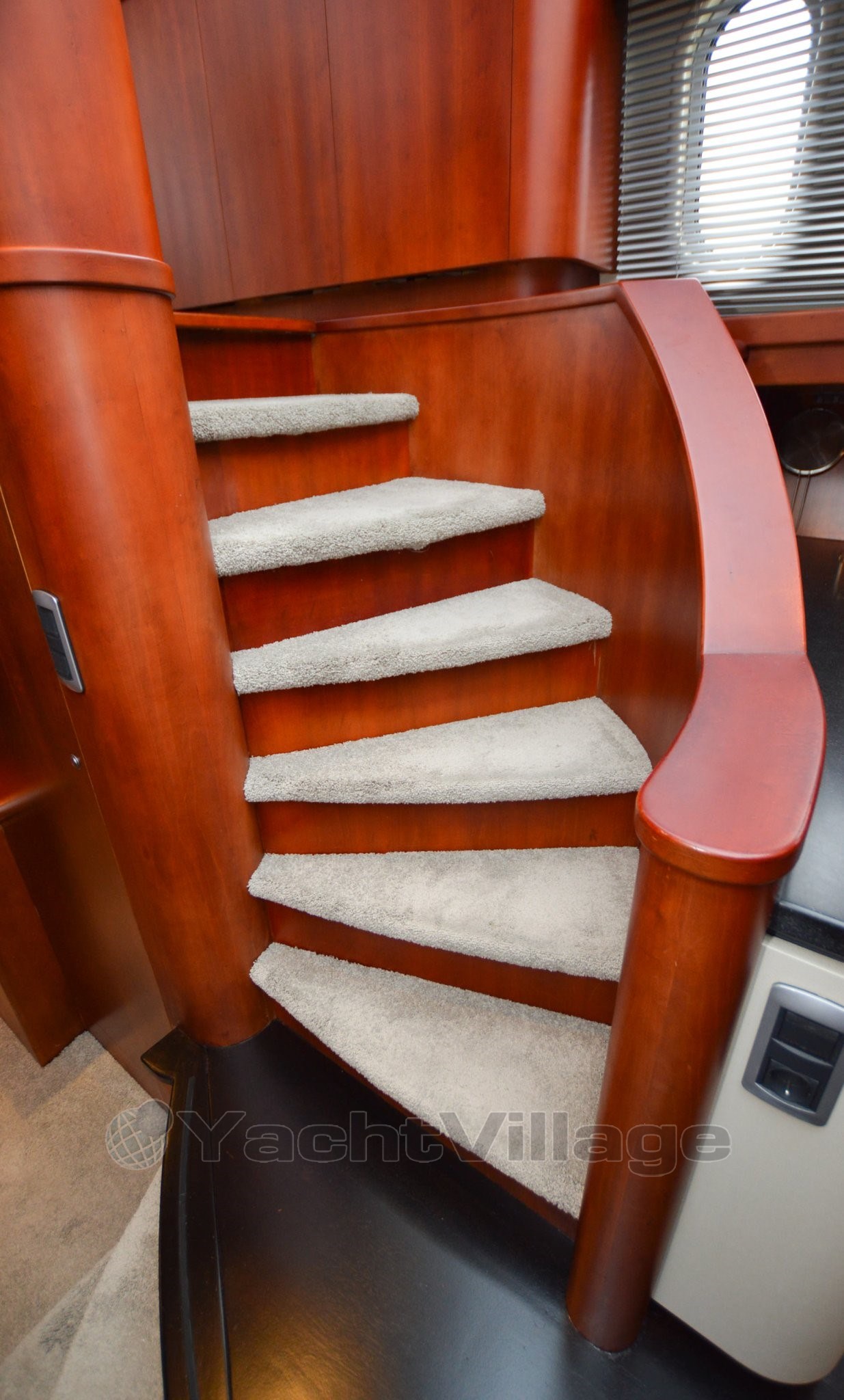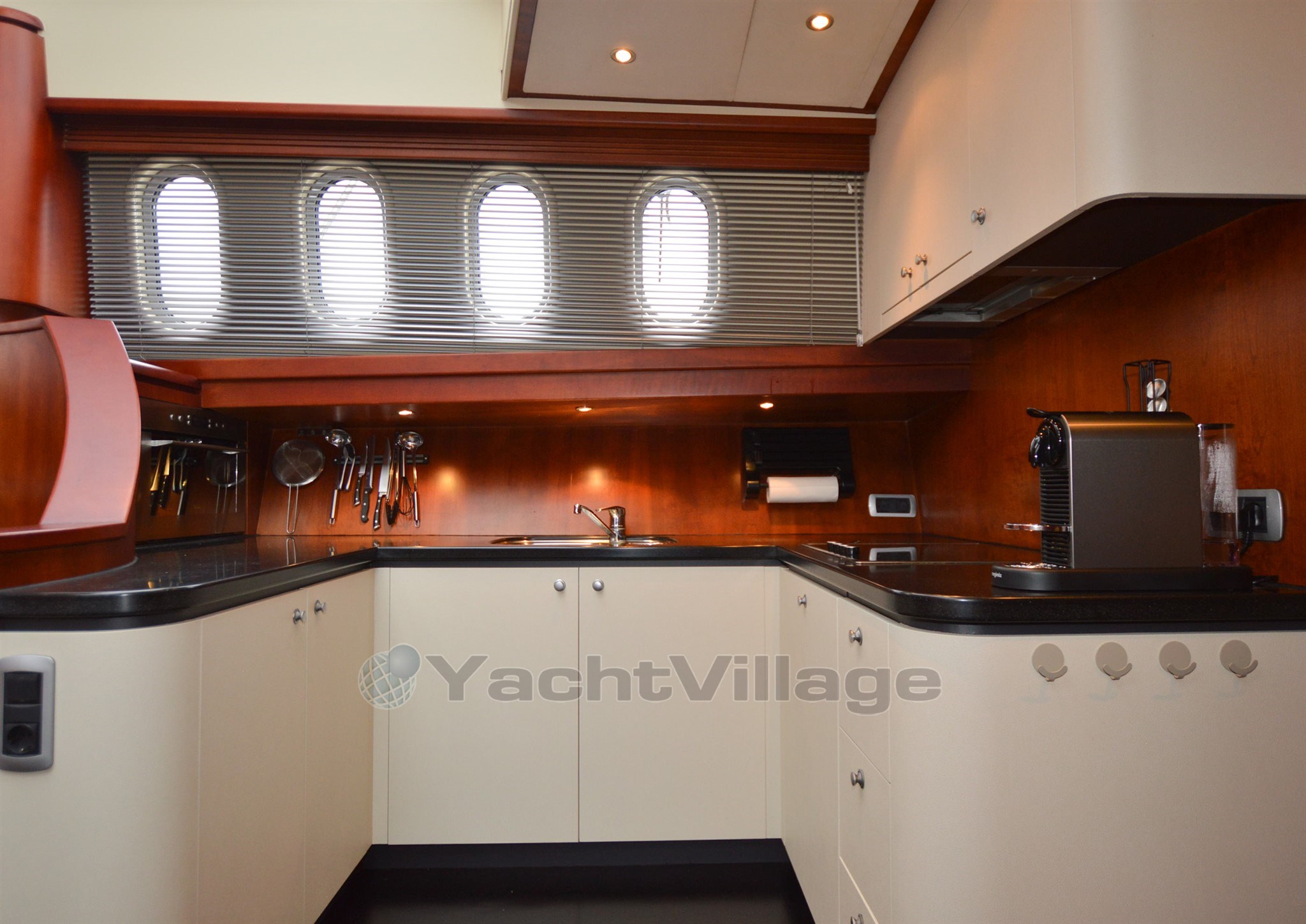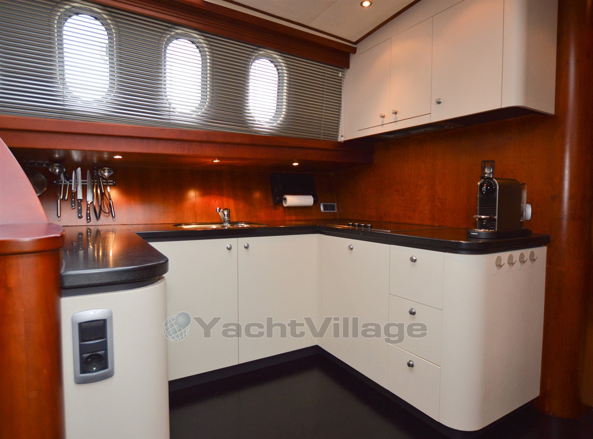 Curtains: Cream blinds and curtains - cream / gray carpet - black wooden floor galley