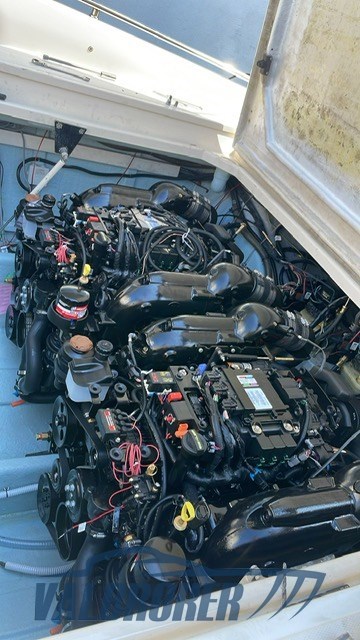 Walkaround built in 1998 but completely refitted in 2023: new Ultraflex hydraulic steering, new upholstery, electrical system, Fusion audio system (invoices available). Unique, hard to find. Highly performing. New twin 350cc Mercruiser MCM 6.2L engines with 2023 warranty. Reaches a top speed of 50 knots. Tiffany color.
