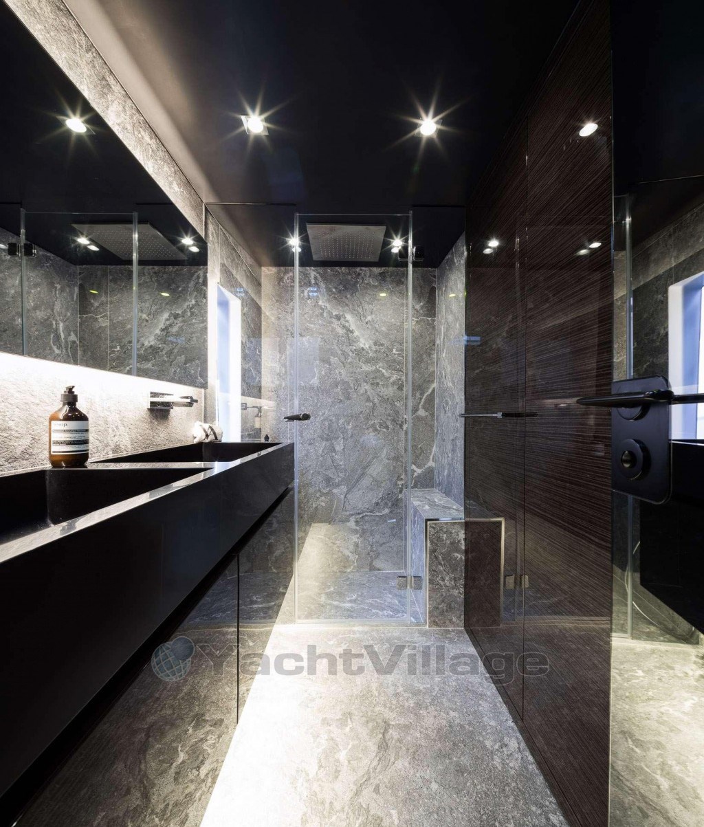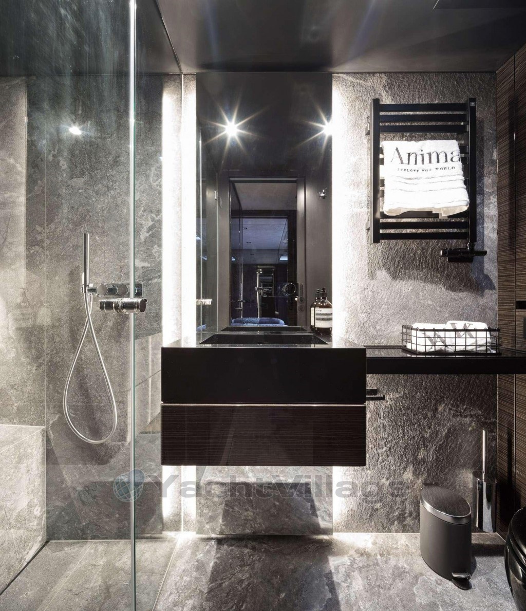 Its current owner has put all his experience and expertise into creating a safe and luxurious space for a family. All aluminum details have been upgraded to steel, kitchen equipment upgraded to Miele, B&O audio video, powerful generators, real stone in every bathroom, addition of a teppanyaki, security cameras, hidden TV in each cabin so they do not obstruct the sea view, etc.