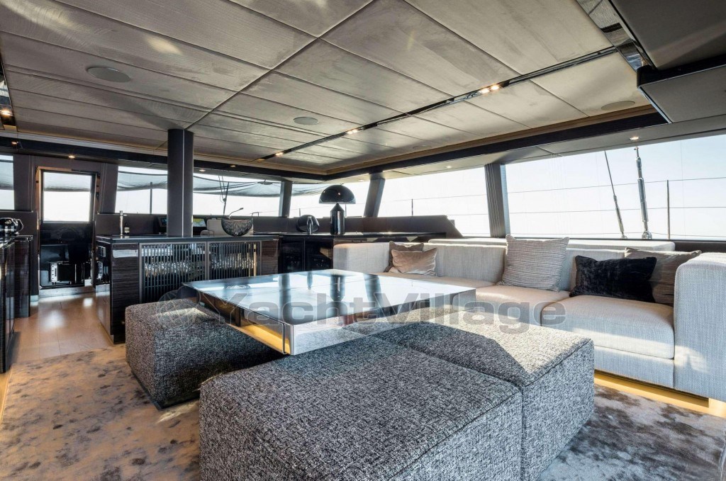 Entrance to the kitchen from outside, kitchen located below deck, with 2 ovens, gas with 6, dishwasher. Most importantly, there is space for the crew to relax, so they can give the owner some privacy onboard. This 70' Catamaran has a gangway/passerelle that was installed as an additional option, night lights, high finishing in every detail, carbon mast, etc.