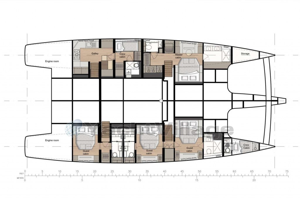 Everything onboard has been selected with much thought and experience to create maximum comfort for a loving family. Special entrance to the master cabin, which allows completely hiding the master cabin, a button, and the entrance to the master cabin becomes part of the interior furniture, and no one can guess that the master cabin exists.