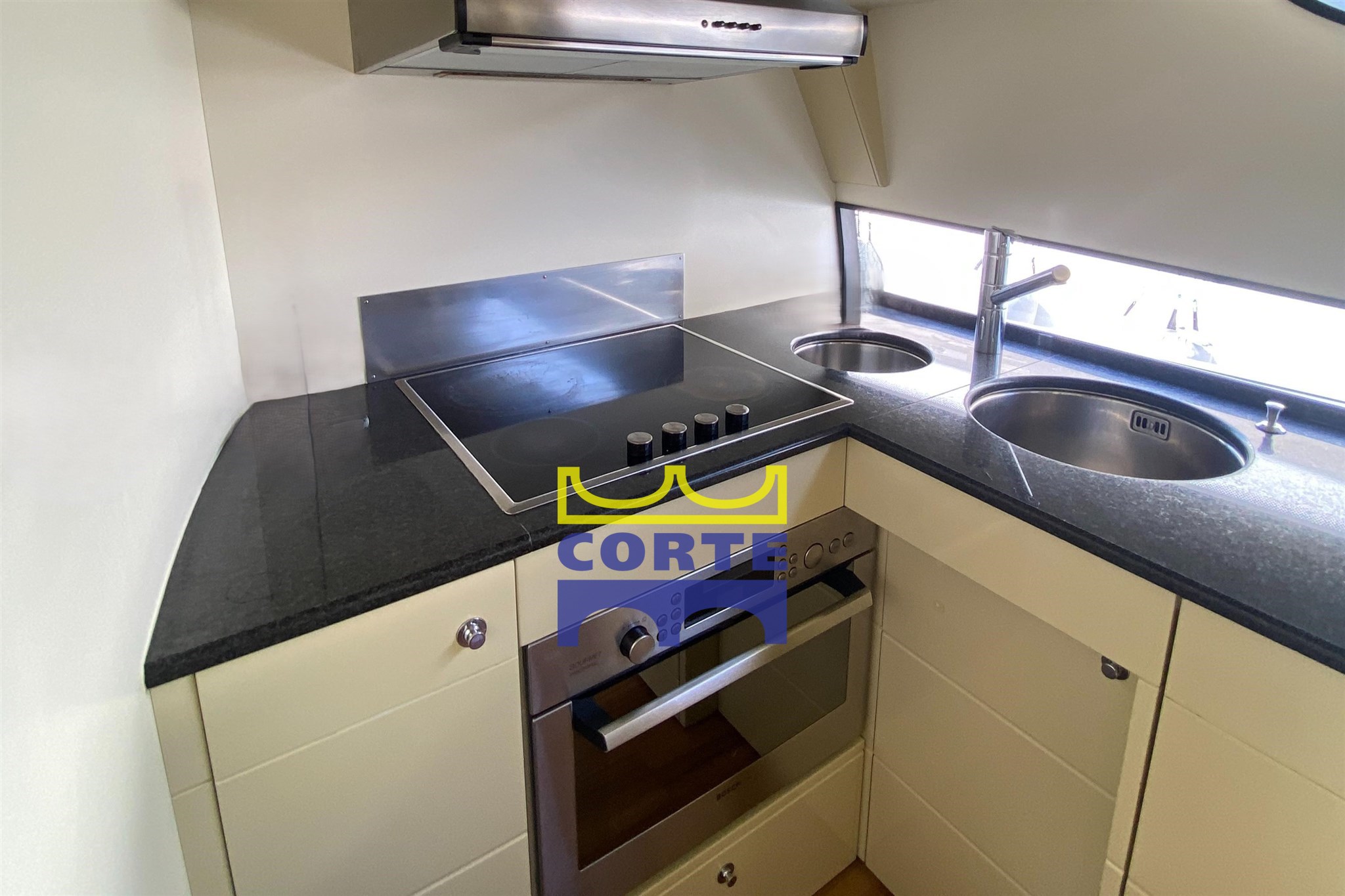 Kitchen equipped with ceramic hob, double sink, oven.