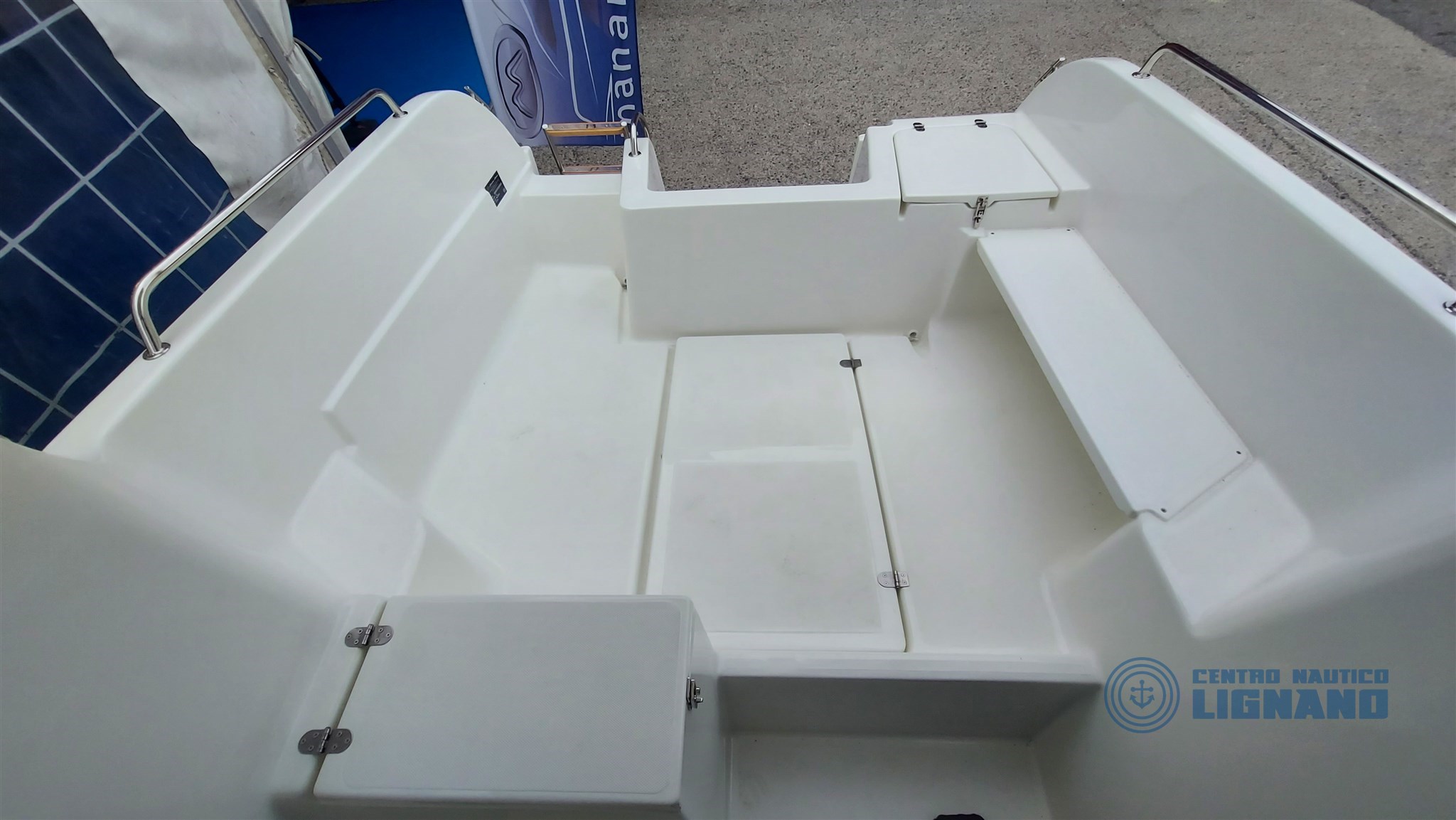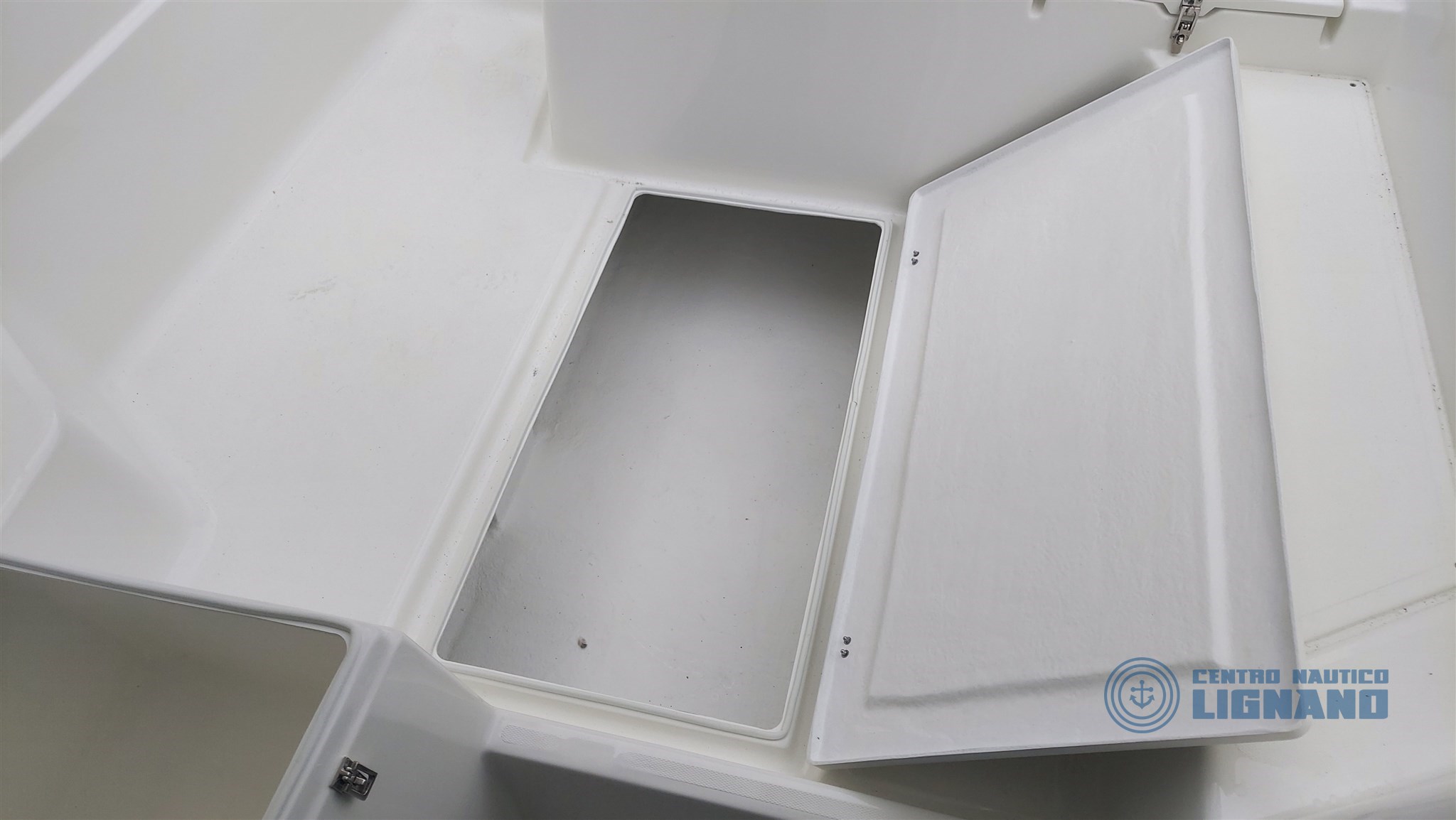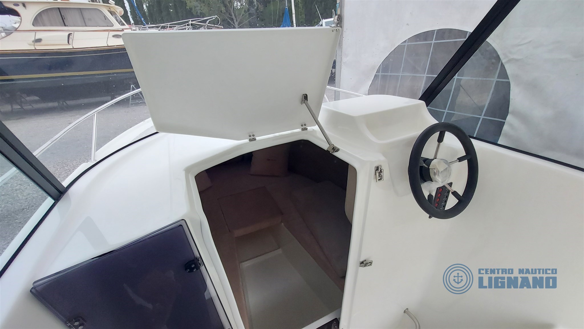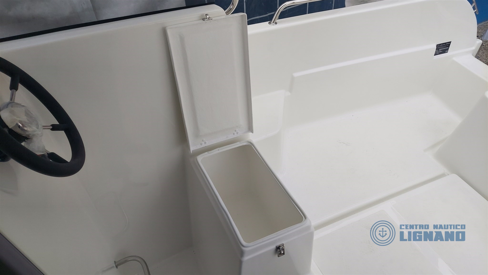 Anchor hatch and space for electric winch, Cabin access door, Plexygass windshield, N°3 Bollards, Central cockpit locker, Locker under driver's seat, Navigation lights, Battery space, Cabin access door, Stern ventilation grille, Steering wheel and steering box, Chemical or marine toilet accommodation, Live tank, Swim ladder.