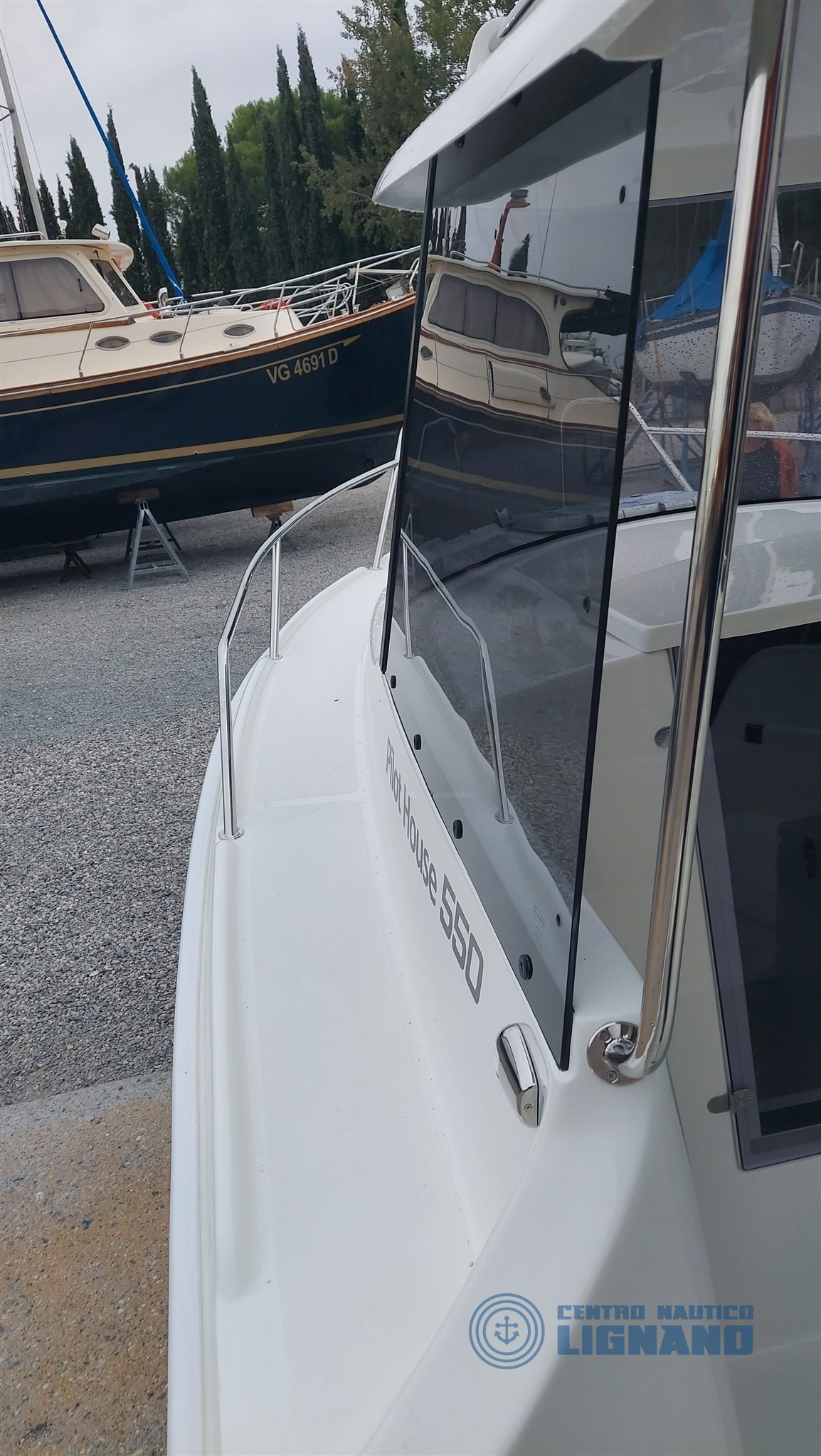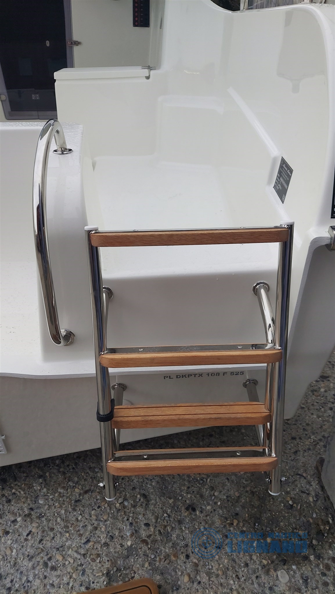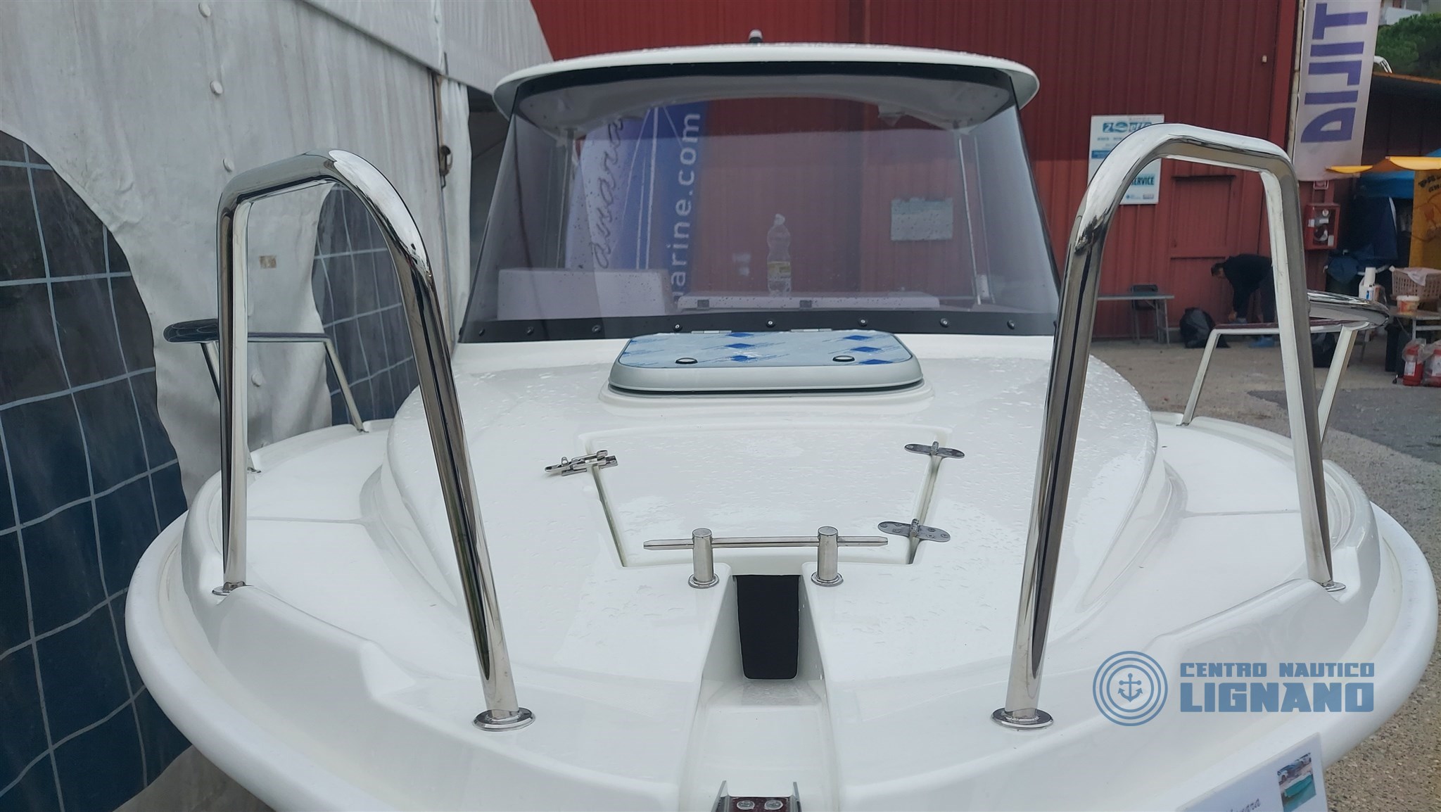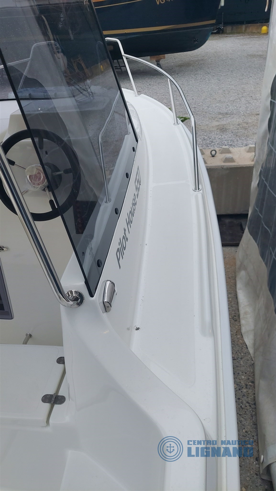 Anchor hatch and space for electric winch, Cabin access door, Plexygass windshield, N°3 Bollards, Central cockpit locker, Locker under driver's seat, Navigation lights, Battery space, Cabin access door, Stern ventilation grille, Steering wheel and steering box, Chemical or marine toilet accommodation, Live tank, Swim ladder.