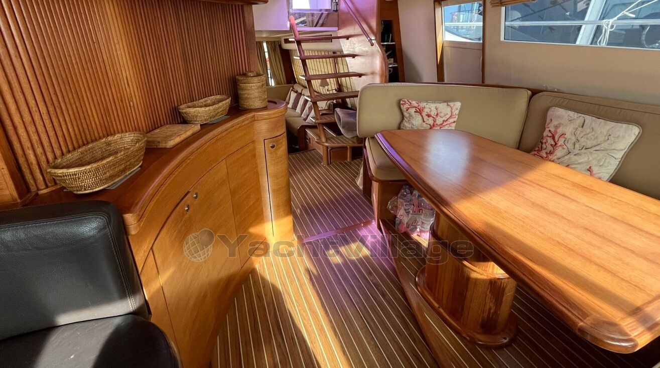 Inside, the yacht accommodates up to 8 guests in 4 comfortable cabins: an owner’s cabin located aft with its own private bathroom, a VIP cabin forward, and two guest cabins with twin beds. The bright main saloon, connected to the cockpit, offers both a relaxing lounge area and a dining space.
