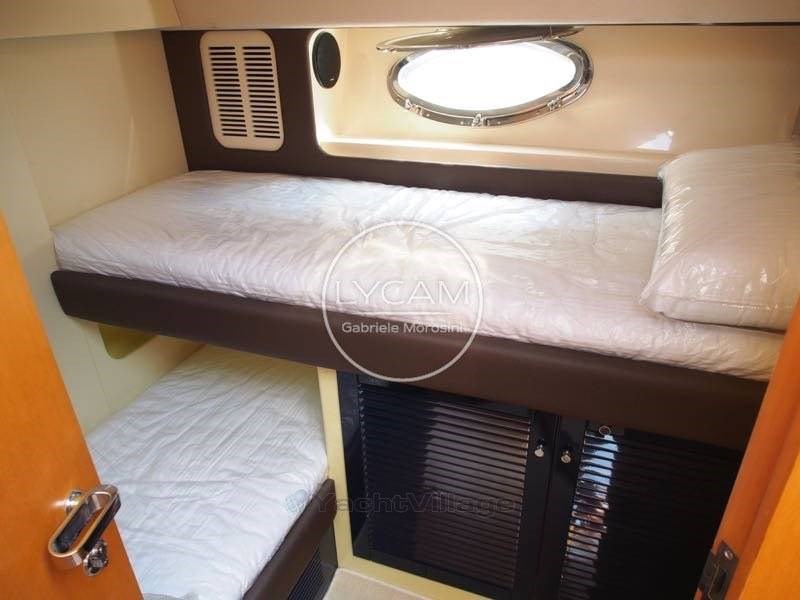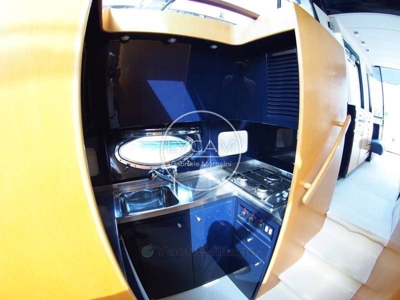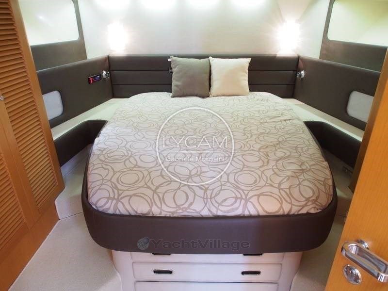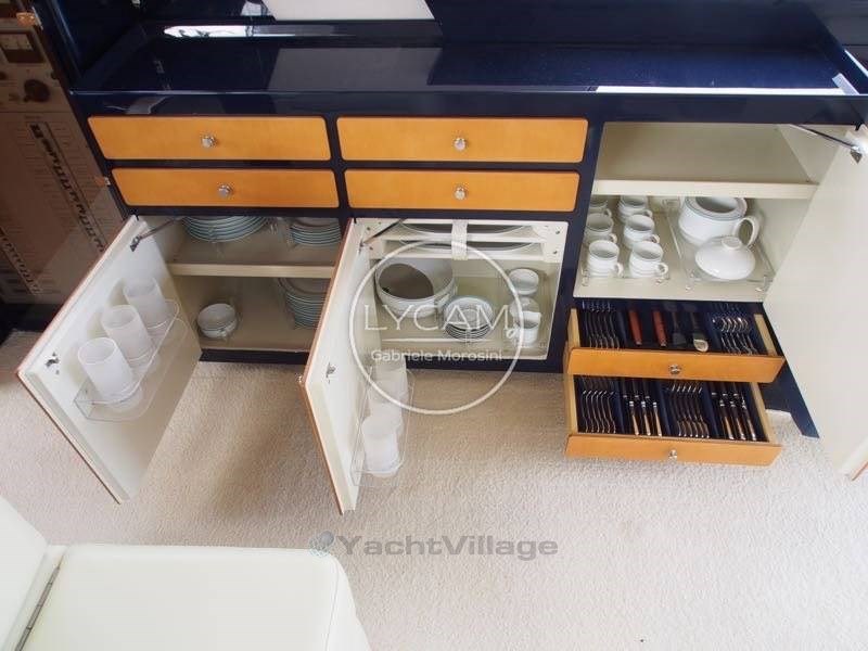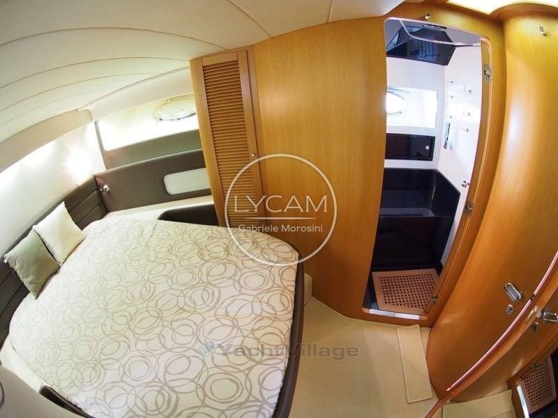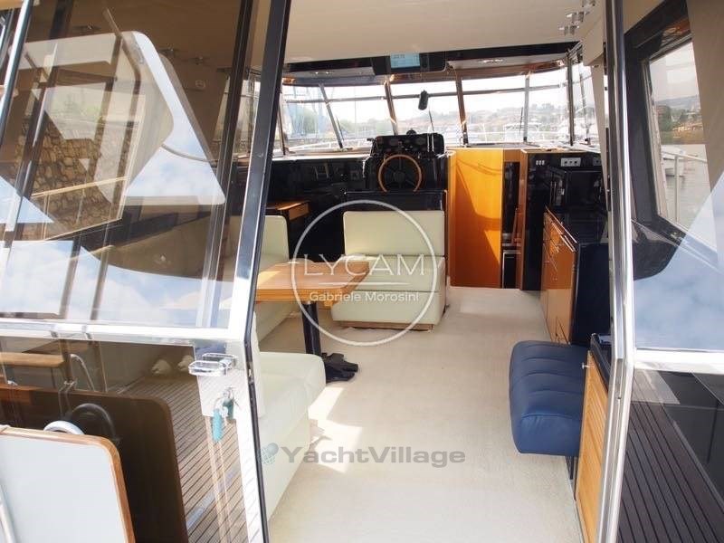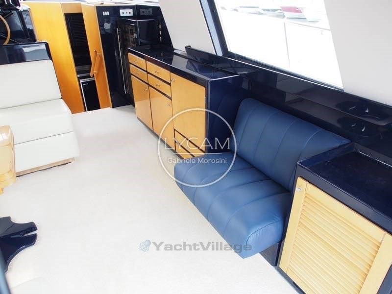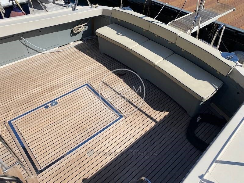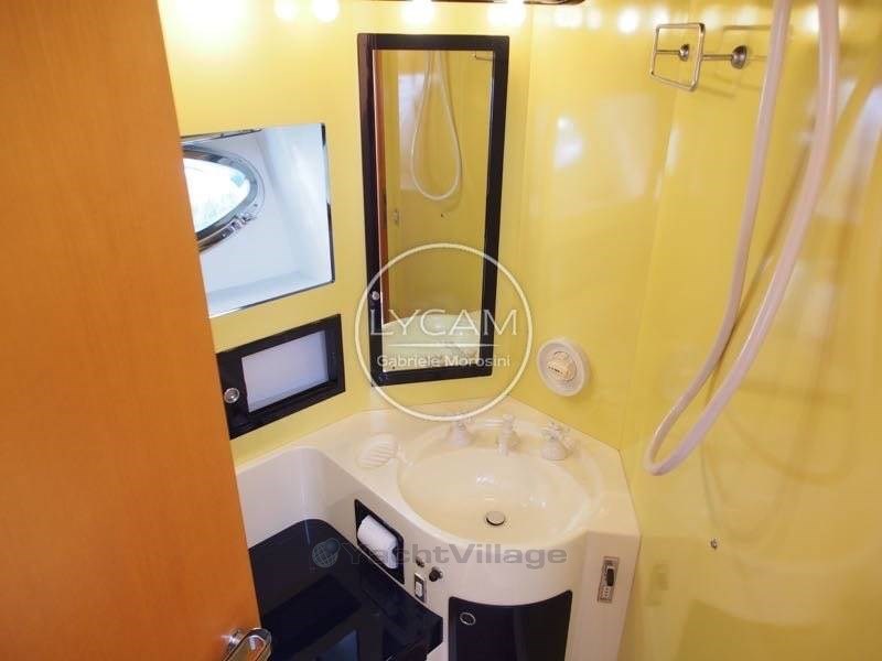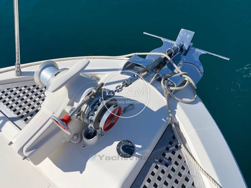 Debajo de la cubierta: comedor con puesto central de timón, zona de cartas náuticas, mesa de comedor, sofá que puede convertirse en cama. Cocina totalmente equipada. La cabaña principal está equipada con una cama doble y un baño privado con inodoro, bidé y ducha. La cabina de invitados tiene literas cruzadas con acceso privado a la ducha, que también sirve como baño de día.