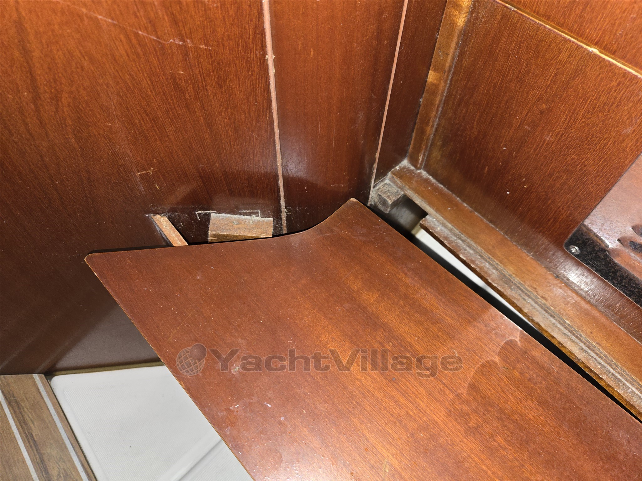 Avant de visiter le bateau, sachez qu'il y a quelques points à réparer : deux planches du plancher intérieur sont déformées, certains revêtements muraux sont à remplacer, il semble que de l'eau se soit infiltrée par un houblor, et certains couvercles de coffres ainsi que la table à cartes doivent être revissés.