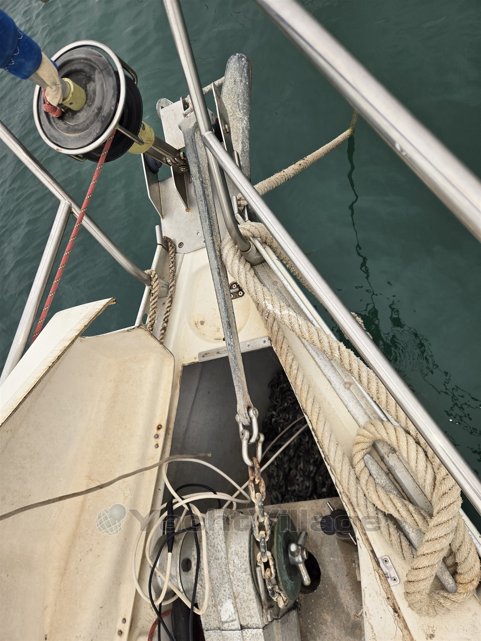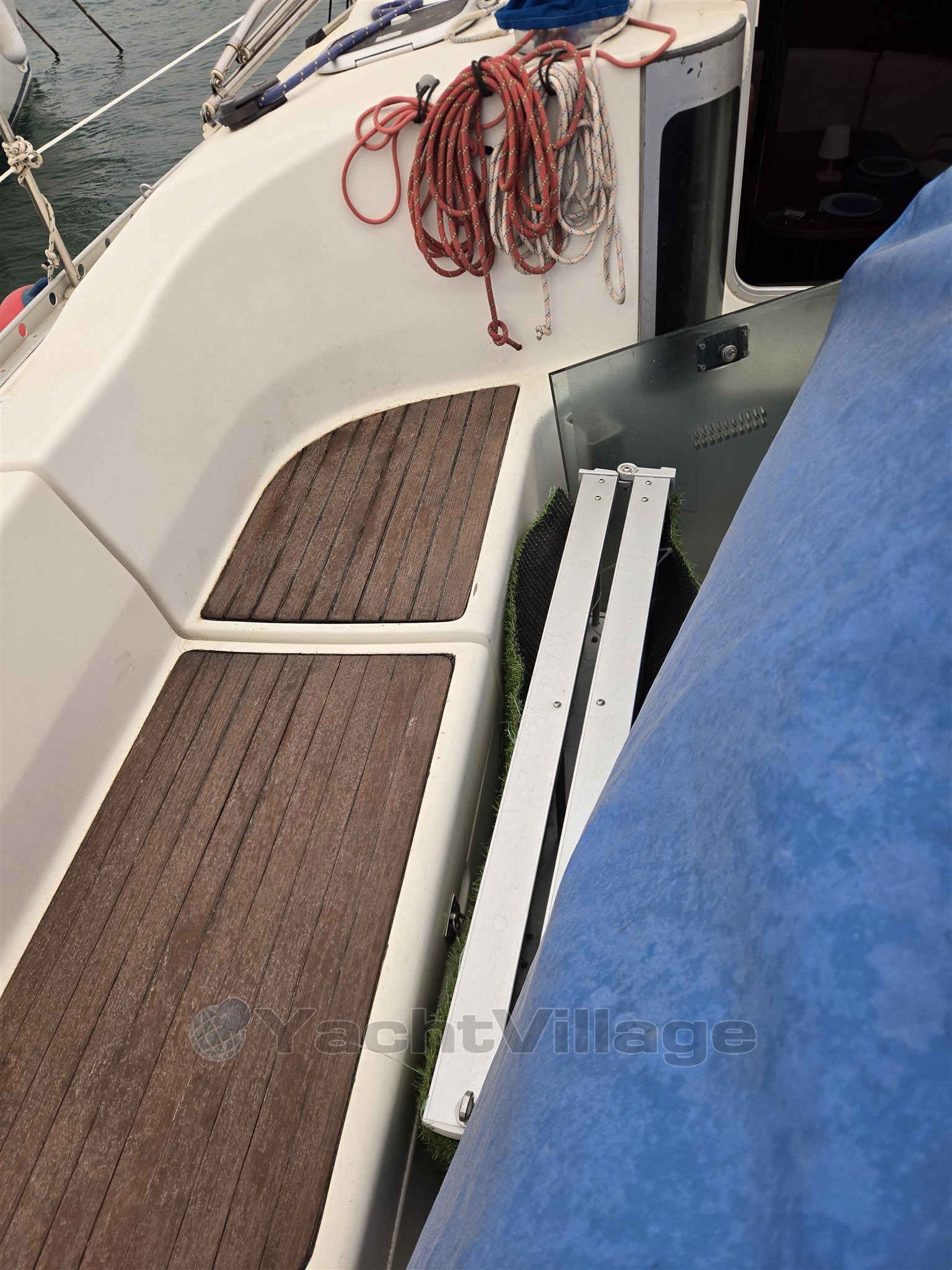Sur le pont, une partie de la poupe nécessite une réparation de la fibre de verre. Quelques drisses sont à remplacer. Les butées de pont doivent également être remplacées.