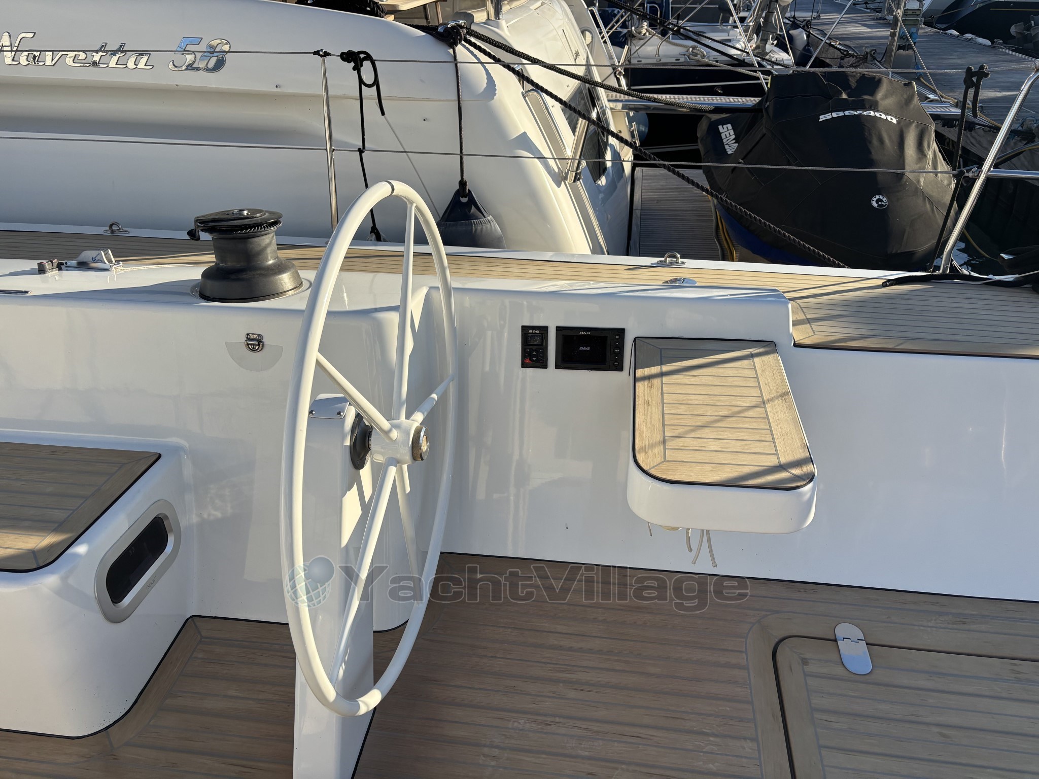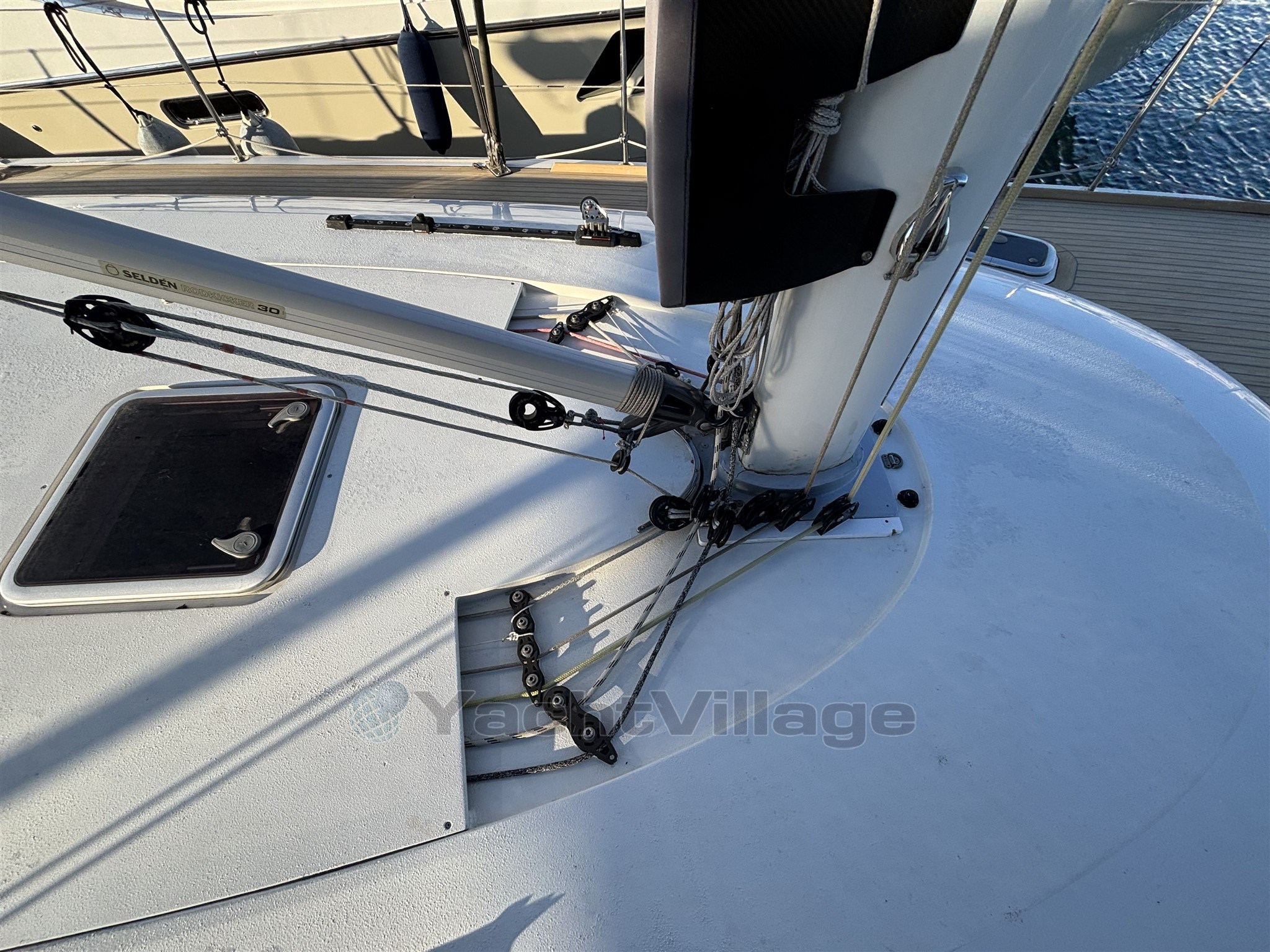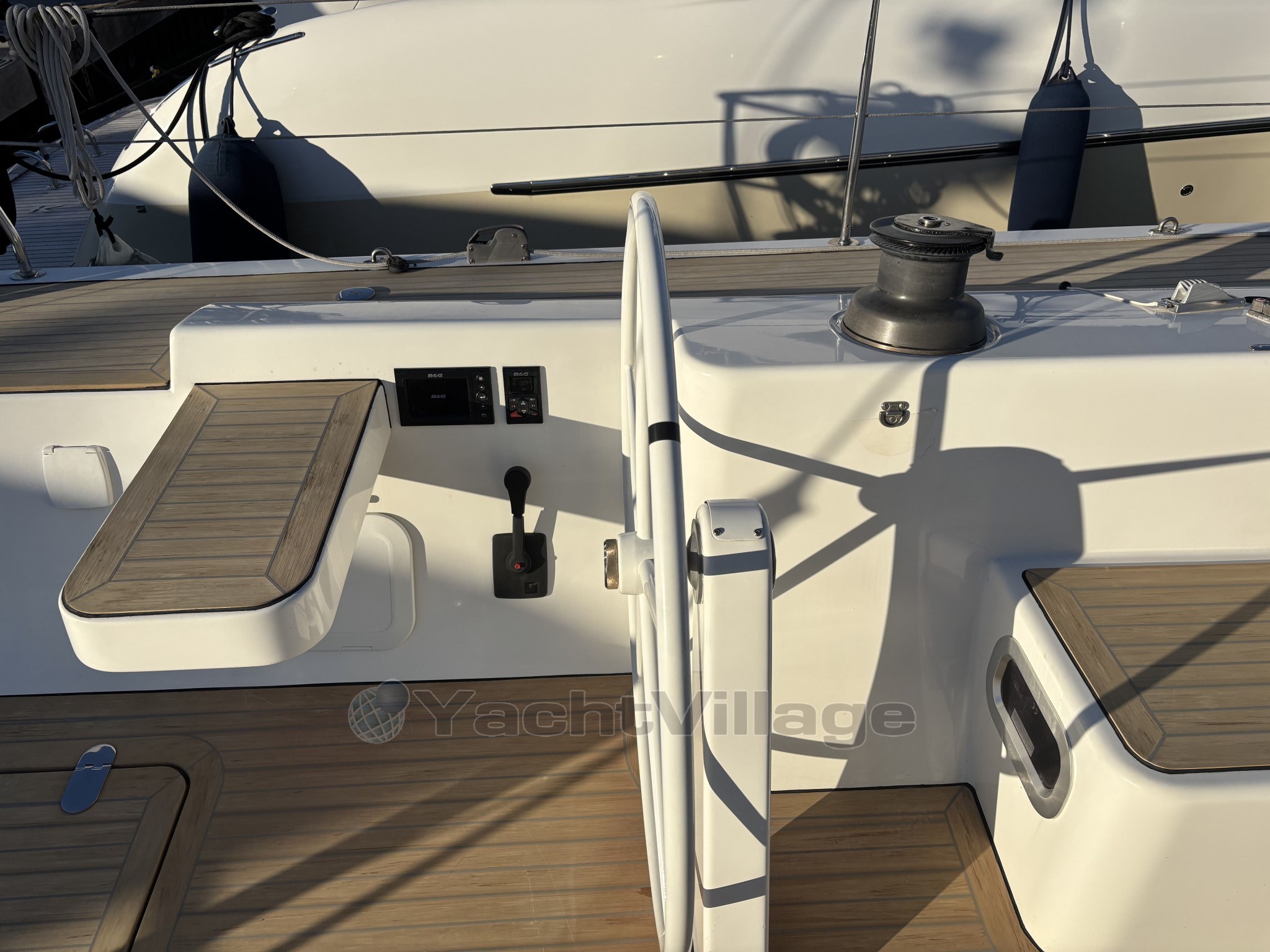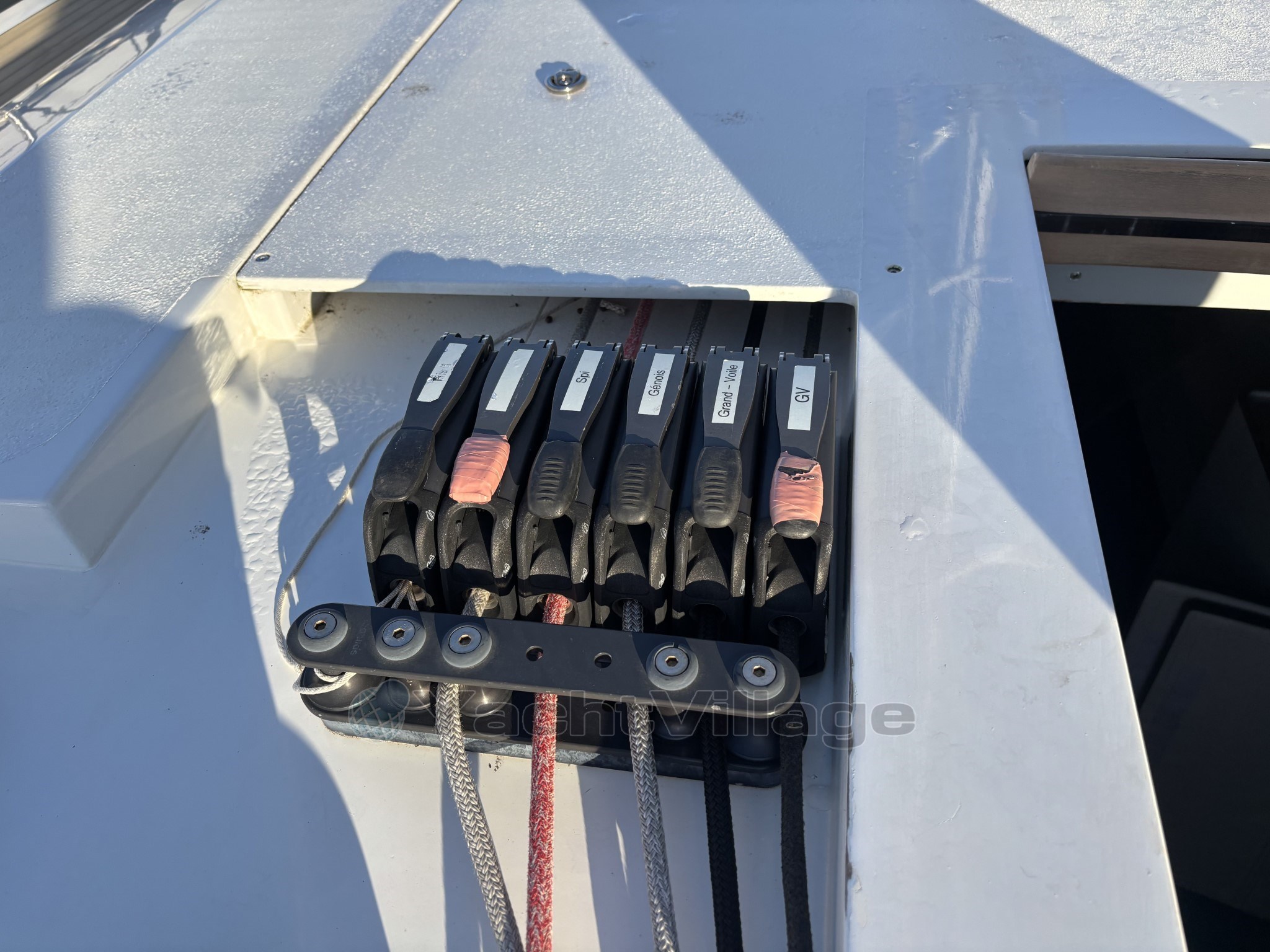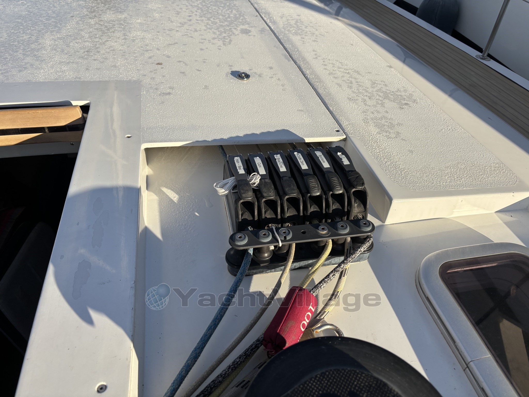 L’équipement de pont est haut de gamme : winch électrique, les autres winchs manuels racing, bout-dehors carbone, passerelle carbone, table de cockpit carbone, deux grands coffres arrière, cockpit sécurisé et ergonomique. Le taud de soleil au mouillage apporte un vrai confort en croisière.
