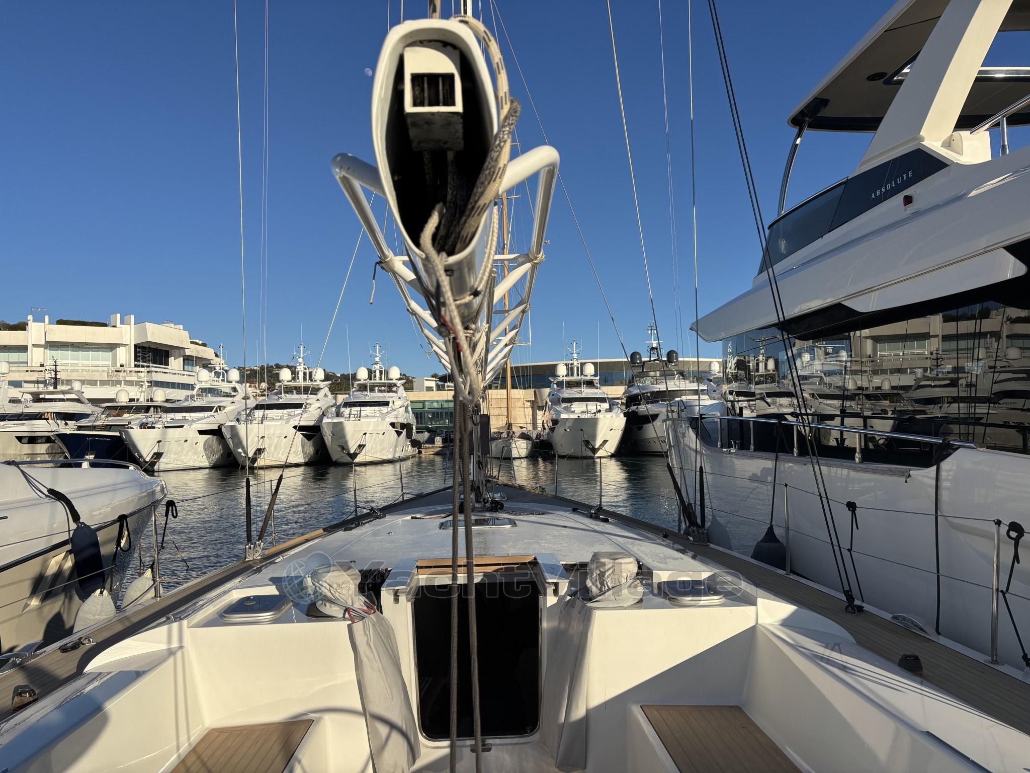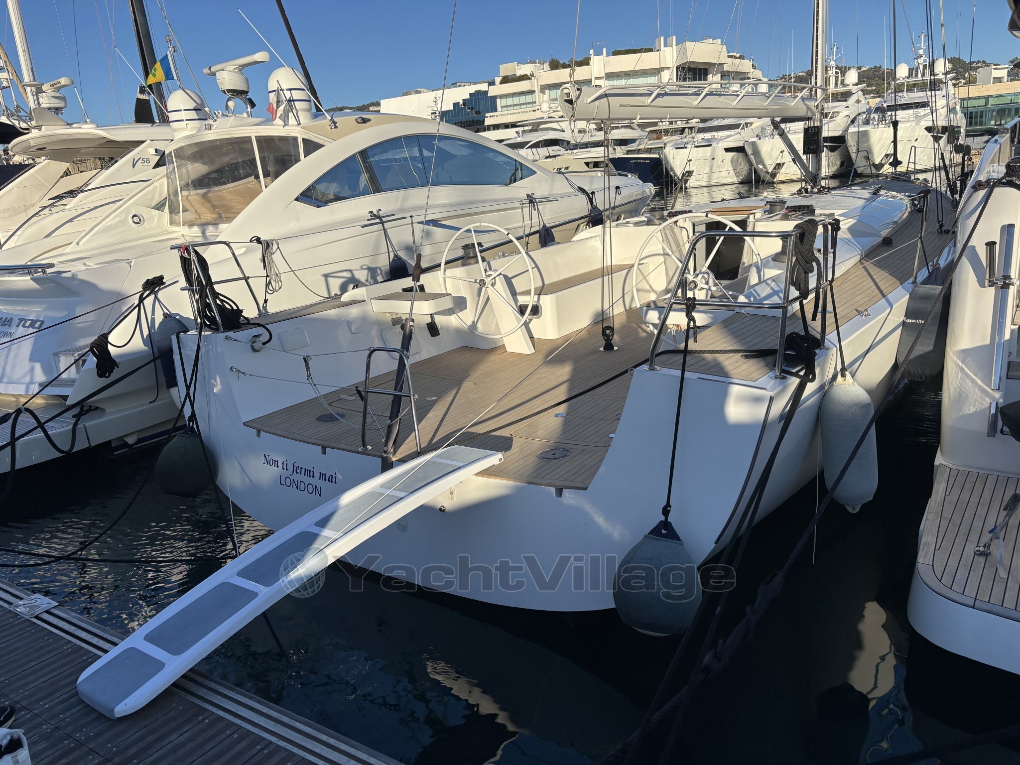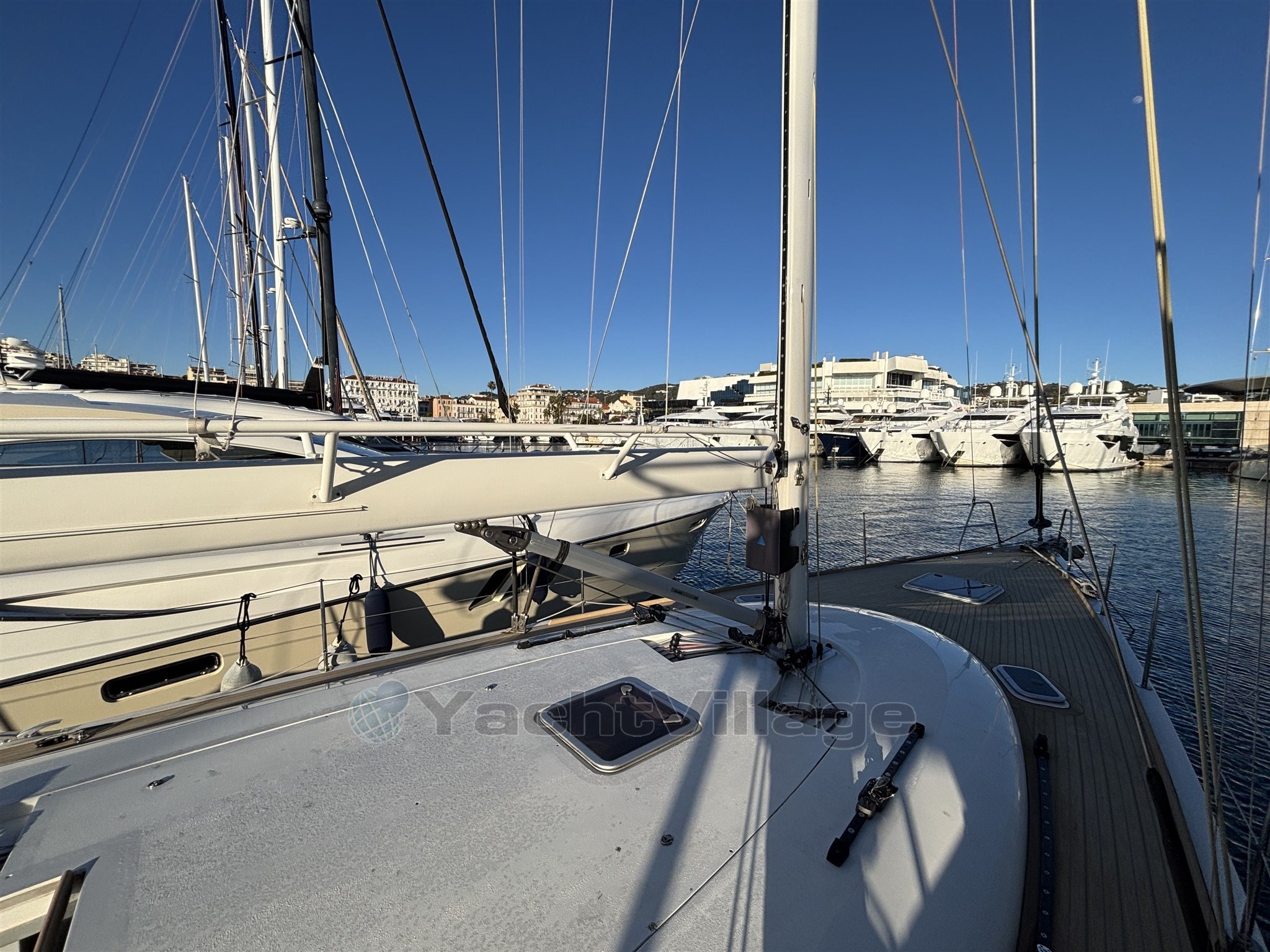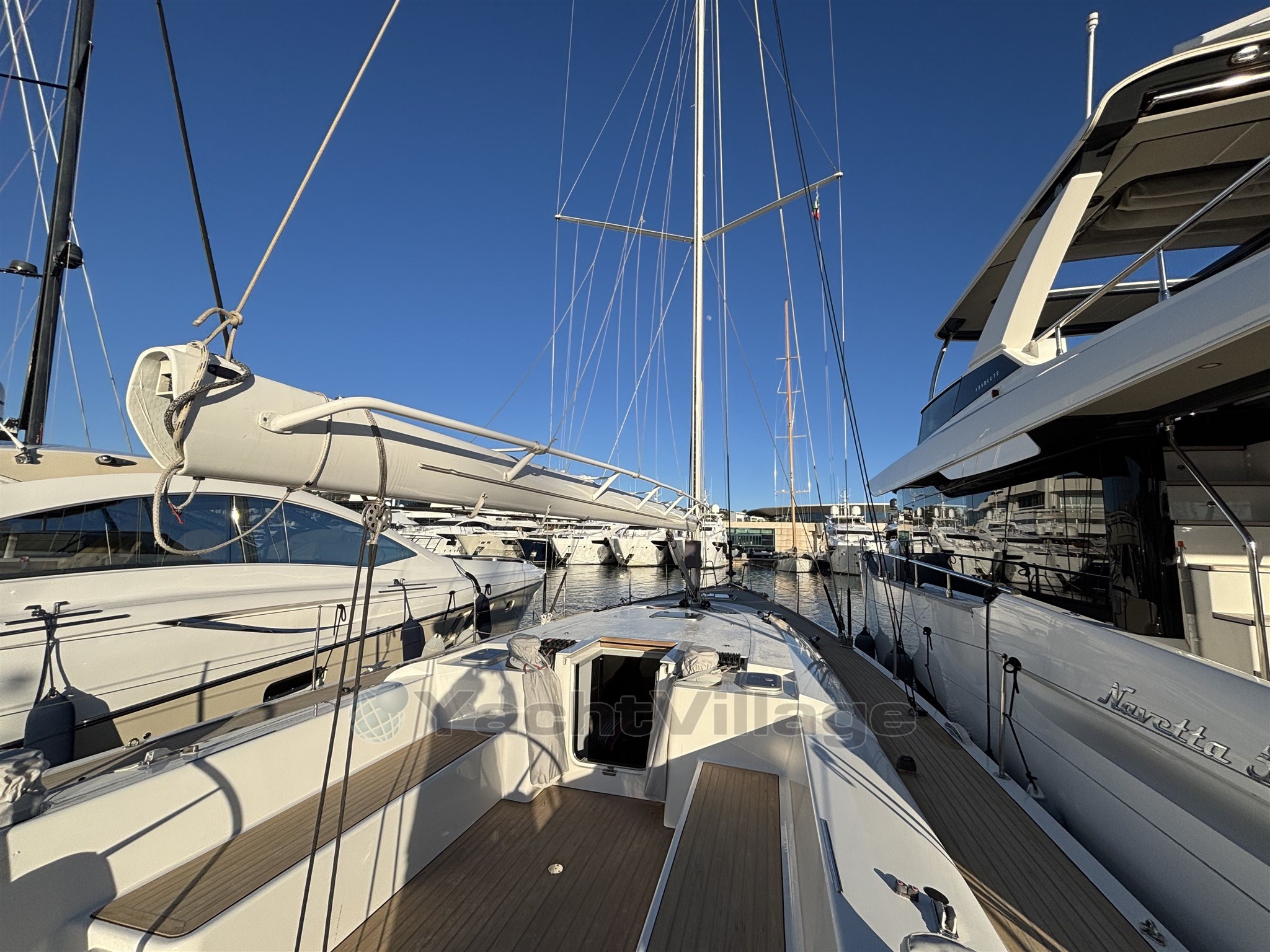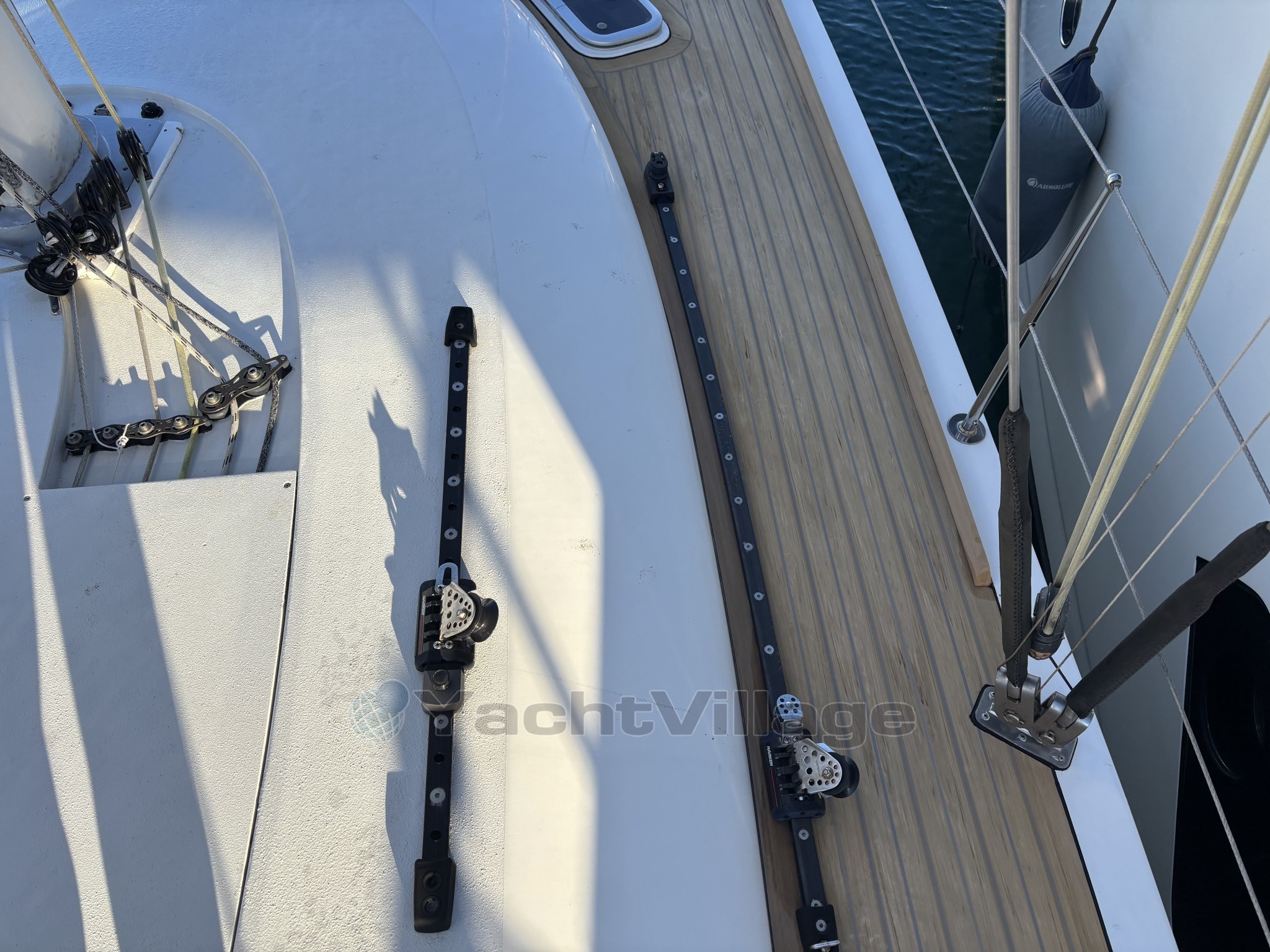 L’équipement de pont est haut de gamme : winch électrique, les autres winchs manuels racing, bout-dehors carbone, passerelle carbone, table de cockpit carbone, deux grands coffres arrière, cockpit sécurisé et ergonomique. Le taud de soleil au mouillage apporte un vrai confort en croisière.