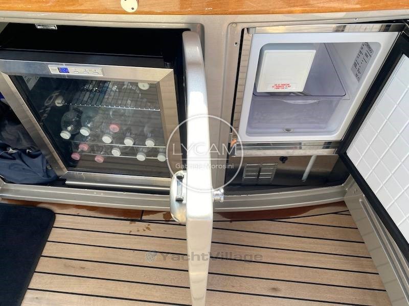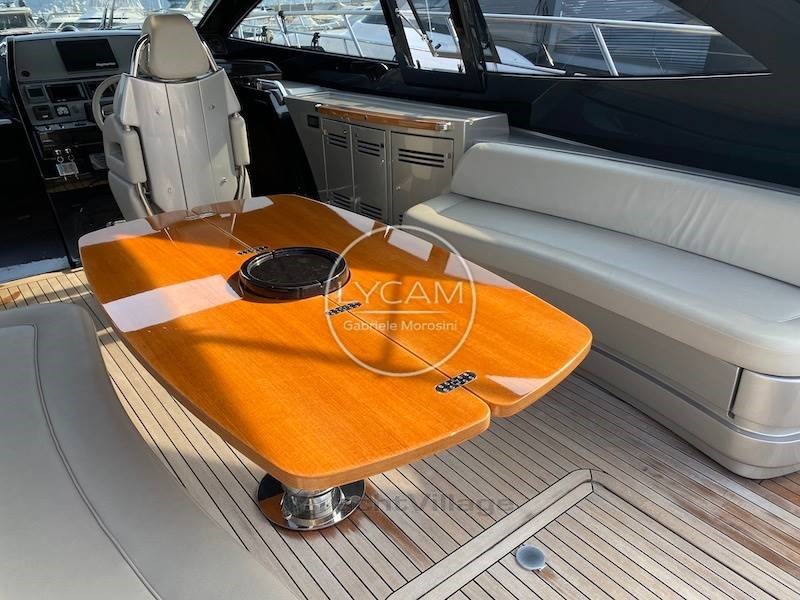 Terraza: gran comedor con sofás y mesa de comedor, a los laterales con armarios de barra equipados con fregadero, nevera; Hielo; bodega; estación central de pilotos; Cubierta de proa y proa para el sol.