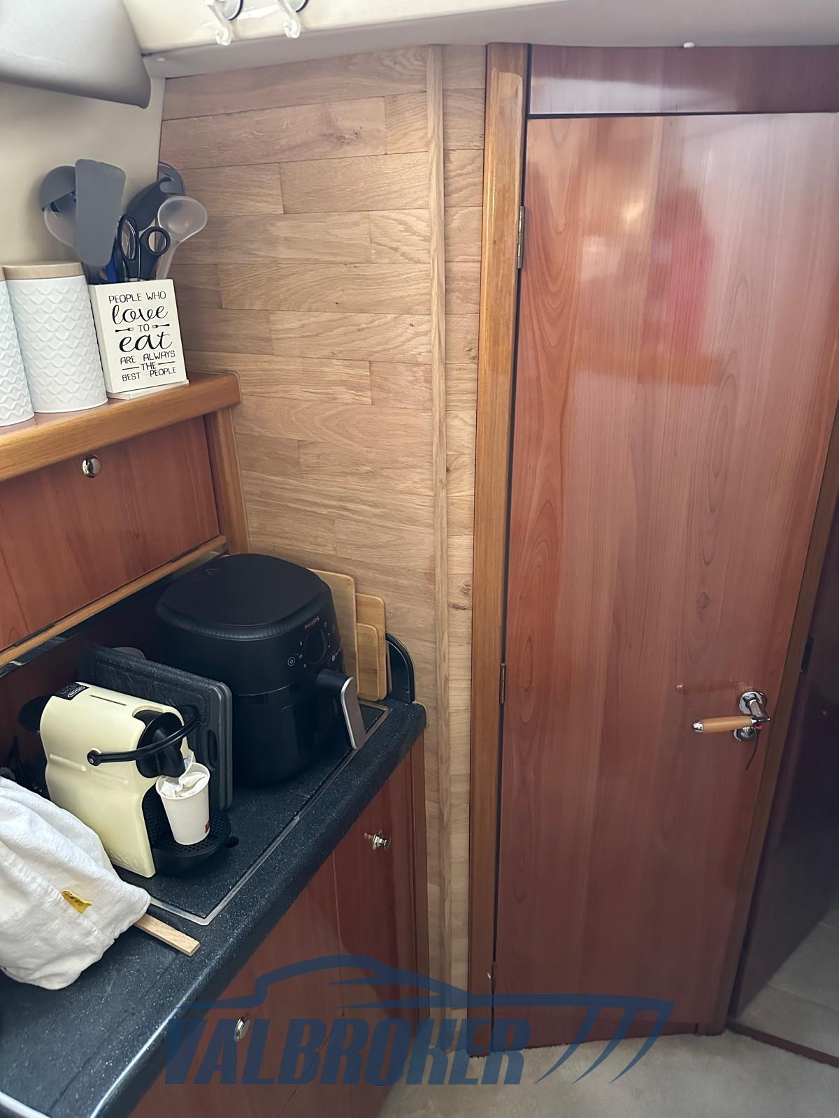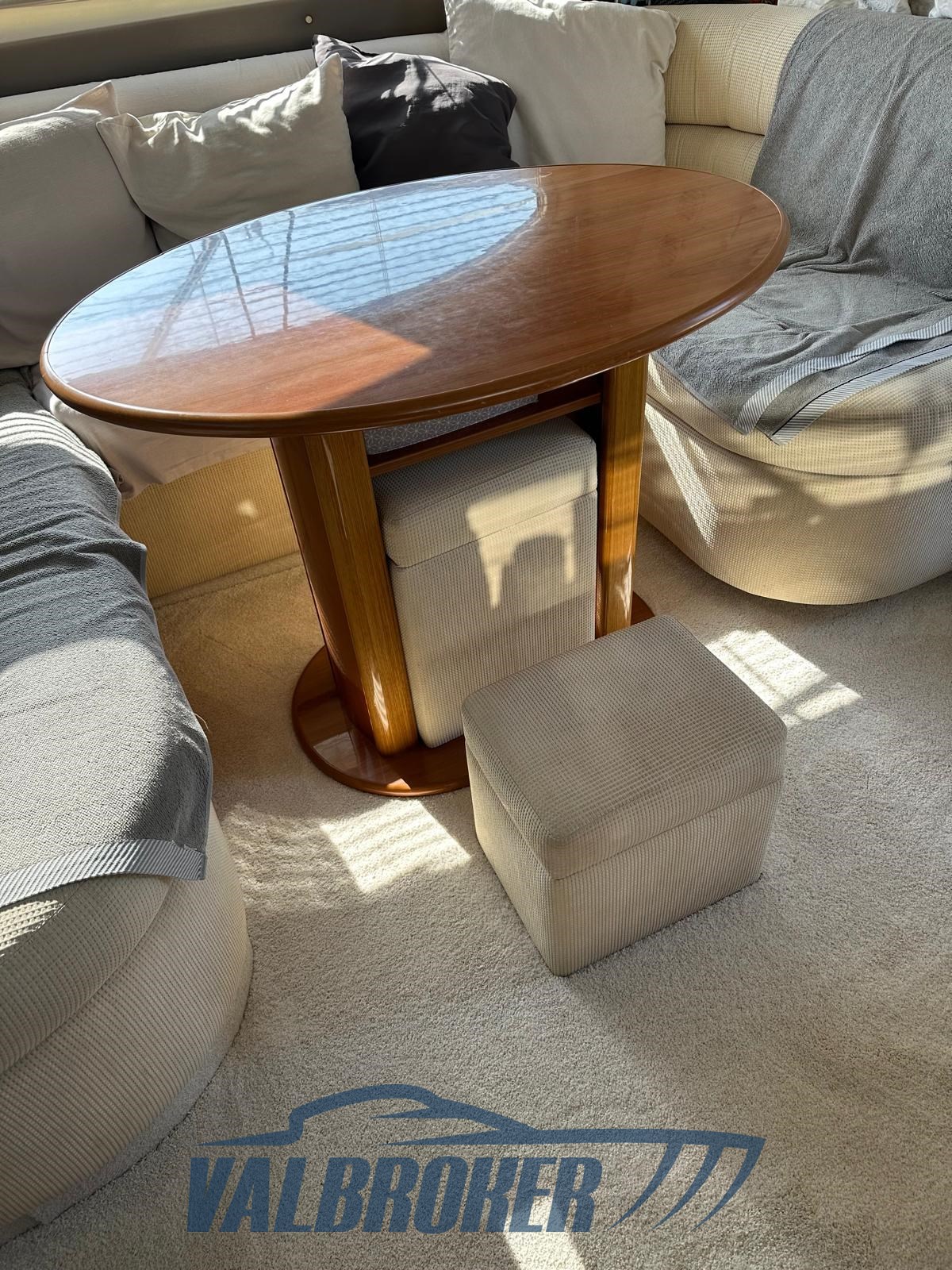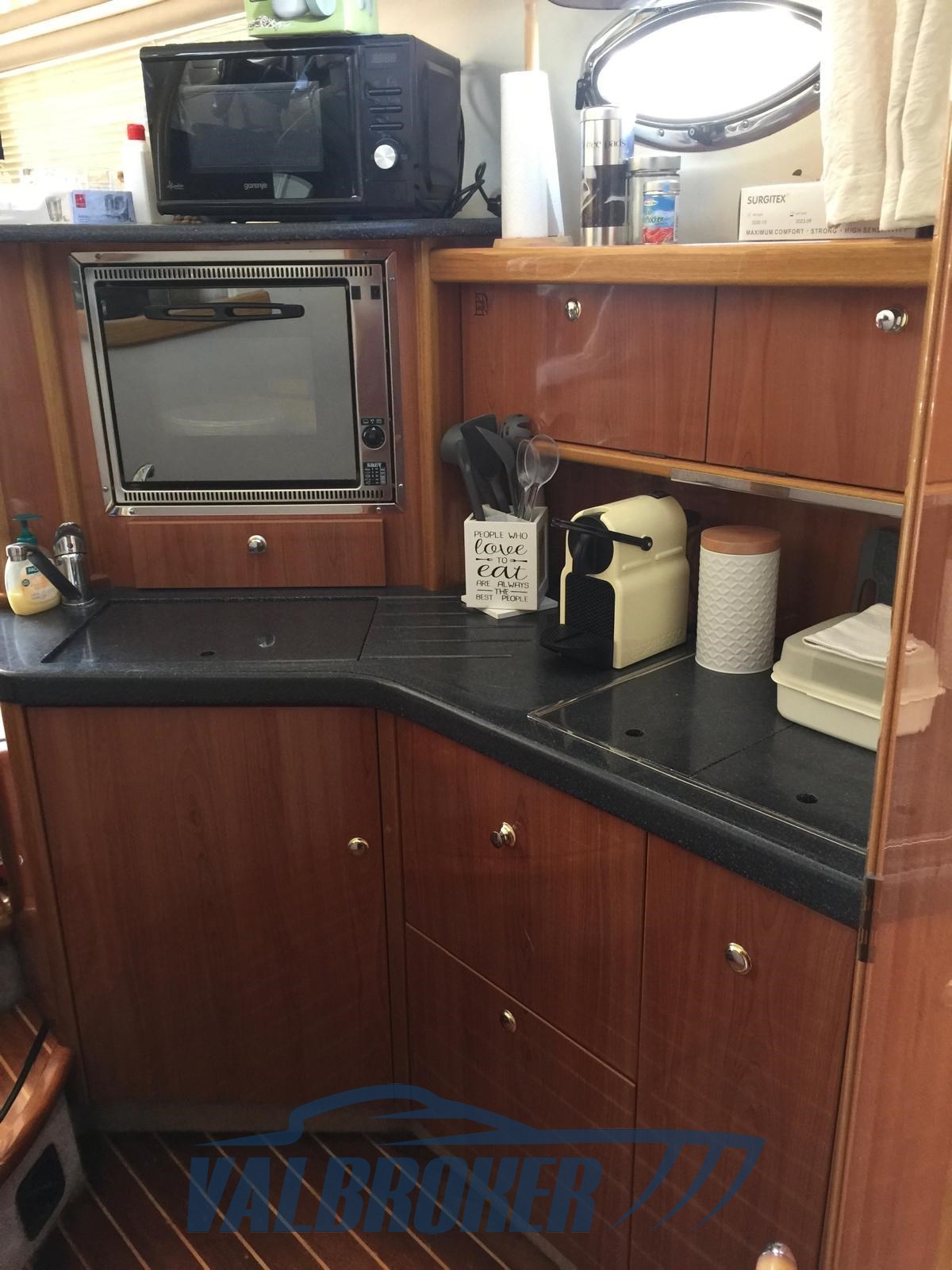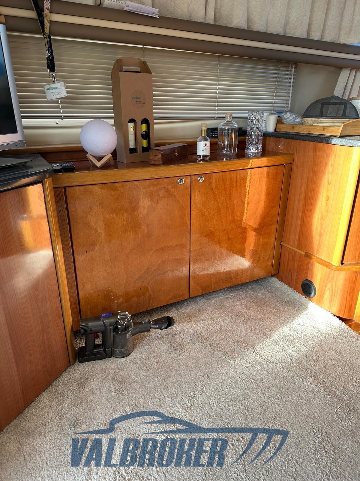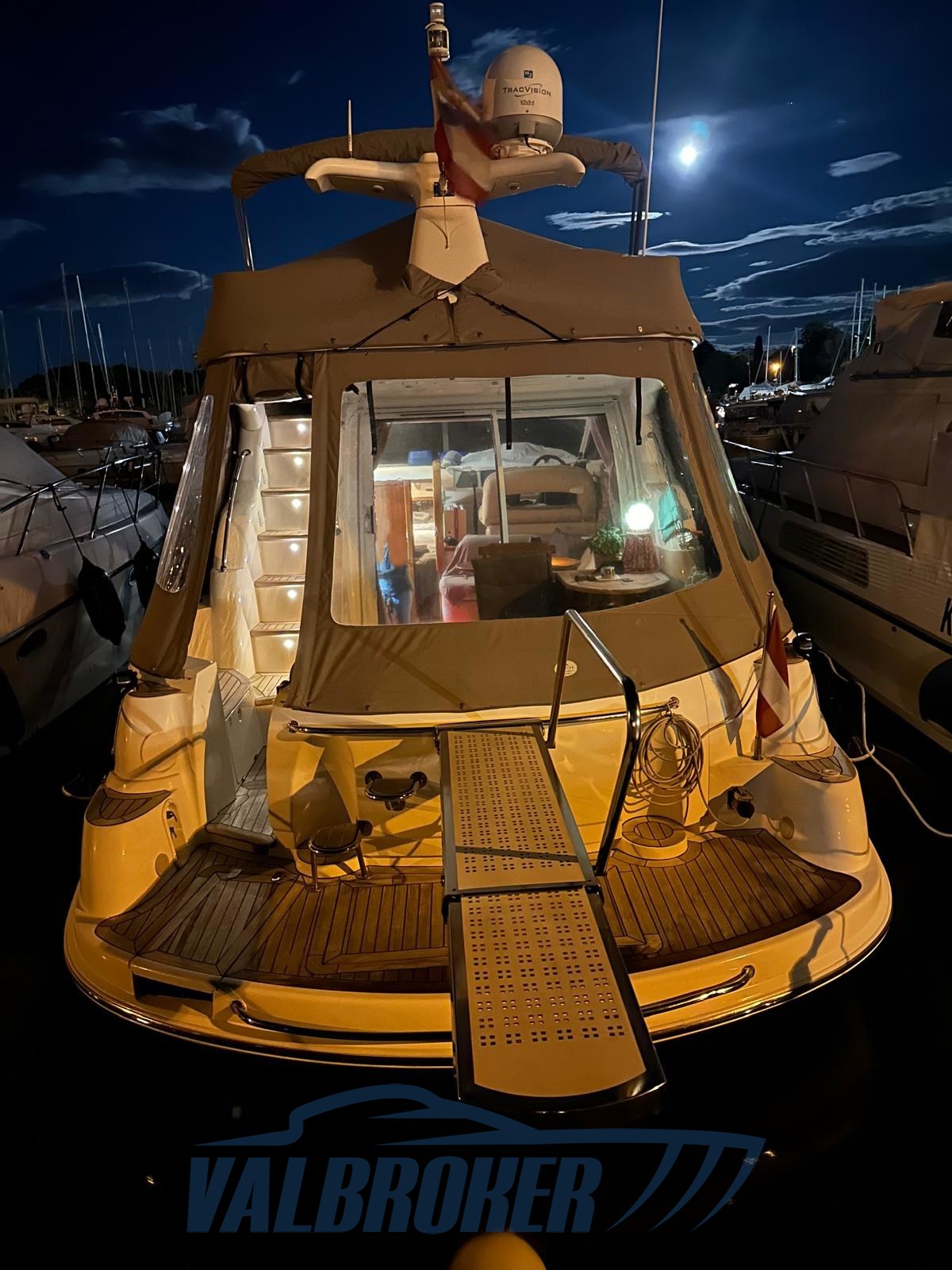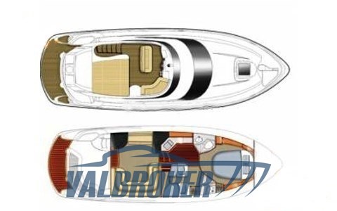 Bajo cubierta hay dos camarotes: una cabina de propietario en la proa y una camarote de invitados con camas en el suelo, comedor descapotable y un baño. Totalmente opcional: radar, propulsor de proa, calefacción, pasarela hidráulica, antena de televisión por satélite.