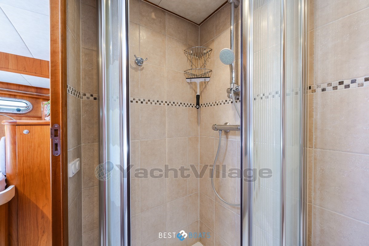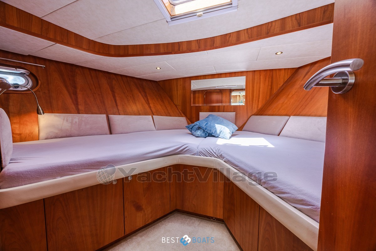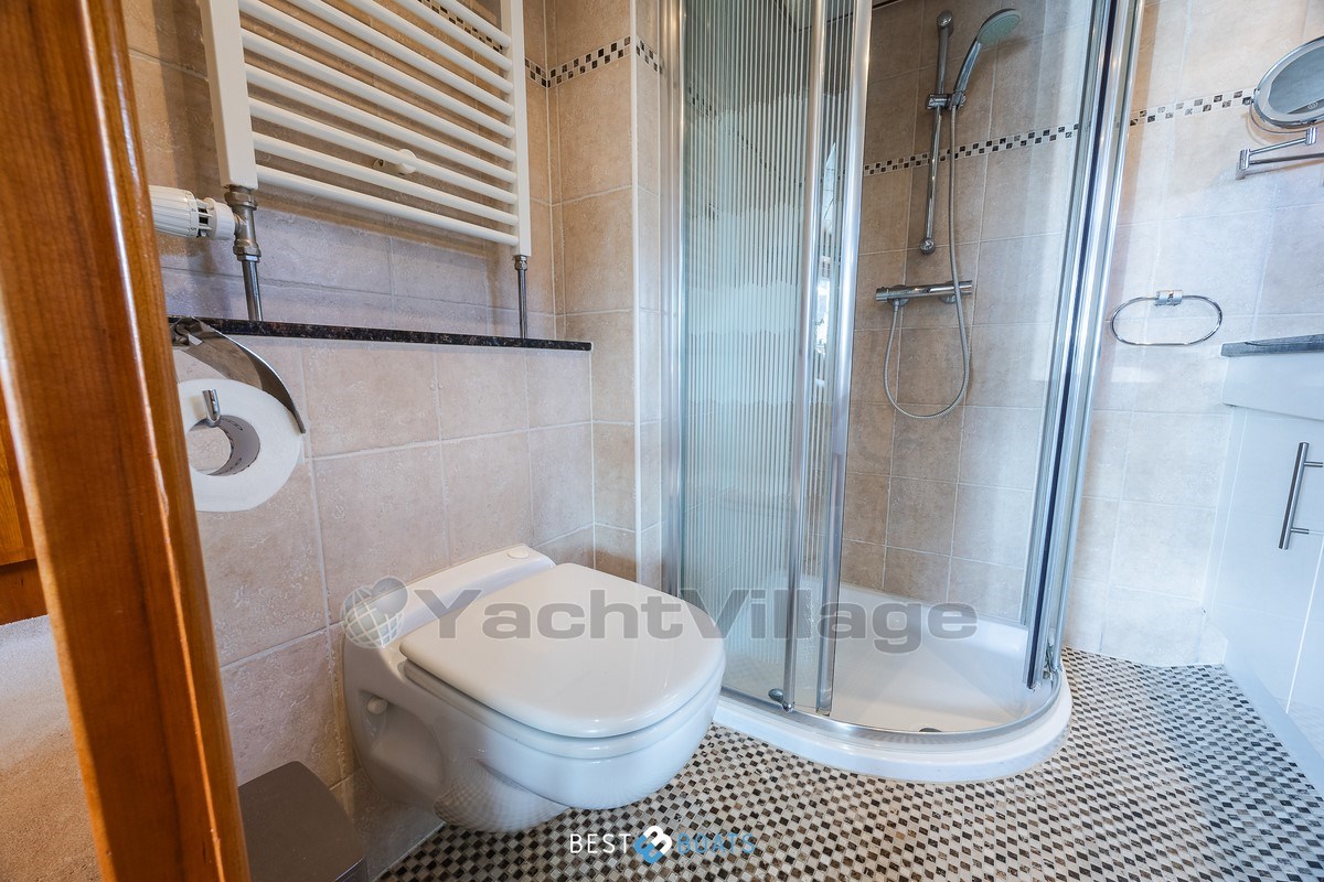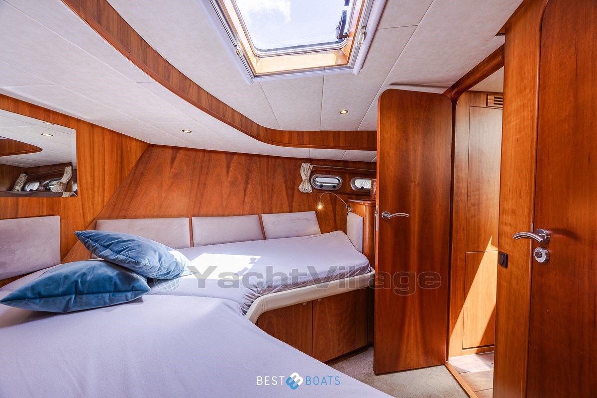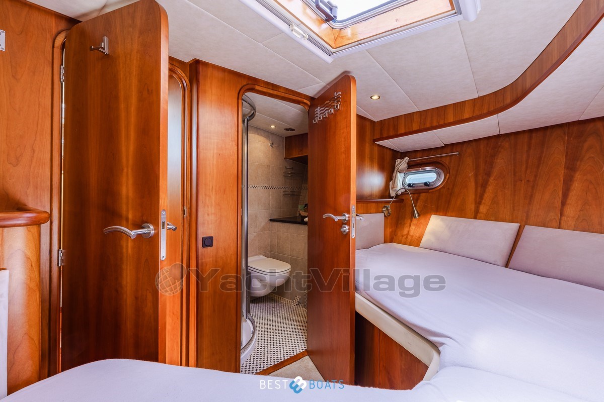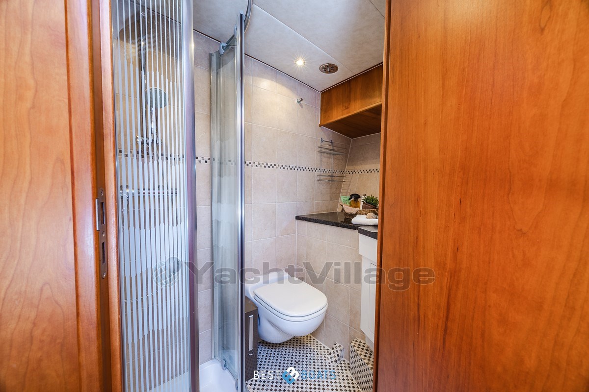 Inside, the warm interior stands out, with cherry wood, beige leather upholstery and a light, inviting atmosphere. There are two spacious cabins: an owner's cabin with a freestanding double bed and a guest cabin with a comfortable V-shaped bed. Two bathrooms with shower provide extra comfort on longer journeys.