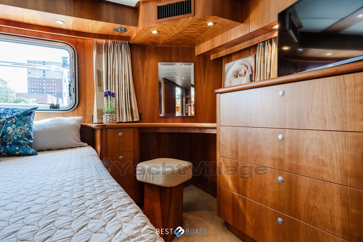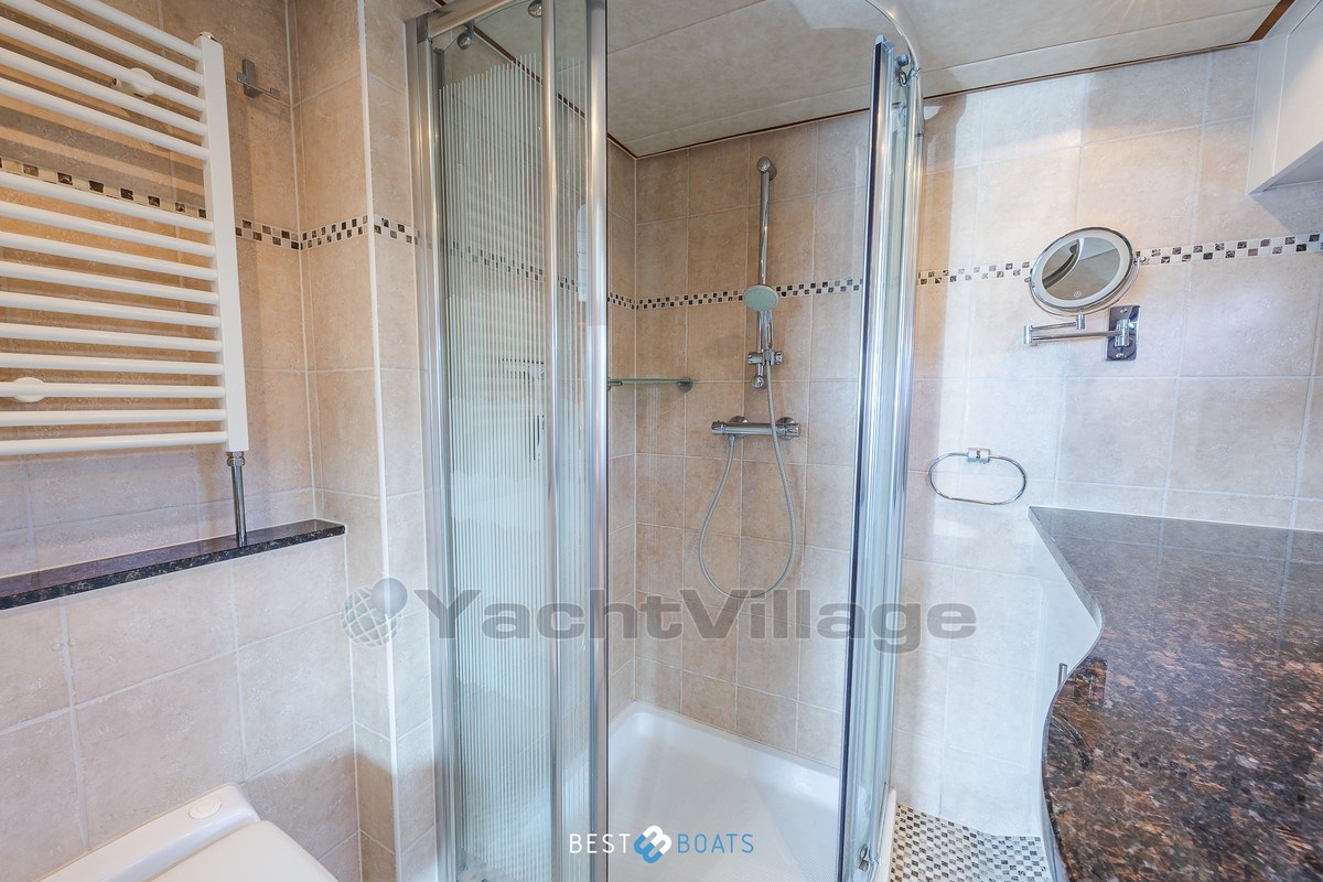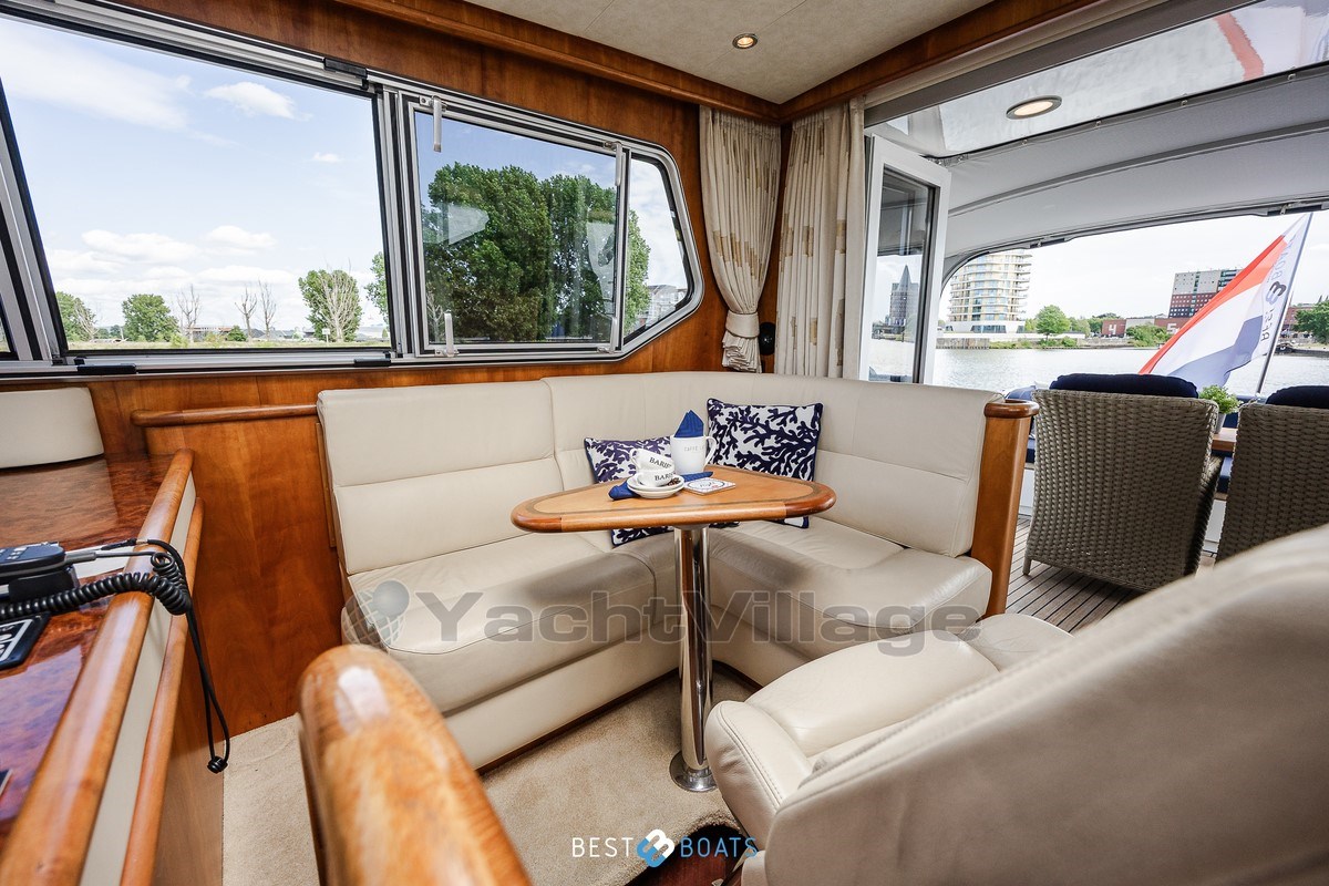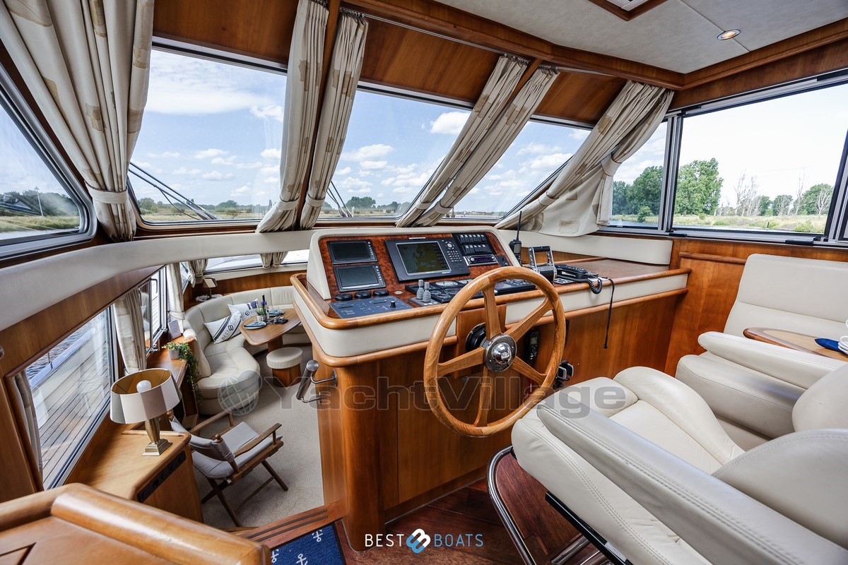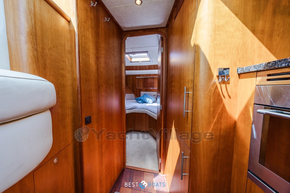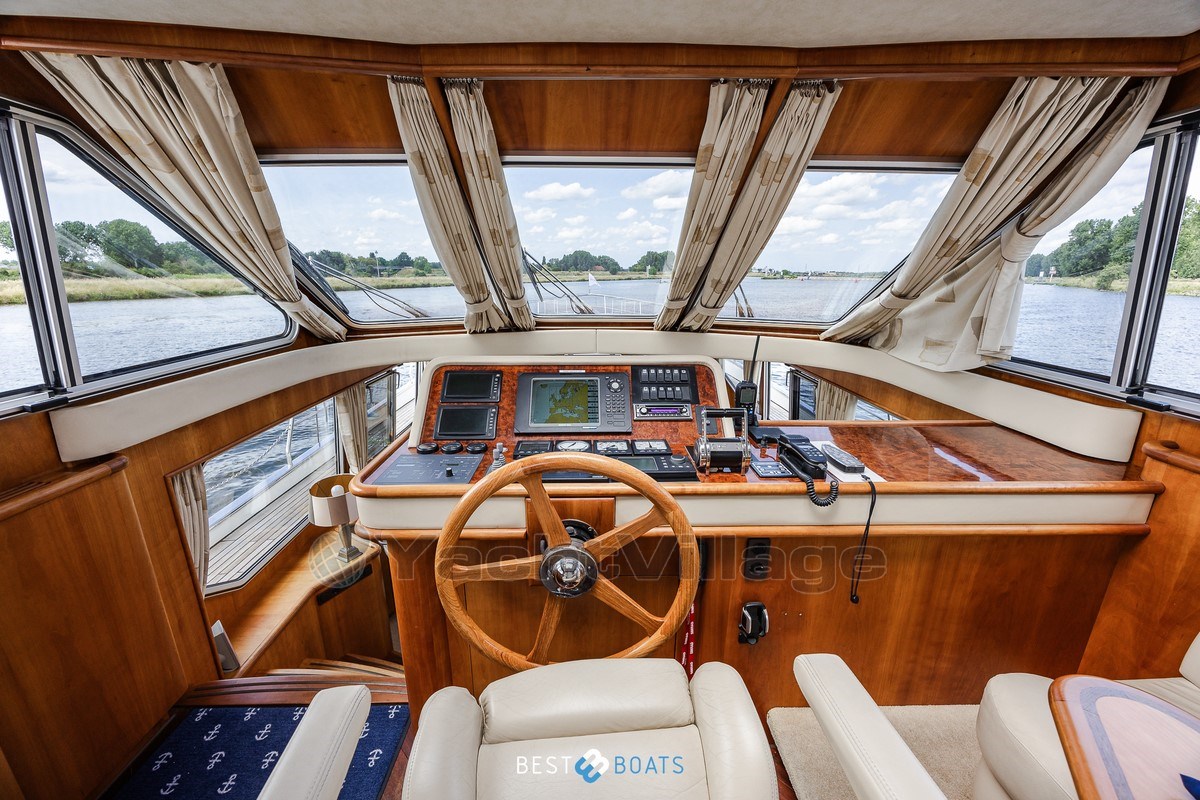 Inside, the warm interior stands out, with cherry wood, beige leather upholstery and a light, inviting atmosphere. There are two spacious cabins: an owner's cabin with a freestanding double bed and a guest cabin with a comfortable V-shaped bed. Two bathrooms with shower provide extra comfort on longer journeys.