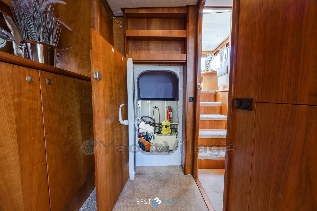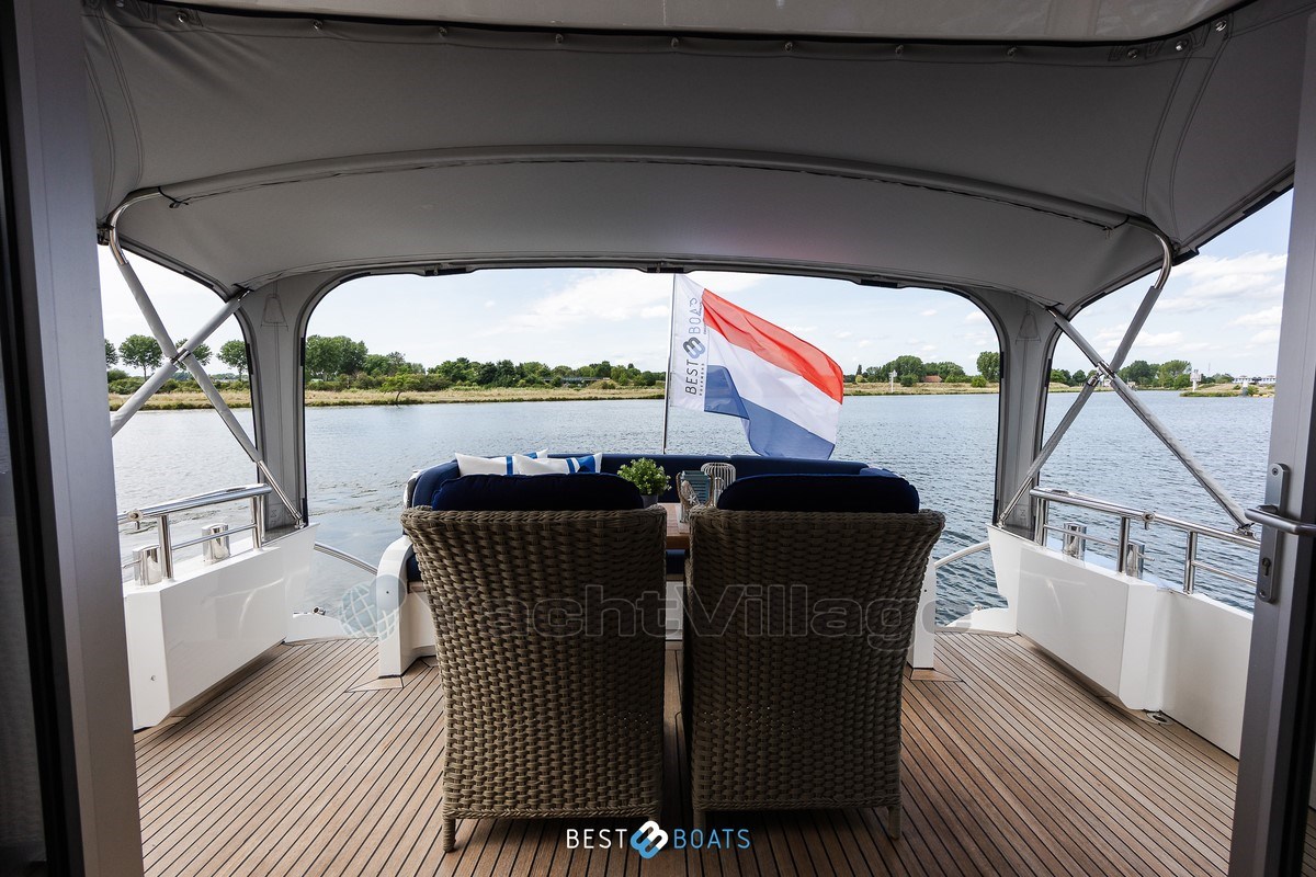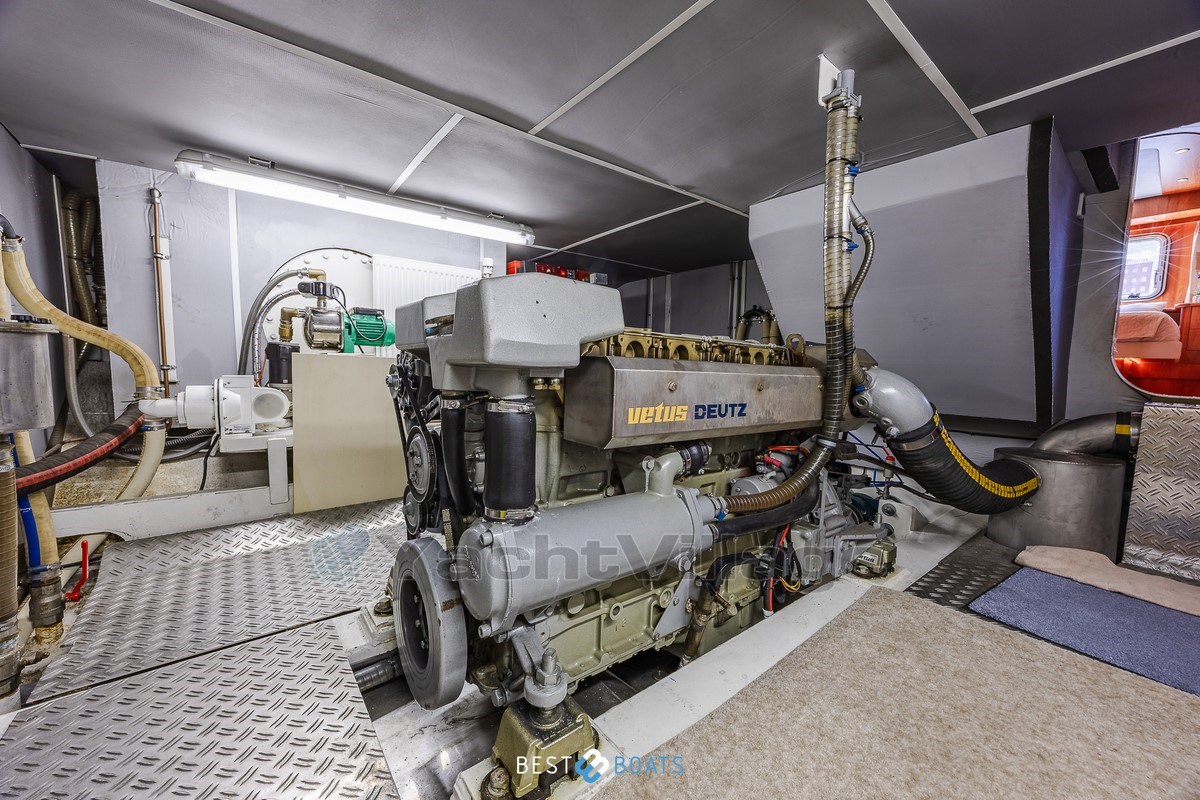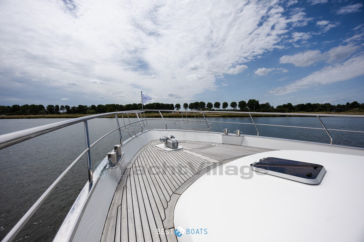 With a powerful 231 hp Vetus Deutz engine, hydraulic steering in the wheelhouse, and an RMC wireless remote control for bow and stern thrusters, this ship is very maneuverable. Safety and convenience are paramount with a full stainless steel sea railing all around, boarding on both sides, and a teak swimming platform and atmospheric lighting in the spiral staircases.