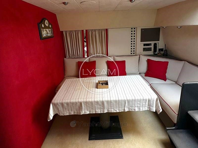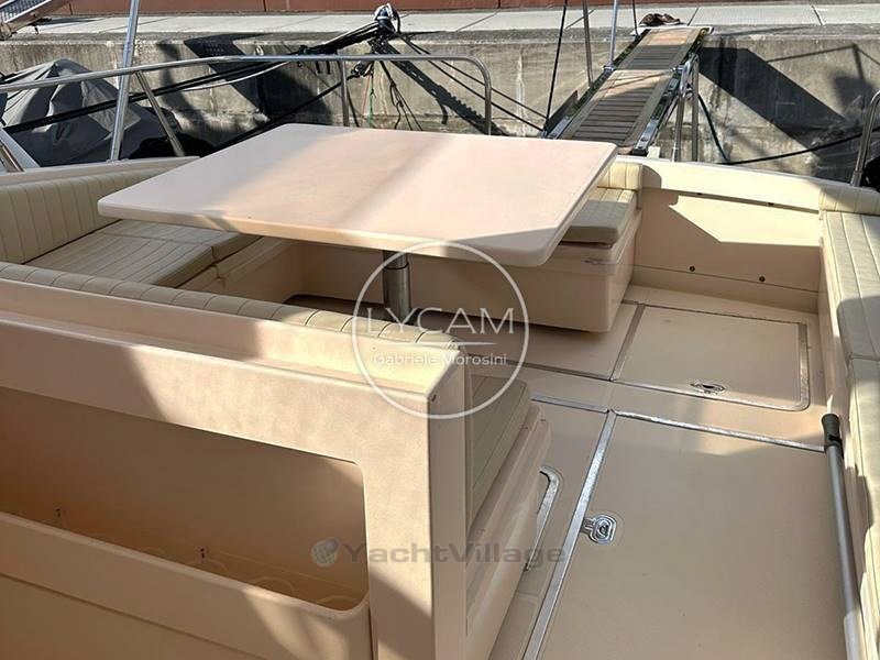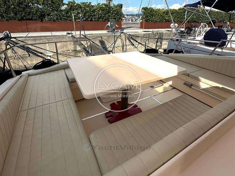 Cubierta: cabina con sofá en forma de U y mesa de comedor eléctrica que puede convertirse en terraza solar; barra húmeda con frigorífico y fregadero; asiento del piloto y del pasajero; Cubierta de Sol de Proa