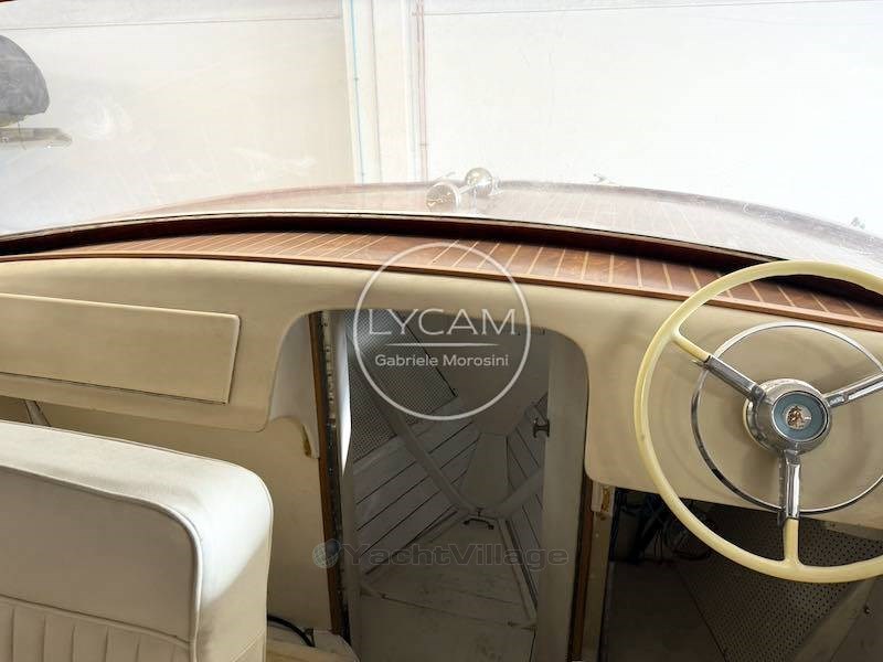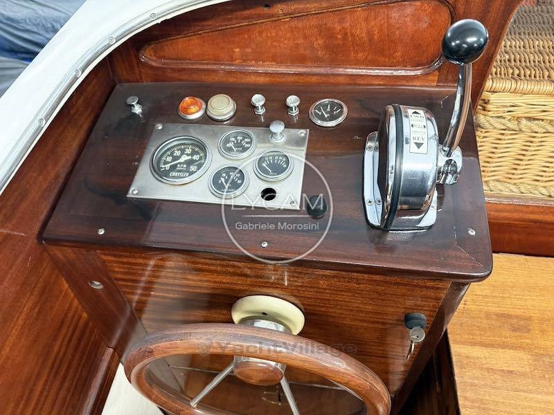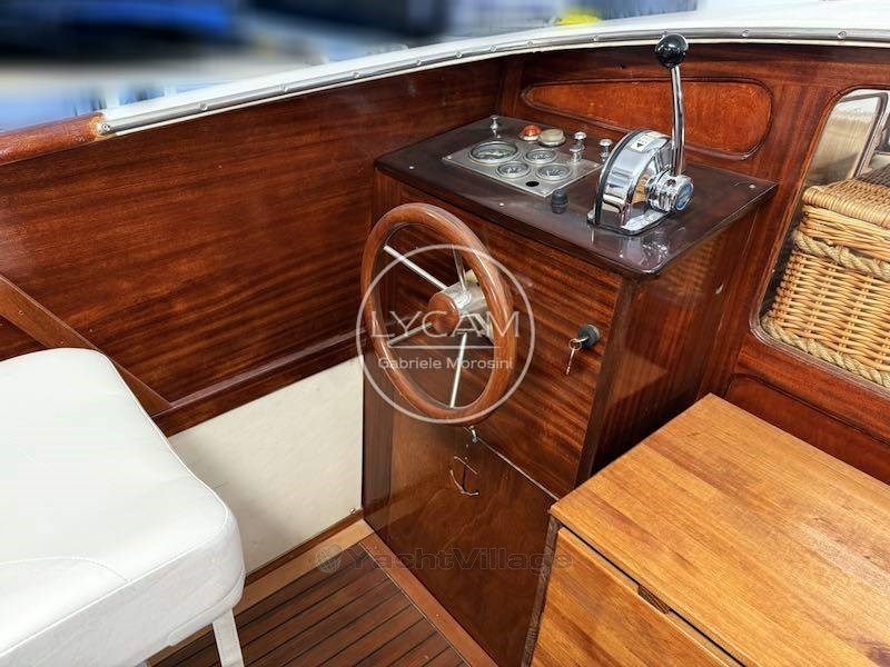 Rueda de timón de madera; Acelerador del motor; Indicadores del motor (nivel de combustible, revoluciones del motor, amperímetro, presión de aceite, indicador de temperatura del agua); Rueda interior del timón