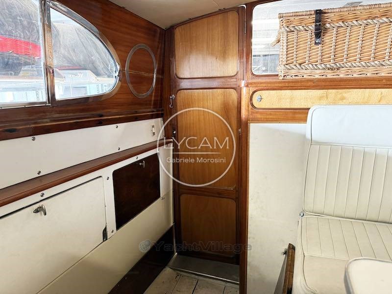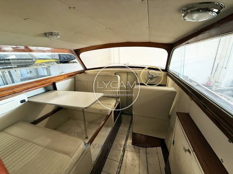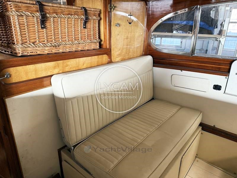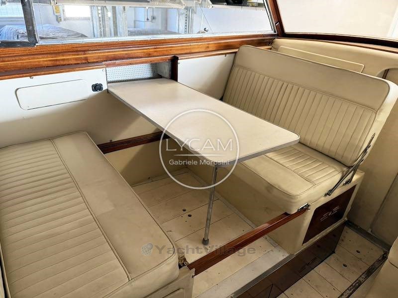 En el interior, por el lado de babor, está el comedor con mesa y asientos enfrente. En el lado opuesto está la cabina interna de timón mientras, avanzando hacia puro, desciendes más dentro de una pequeña cabina.
